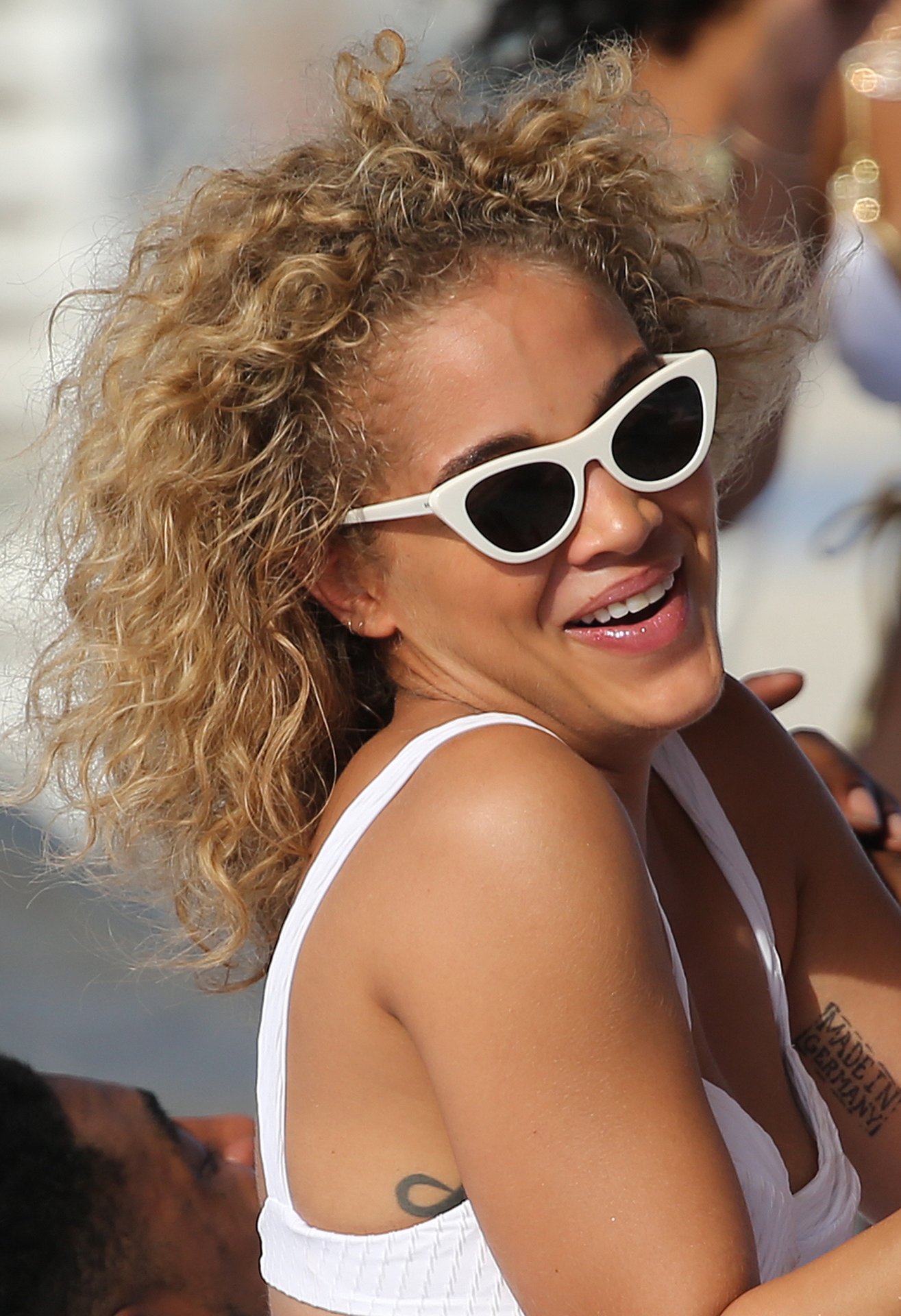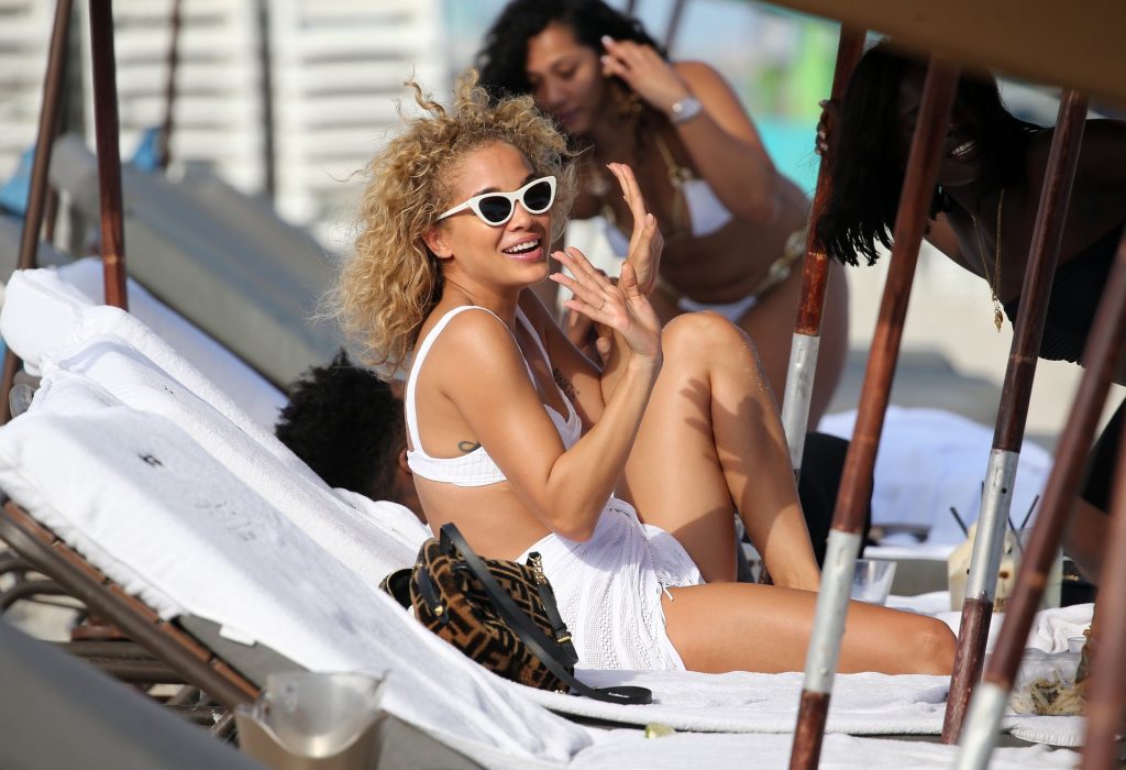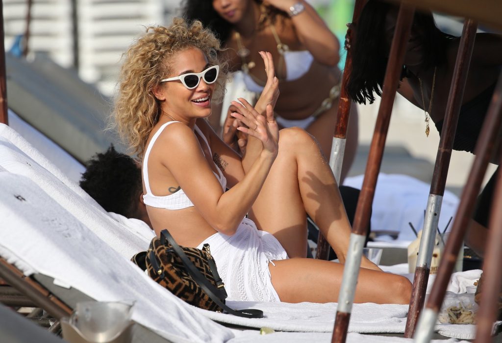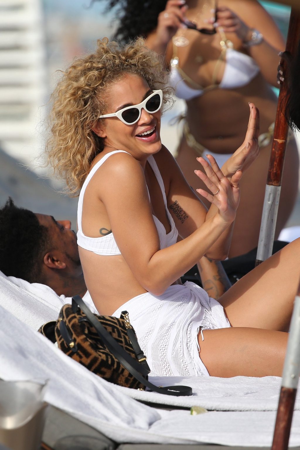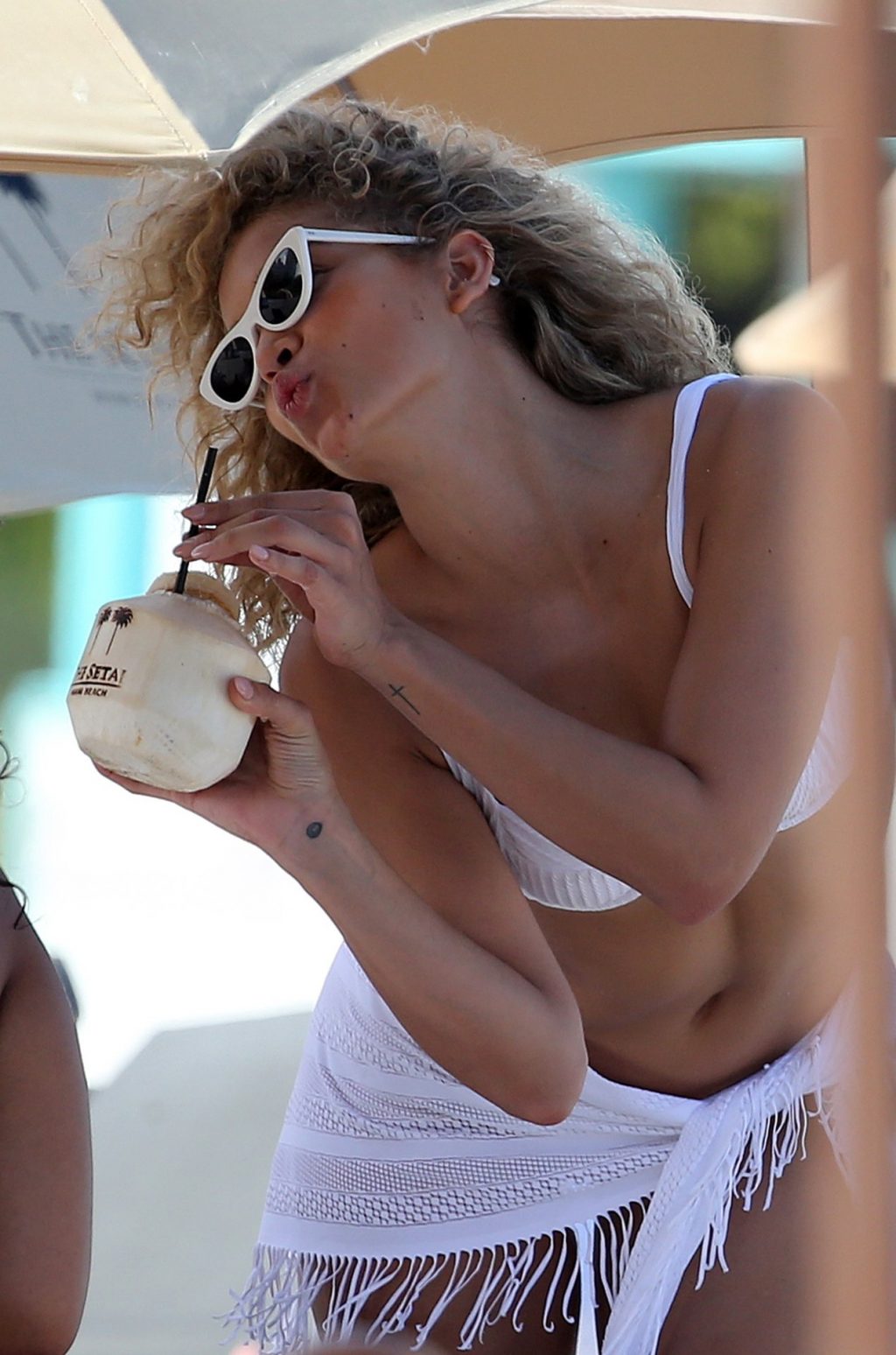 Le mannequin Sports Illustrated Swimsuit et actuelle star de couverture du magazine Maxim, Jasmine Sanders, porte un bikini blanc sur la plage de Miami, 11/12/2019.