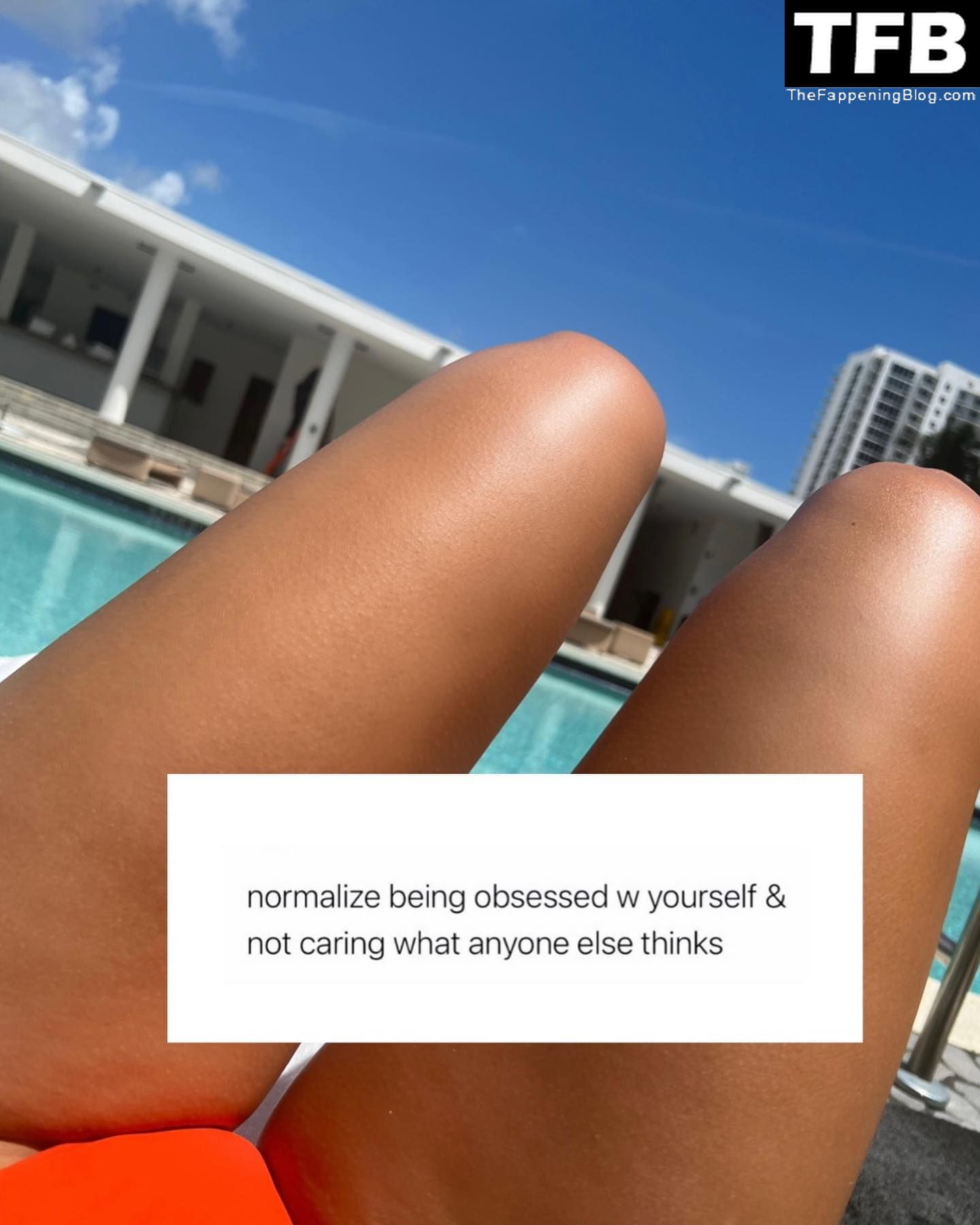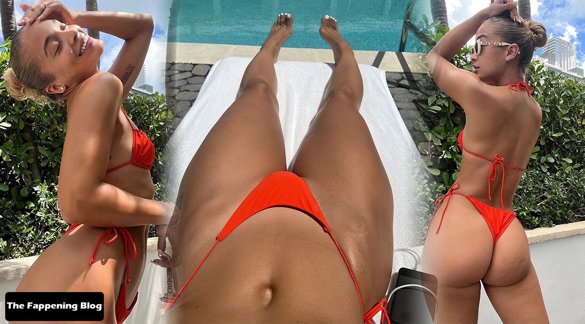 Le mannequin Jasmine Sanders pose en bikini orange et montre ses seins et ses fesses à ses abonnés sur Instagram, 12/08/2022.