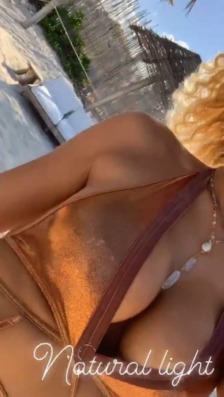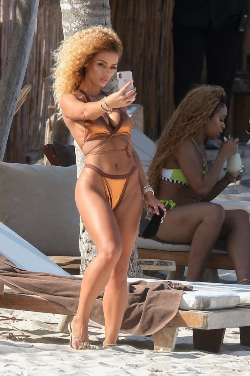 Jena Frumes prend des selfies en se relaxant avec Jilly Anais sur la plage à Tulum, Mexique, 01/05/2019. Les Youtubeuses montrent leurs corps en bikini tout en sirotant des boissons au soleil pendant leurs vacances ensemble.