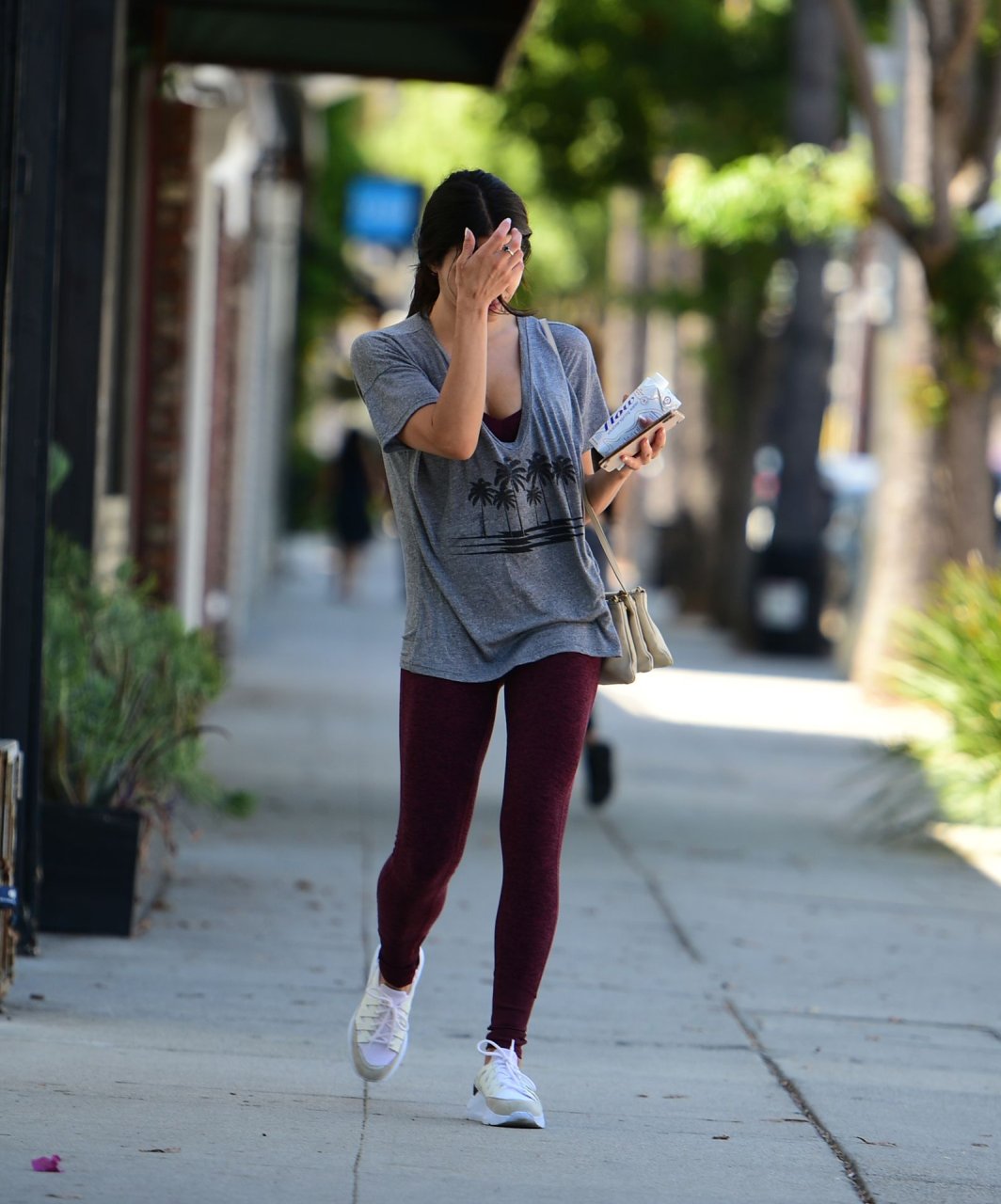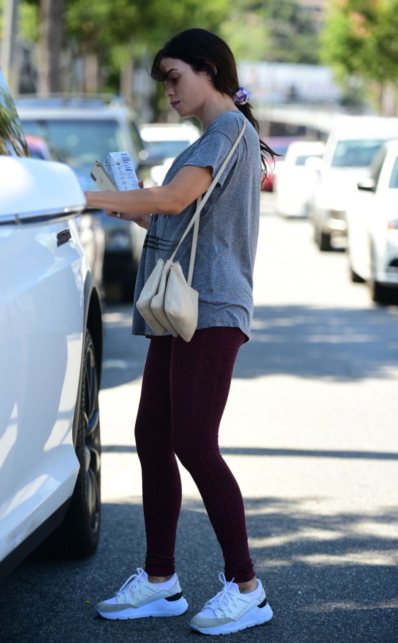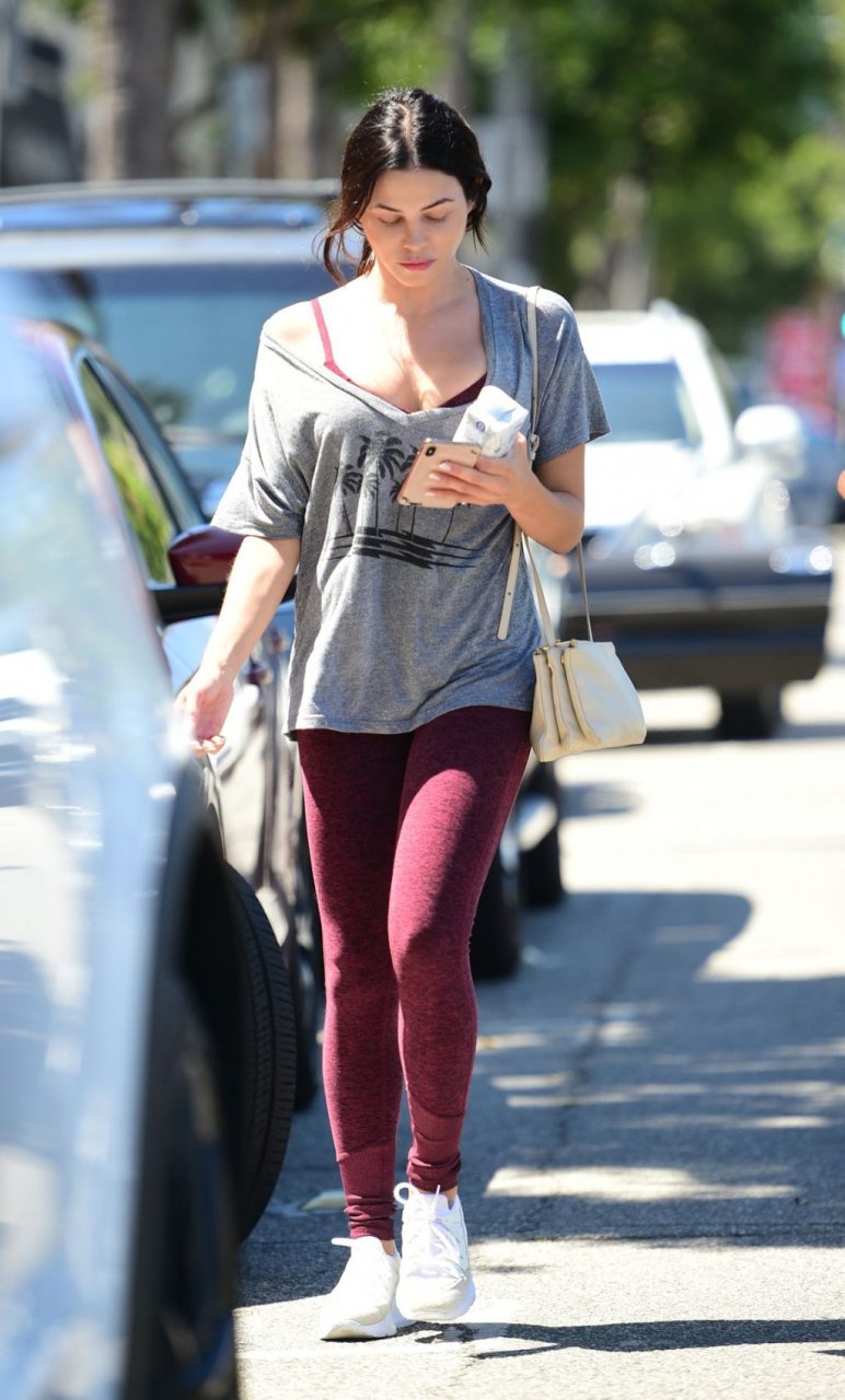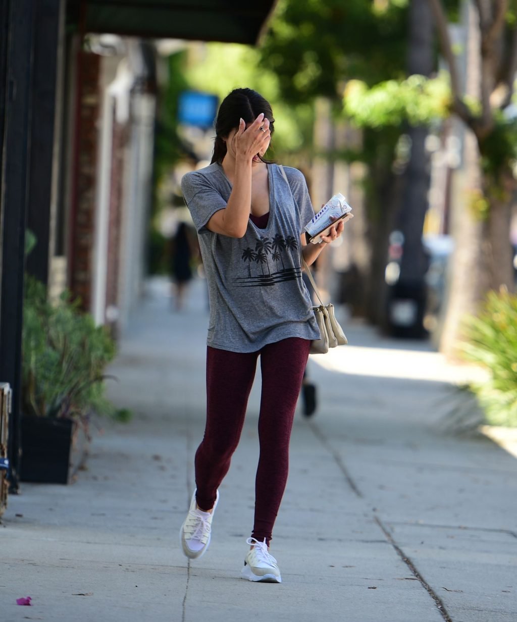 Jenna Dewan quitte la salle de sport à Los Angeles après un entraînement matinal, 11/09/2019. L’actrice américaine de 38 ans, en forme et fabuleuse, porte un t-shirt gris associé à des collants bordeaux et des baskets blanches.