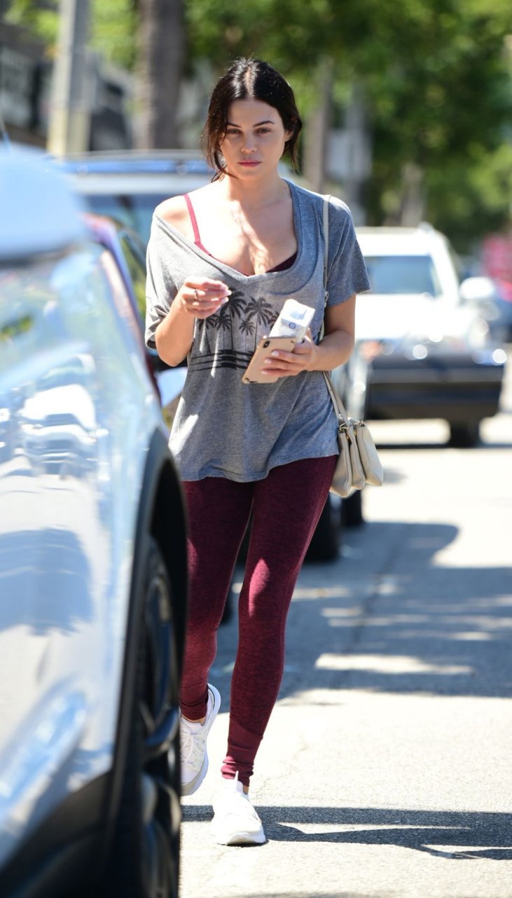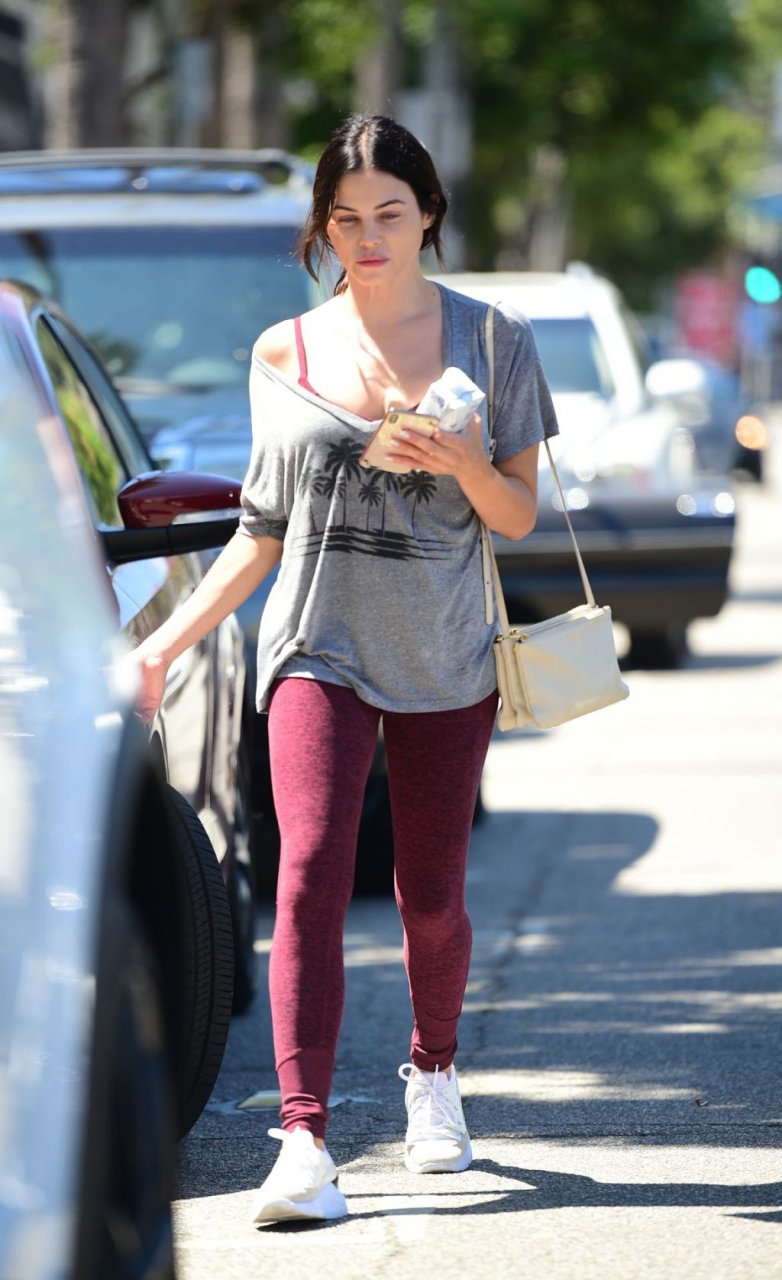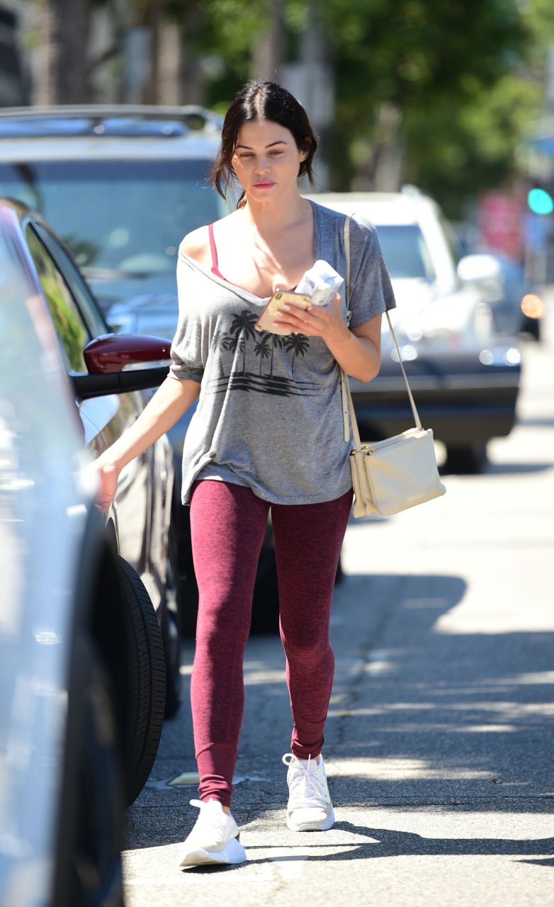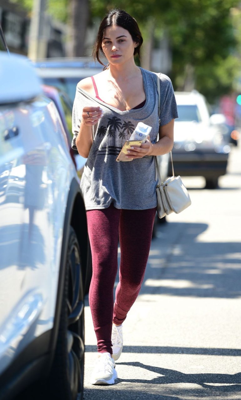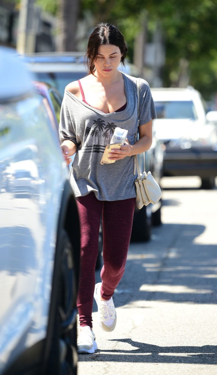 Jenna Dewan quitte la salle de sport à Los Angeles après un entraînement matinal, 11/09/2019. L’actrice américaine de 38 ans, en forme et fabuleuse, porte un t-shirt gris associé à des collants bordeaux et des baskets blanches.
