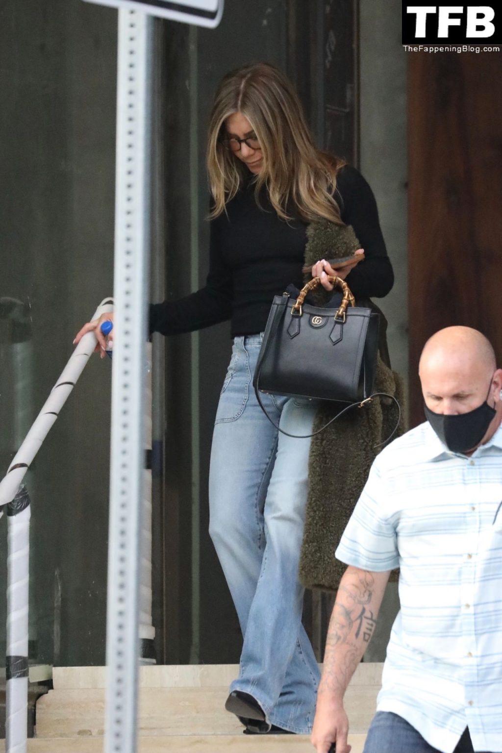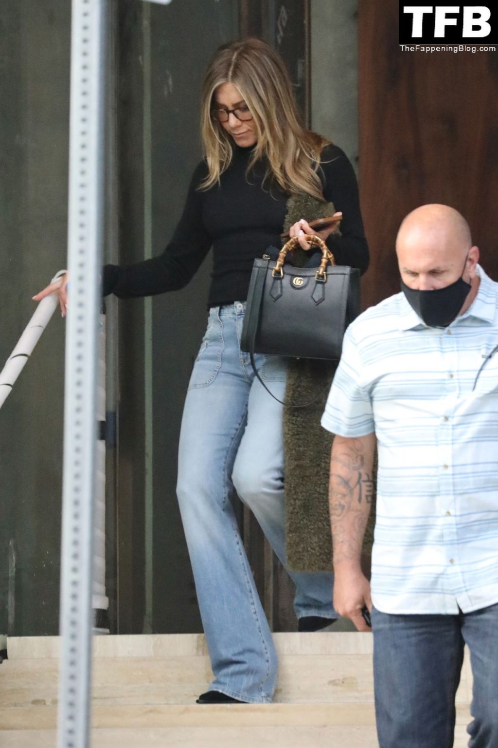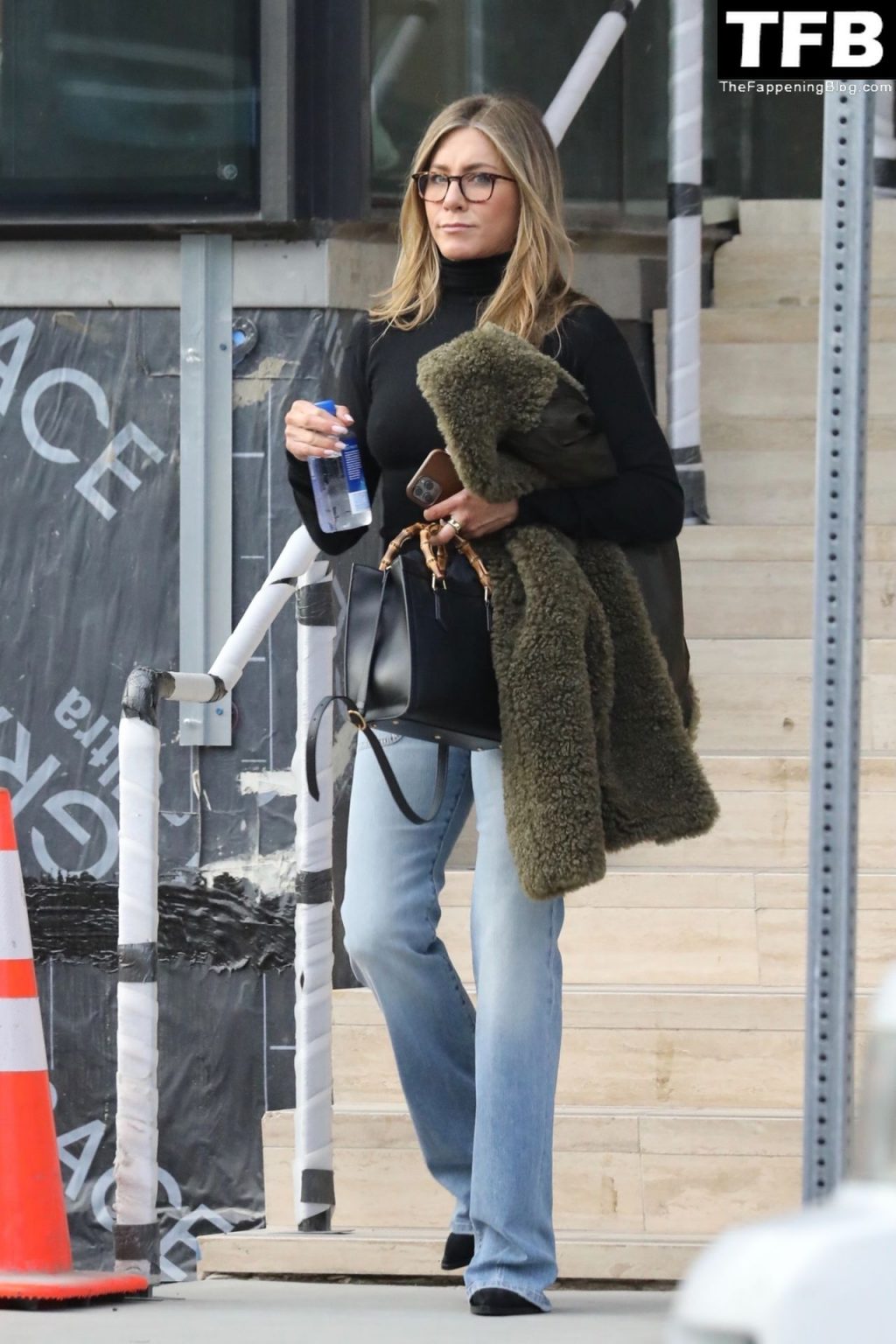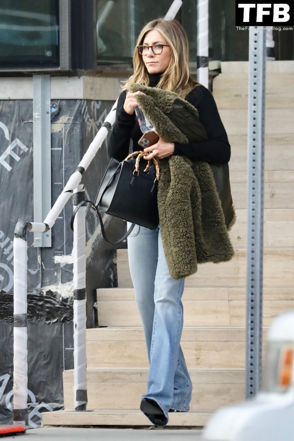 Jennifer Aniston s’habille d’un col roulé noir, d’un jean droit chic délavé clair, de lunettes à monture noire et d’un sac à main Gucci en bambou pour une séance photo à Beverly Hills mardi après-midi.