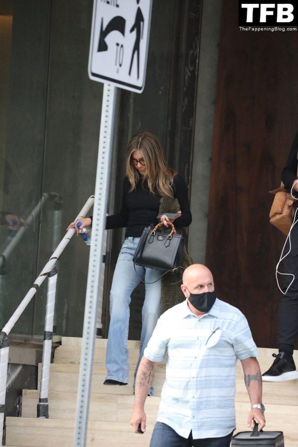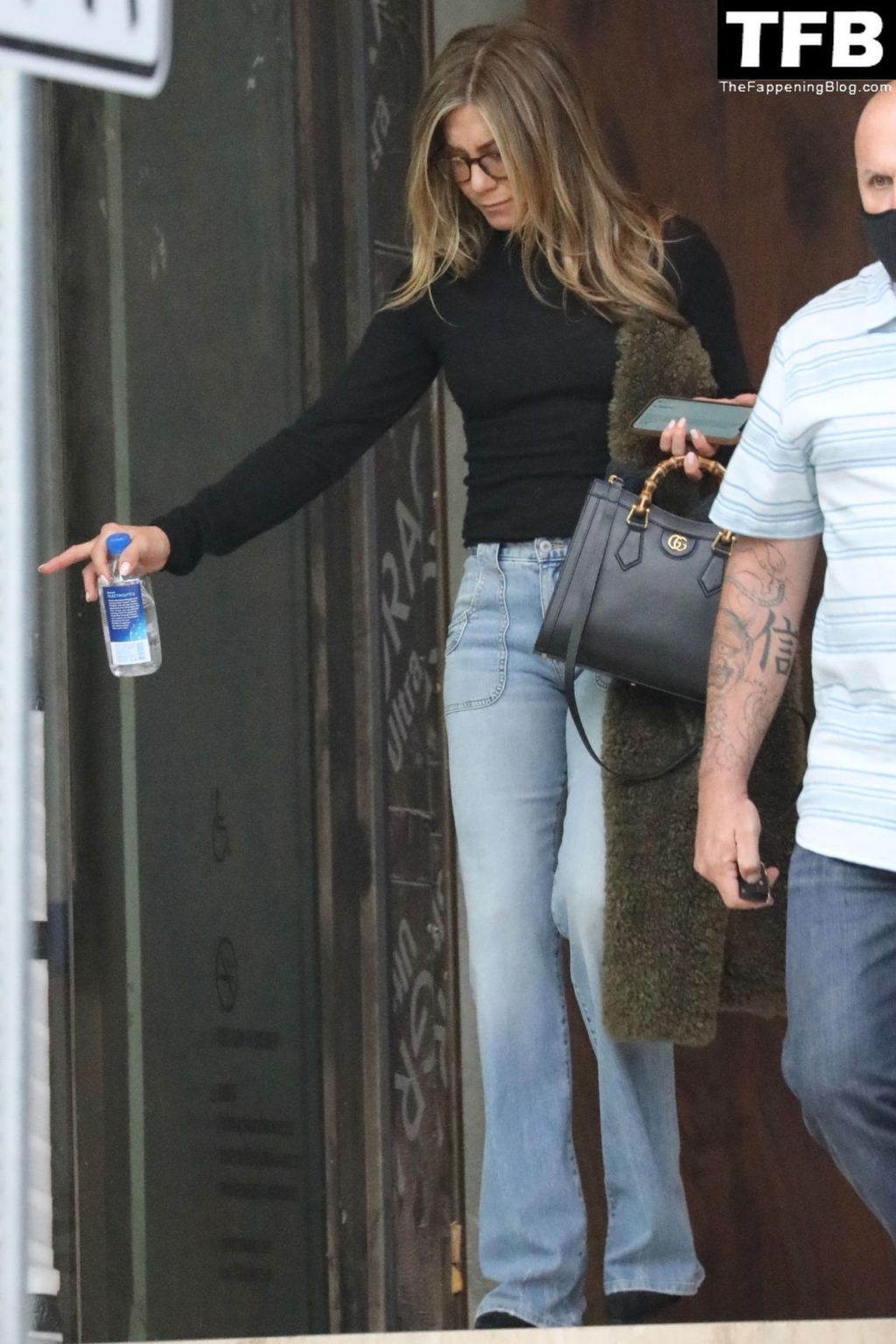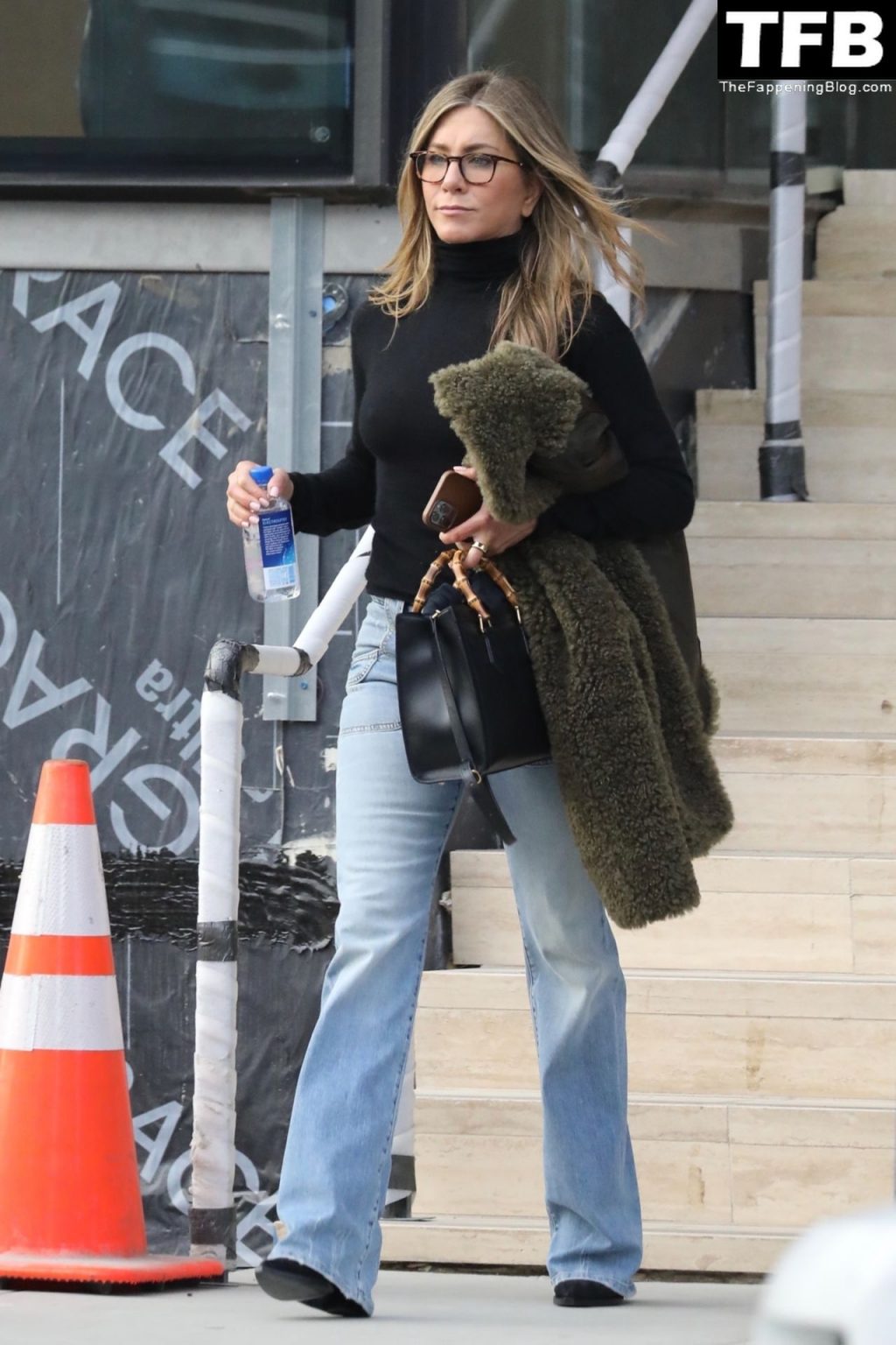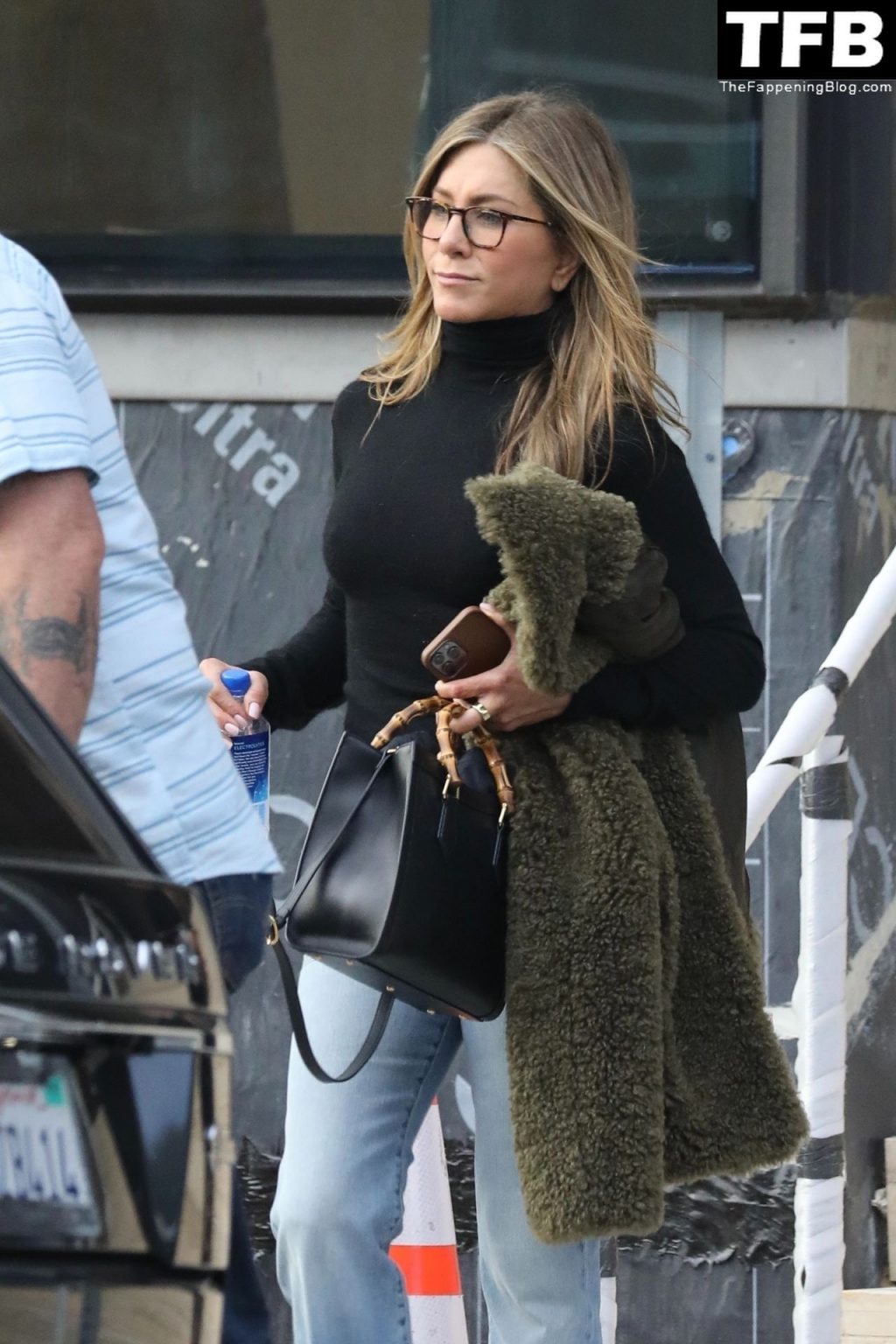 Jennifer Aniston s’habille d’un col roulé noir, d’un jean droit chic délavé clair, de lunettes à monture noire et d’un sac à main Gucci en bambou pour une séance photo à Beverly Hills mardi après-midi.
