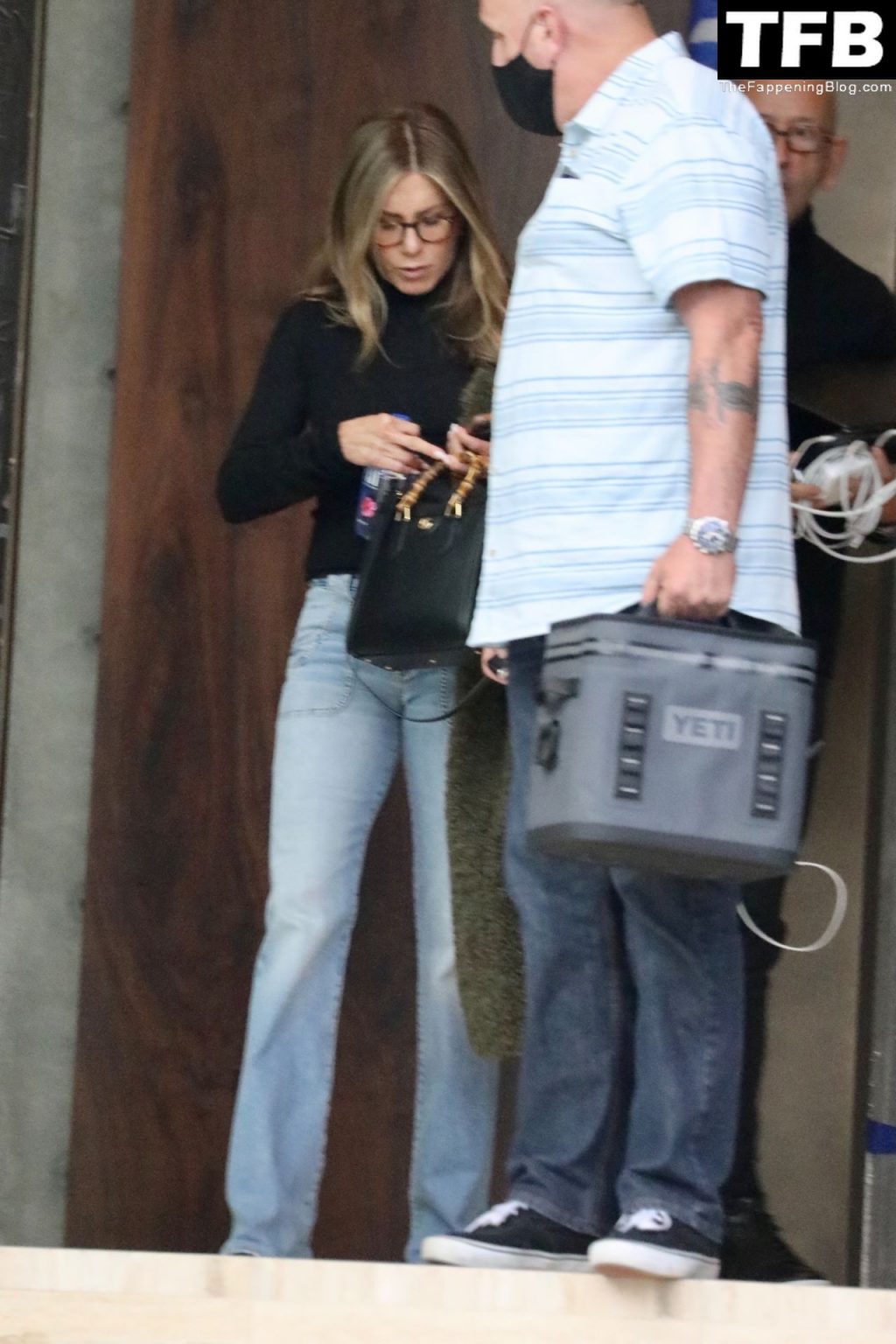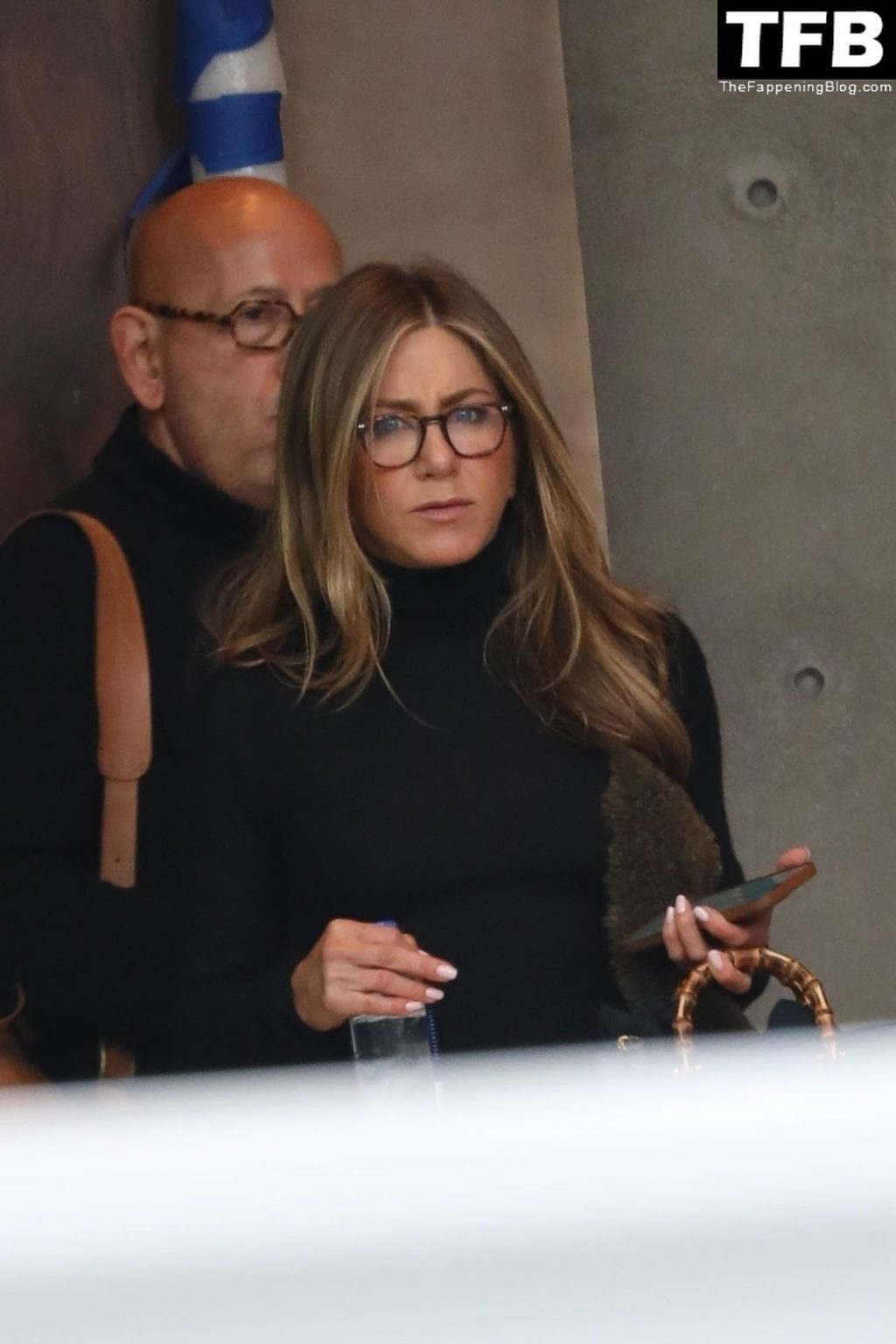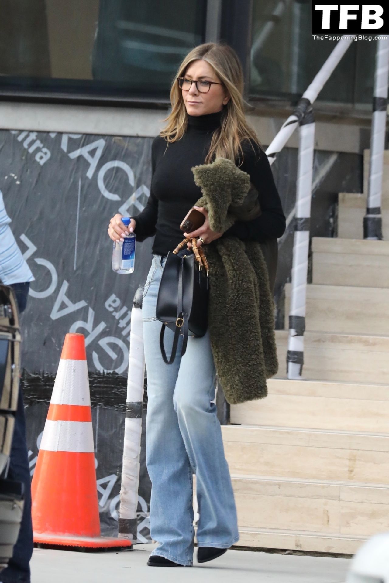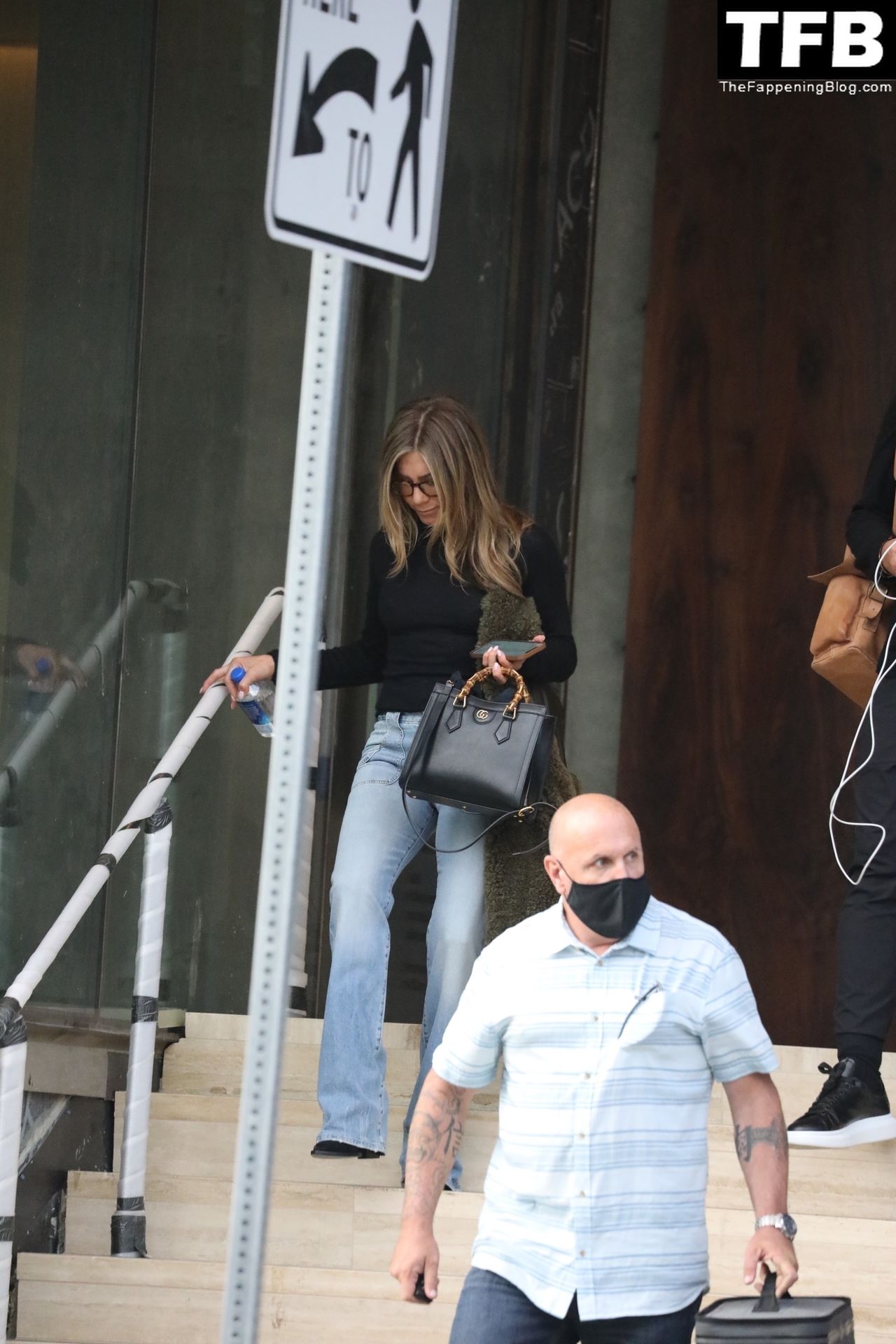Jennifer Aniston s’habille d’un col roulé noir, d’un jean droit chic délavé clair, de lunettes à monture noire et d’un sac à main Gucci en bambou pour une séance photo à Beverly Hills mardi après-midi.
