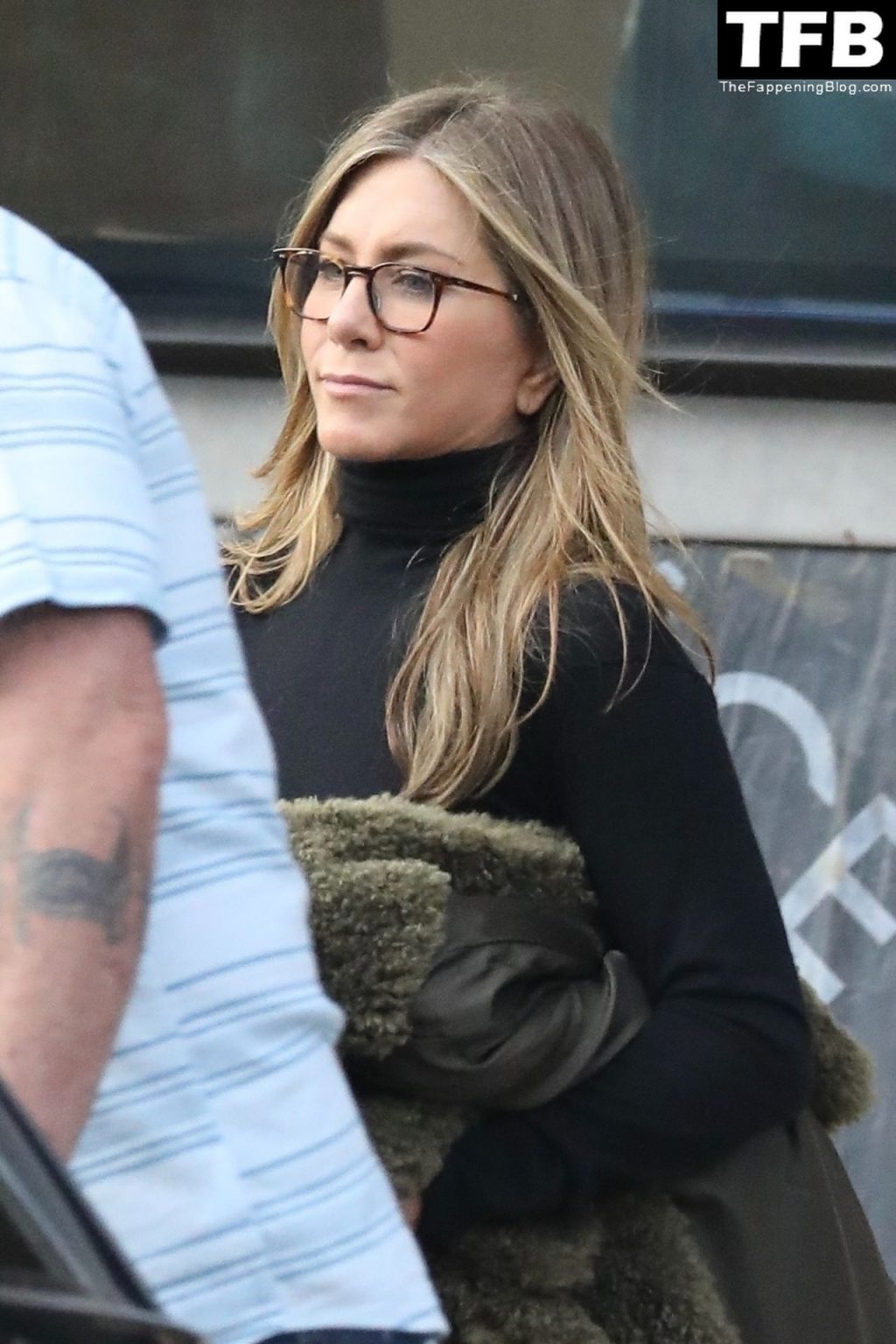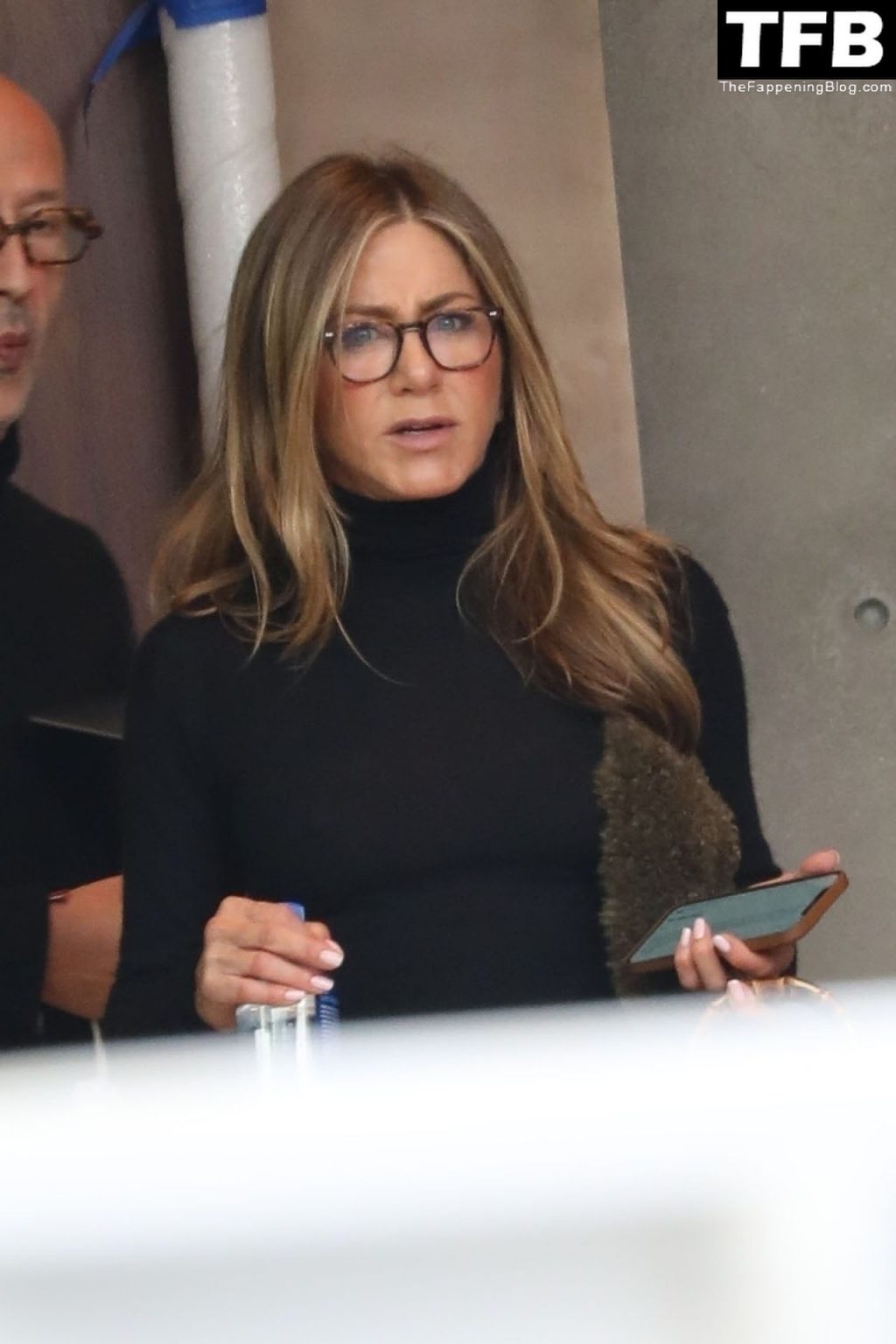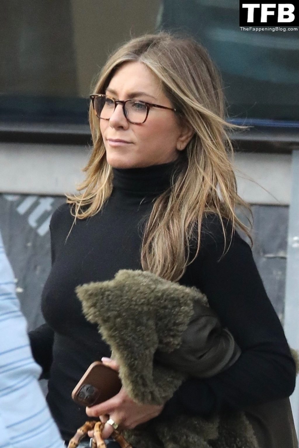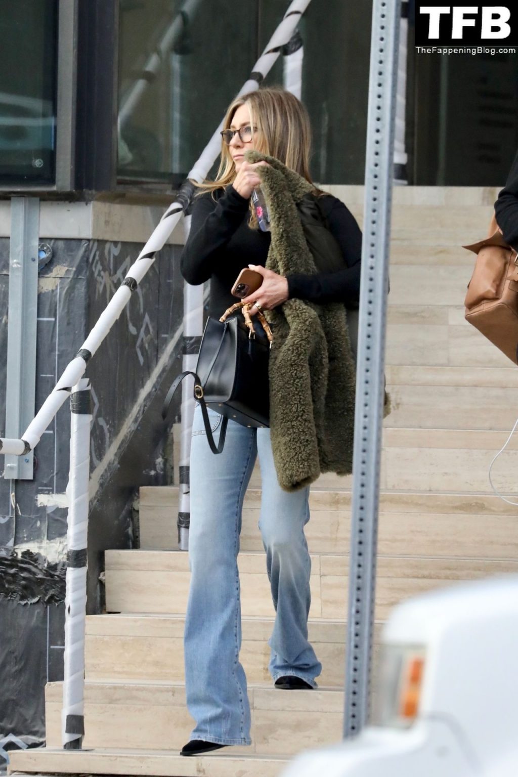 Jennifer Aniston s’habille d’un col roulé noir, d’un jean droit chic délavé clair, de lunettes à monture noire et d’un sac à main Gucci en bambou pour une séance photo à Beverly Hills mardi après-midi.