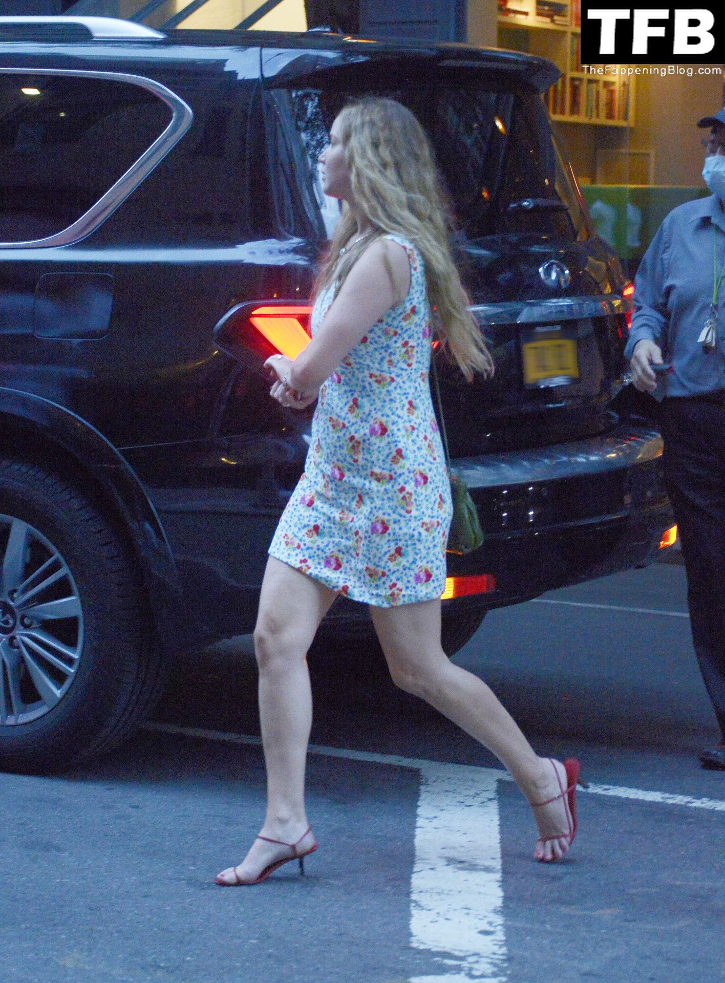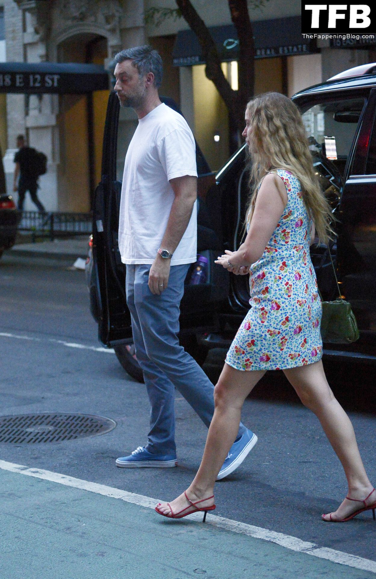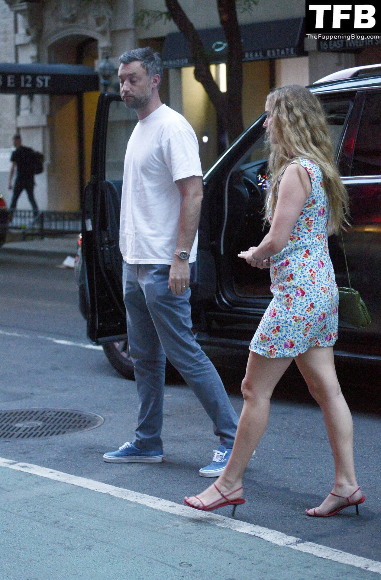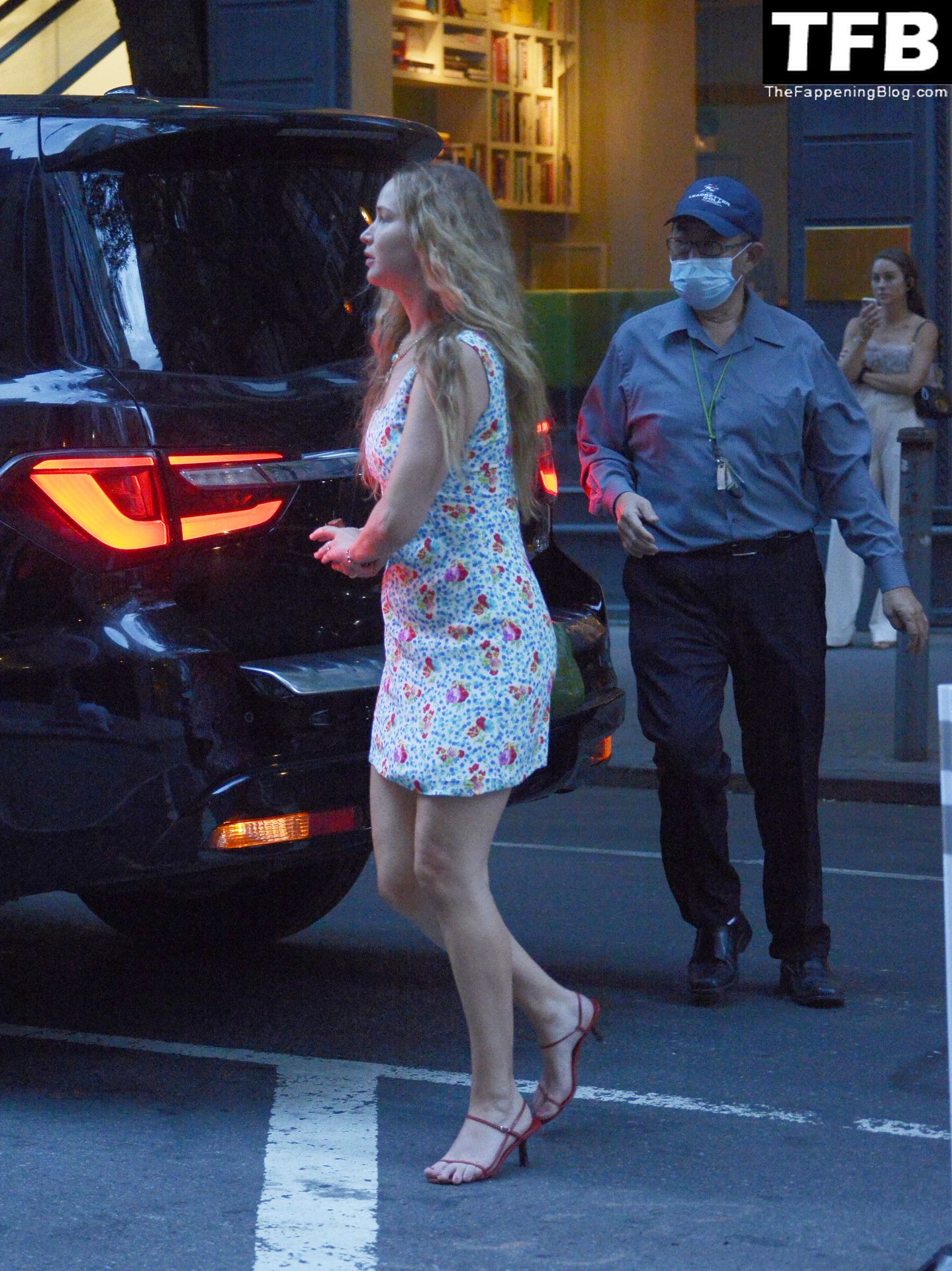 Jennifer Lawrence et Cooke Maroney sortent pour une soirée en amoureux à New York, le 23/08/2022. L’actrice de 32 ans portait un sac vert et une mini robe fleurie associée à des talons rouges.