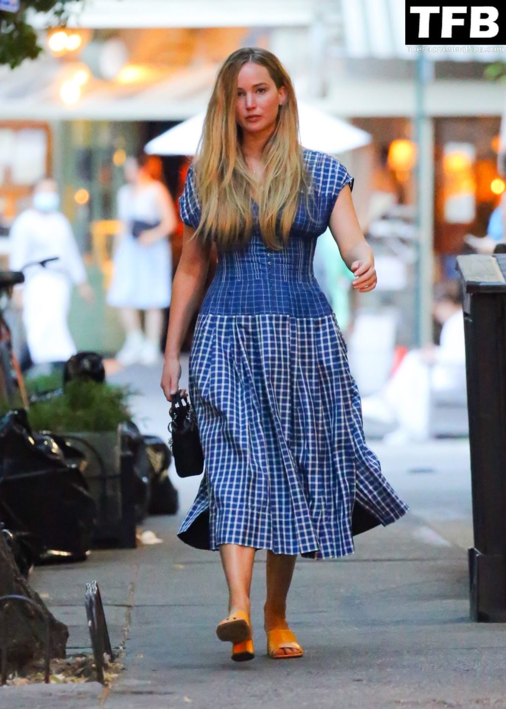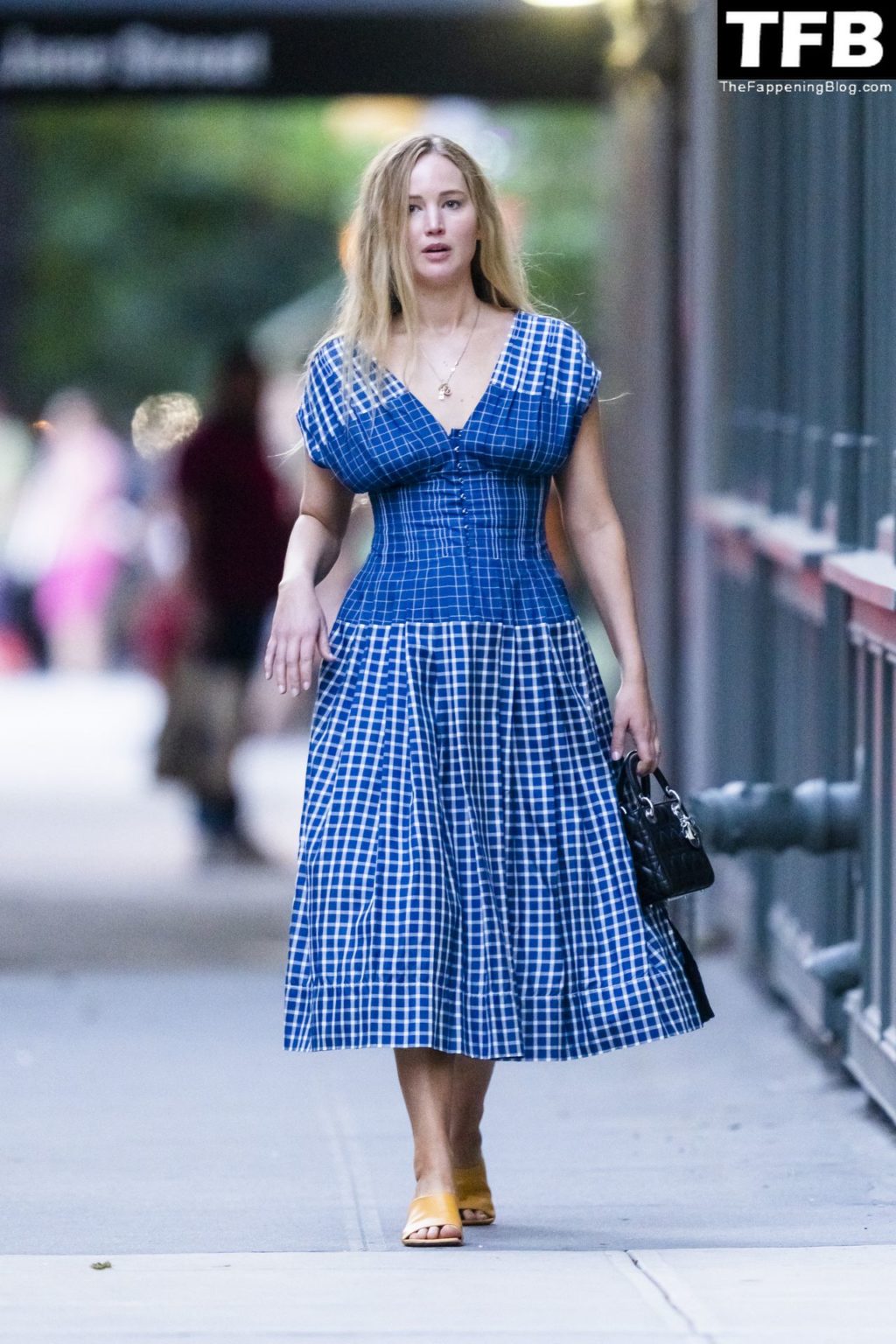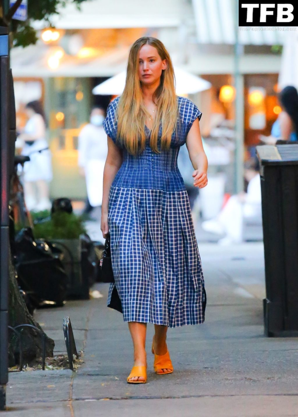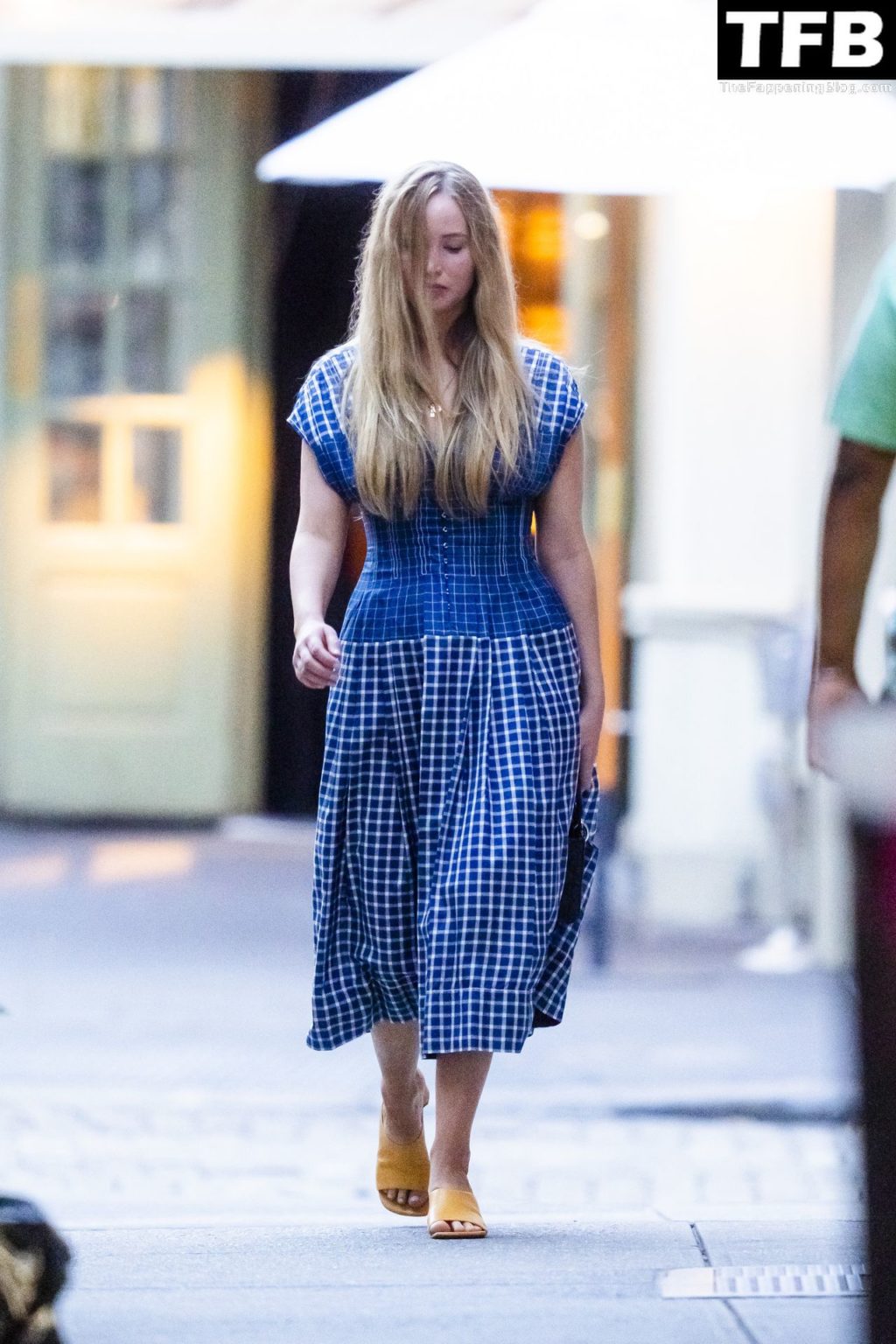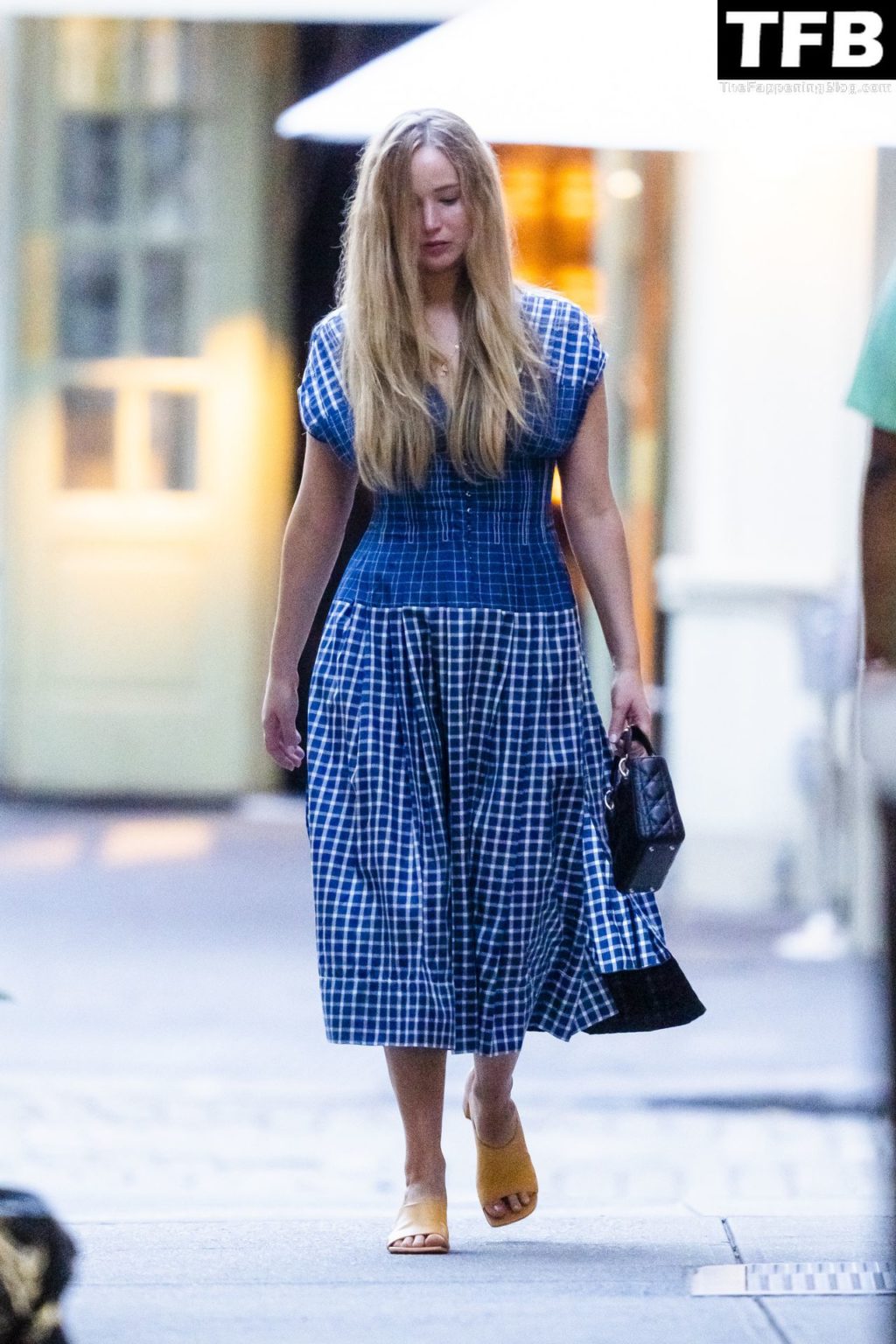 L’actrice et star de The Fappening Jennifer Lawrence est magnifique dans une robe bleue alors qu’elle est vue quittant le restaurant Cafe Cluny à New York, le 15/07/2022.