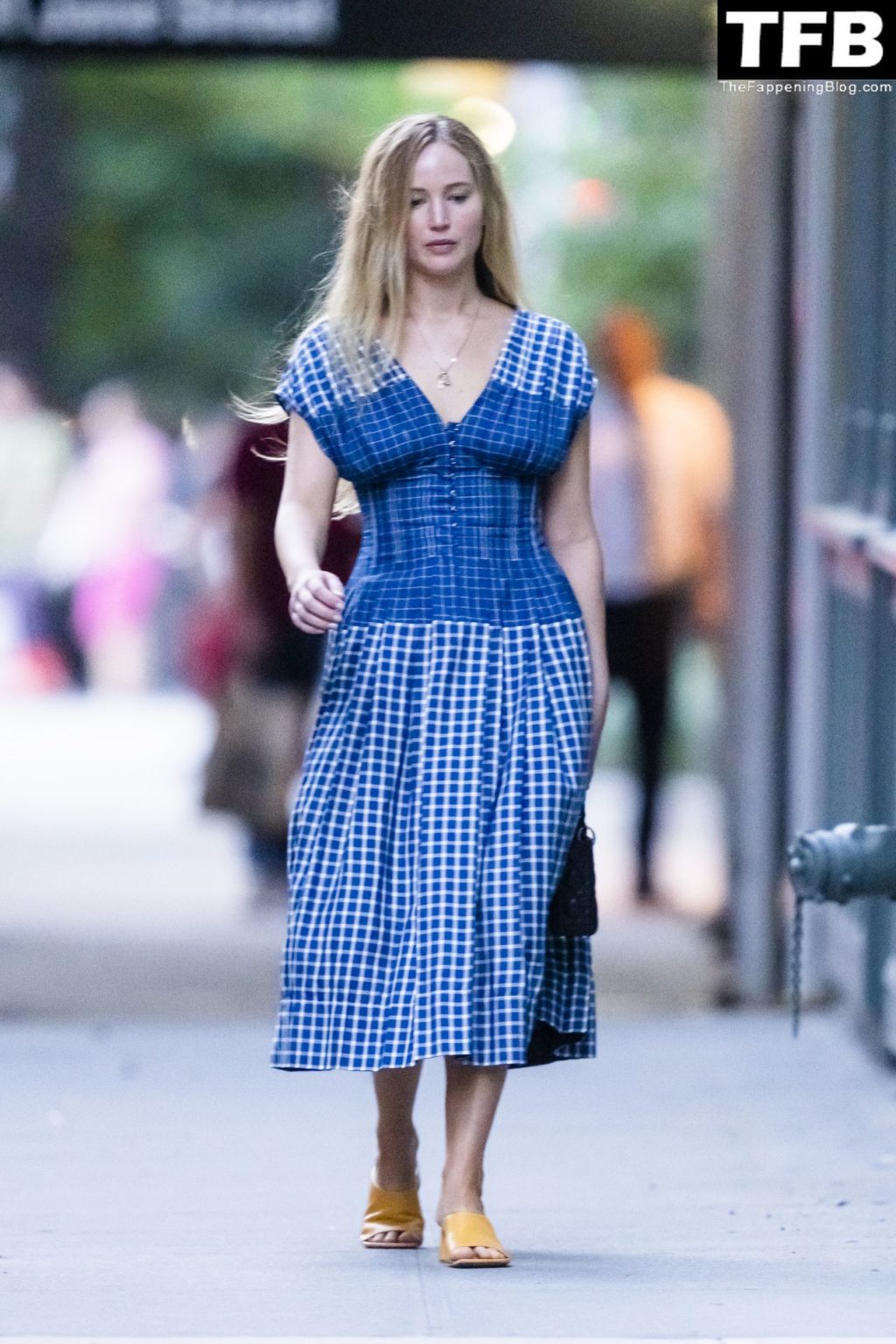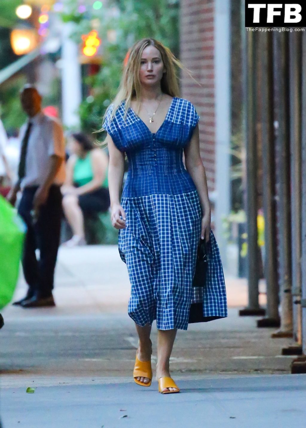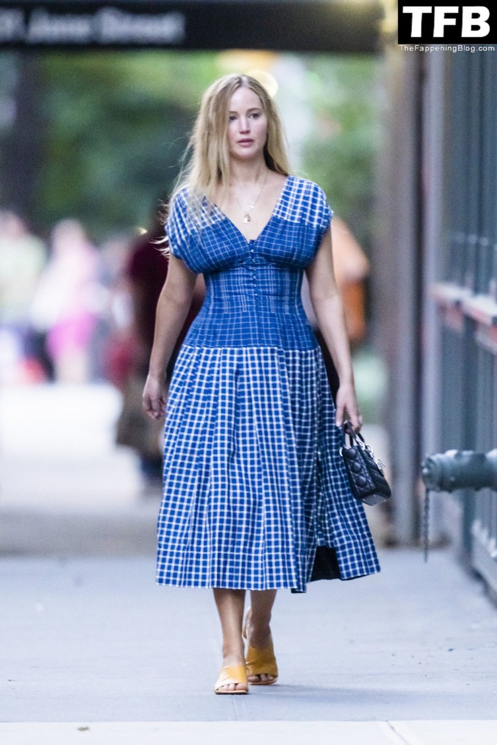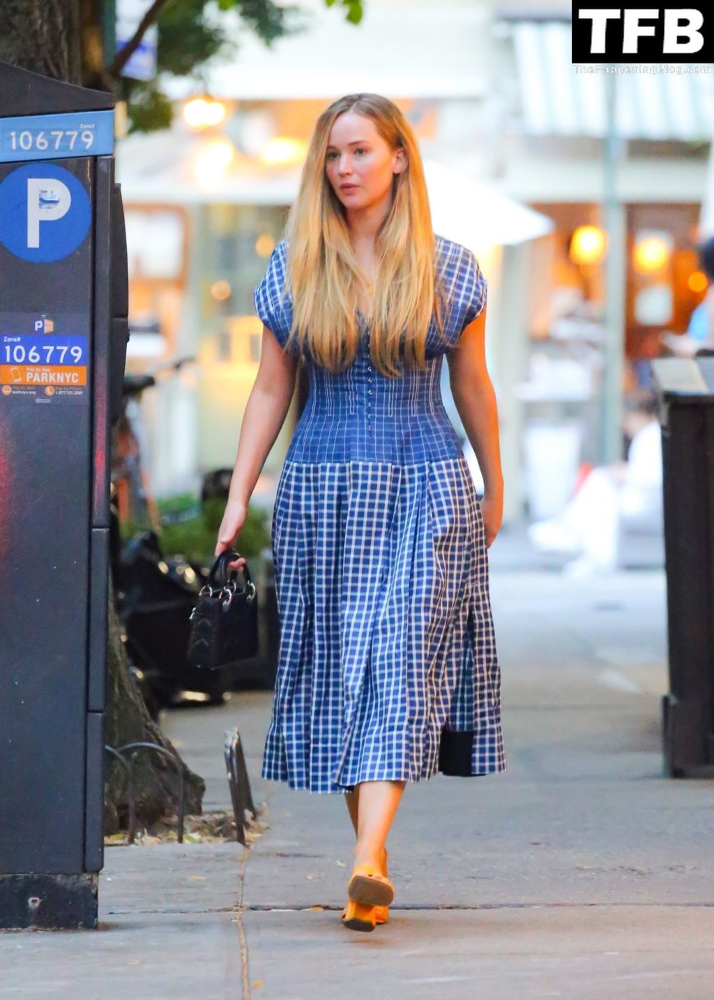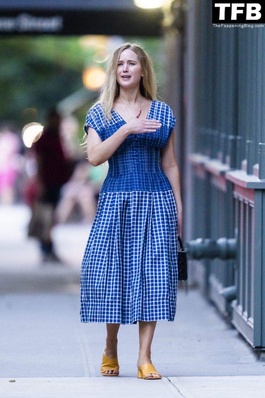 L’actrice et star de The Fappening Jennifer Lawrence est magnifique dans une robe bleue alors qu’elle est vue quittant le restaurant Cafe Cluny à New York, le 15/07/2022.