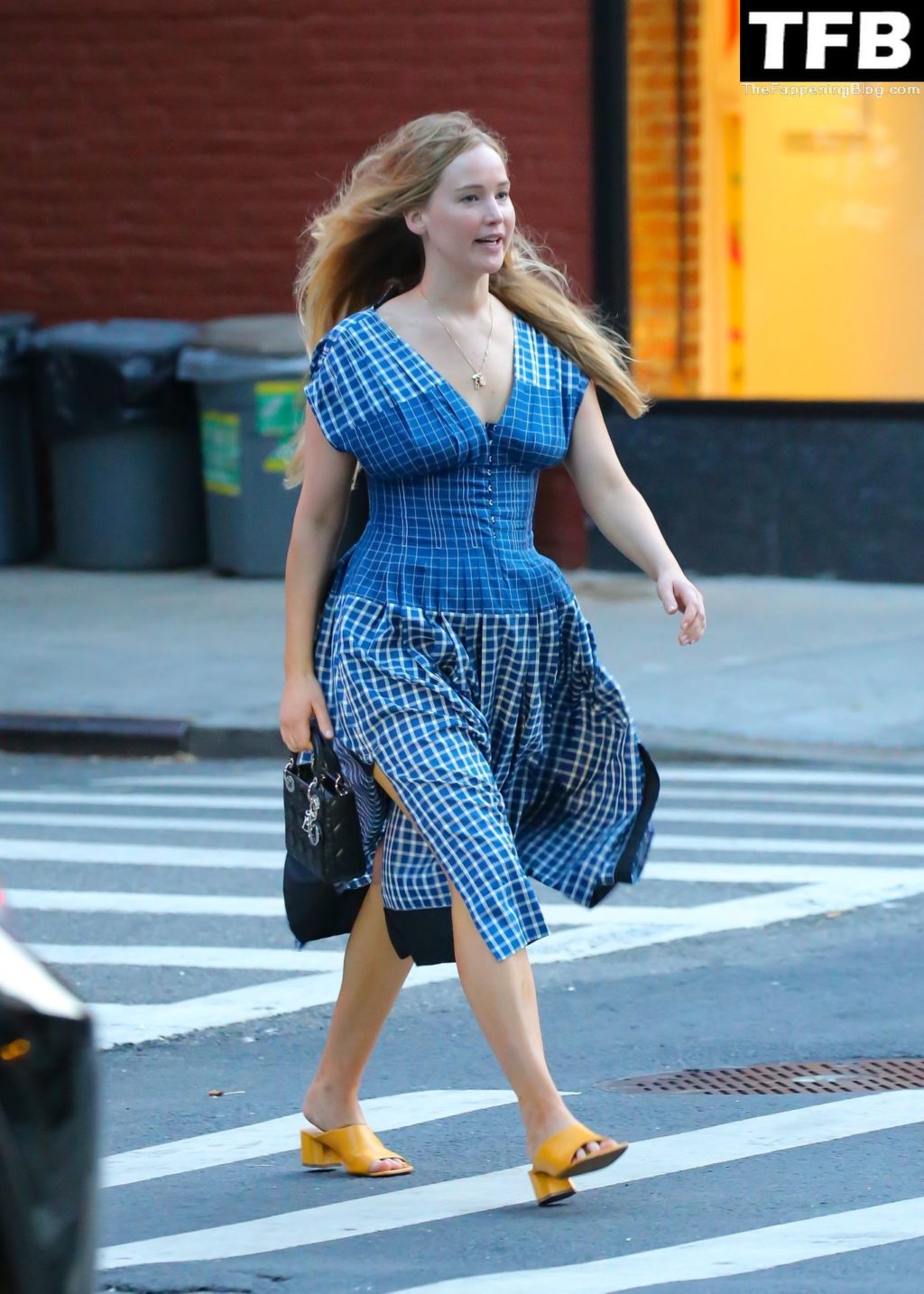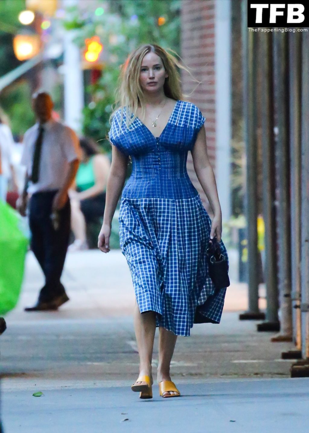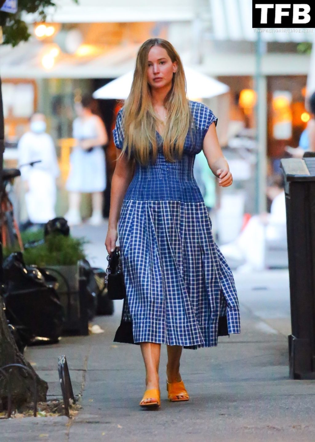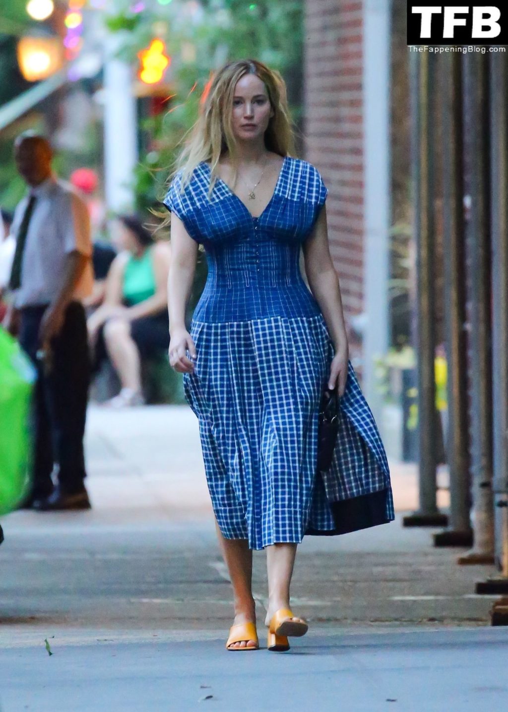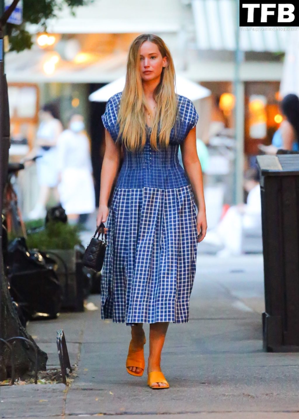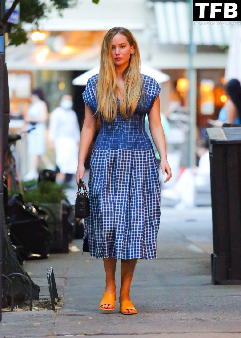 L’actrice et star de The Fappening Jennifer Lawrence est magnifique dans une robe bleue alors qu’elle est vue quittant le restaurant Cafe Cluny à New York, le 15/07/2022.