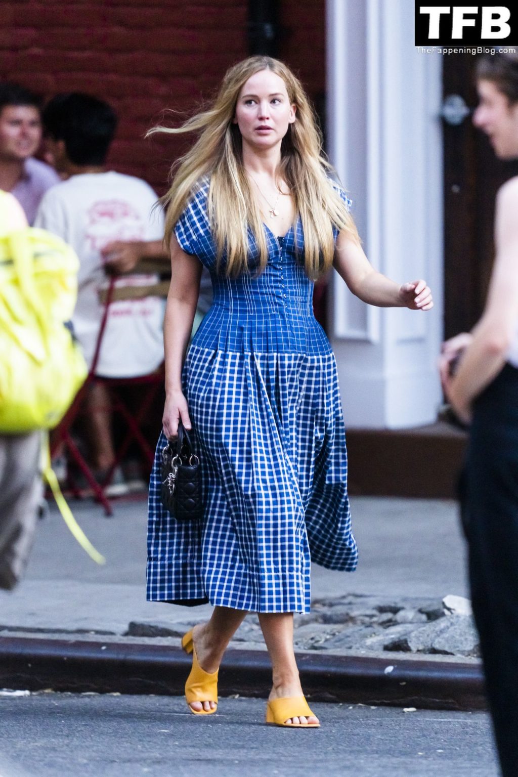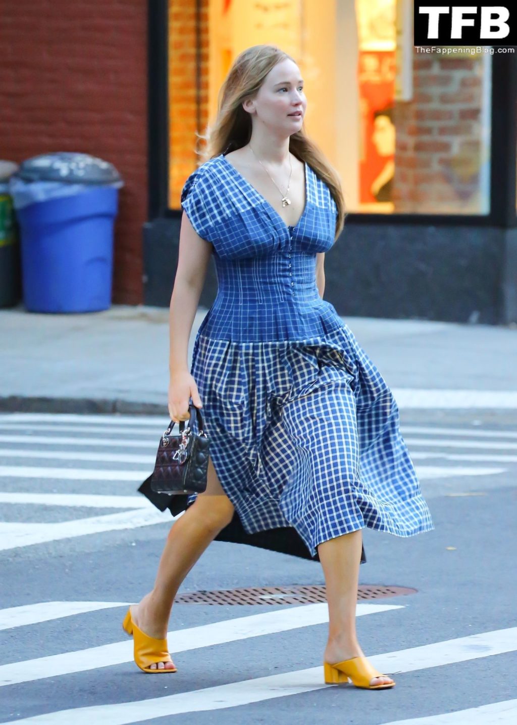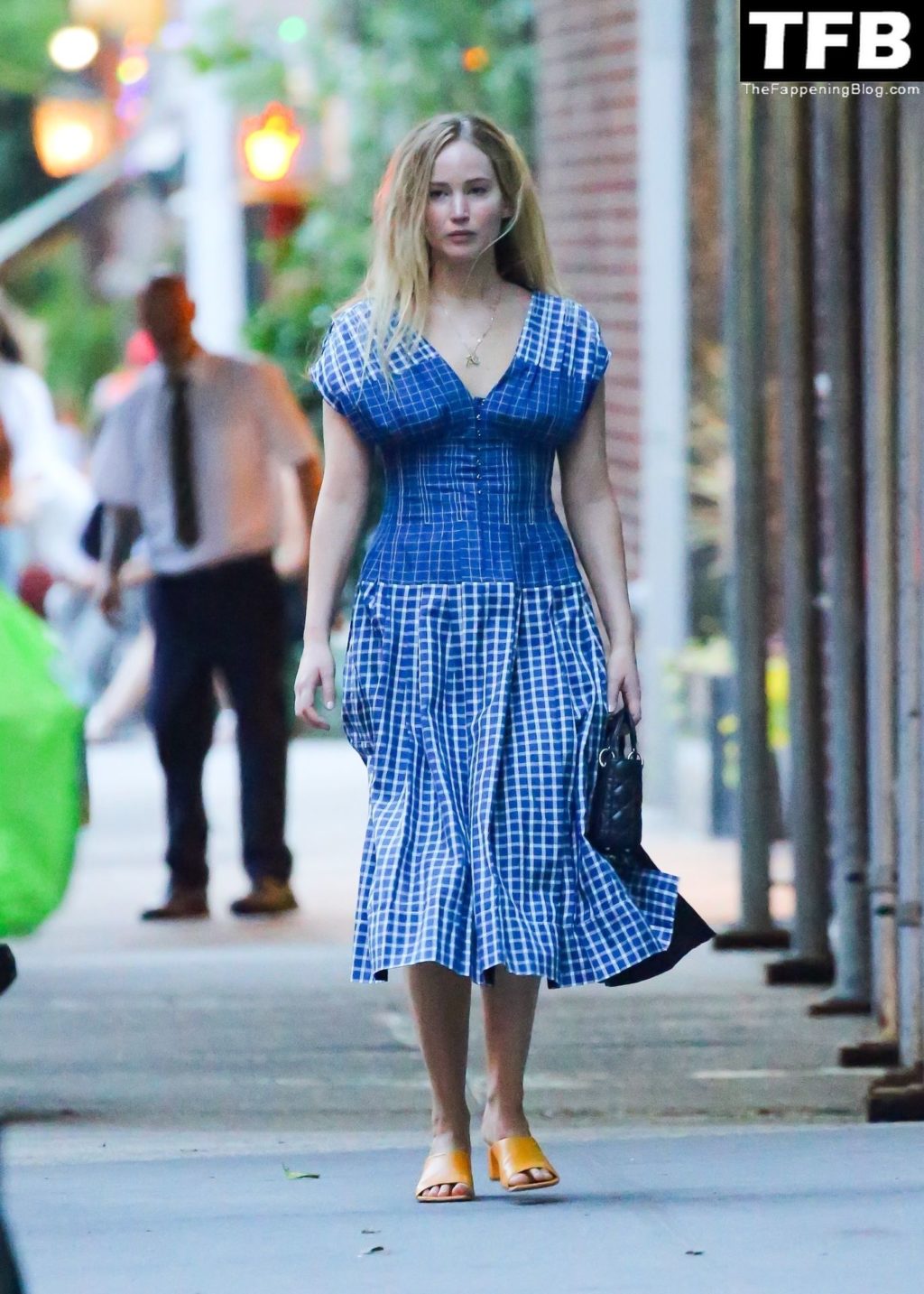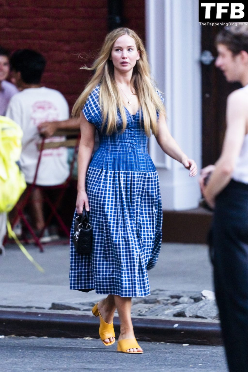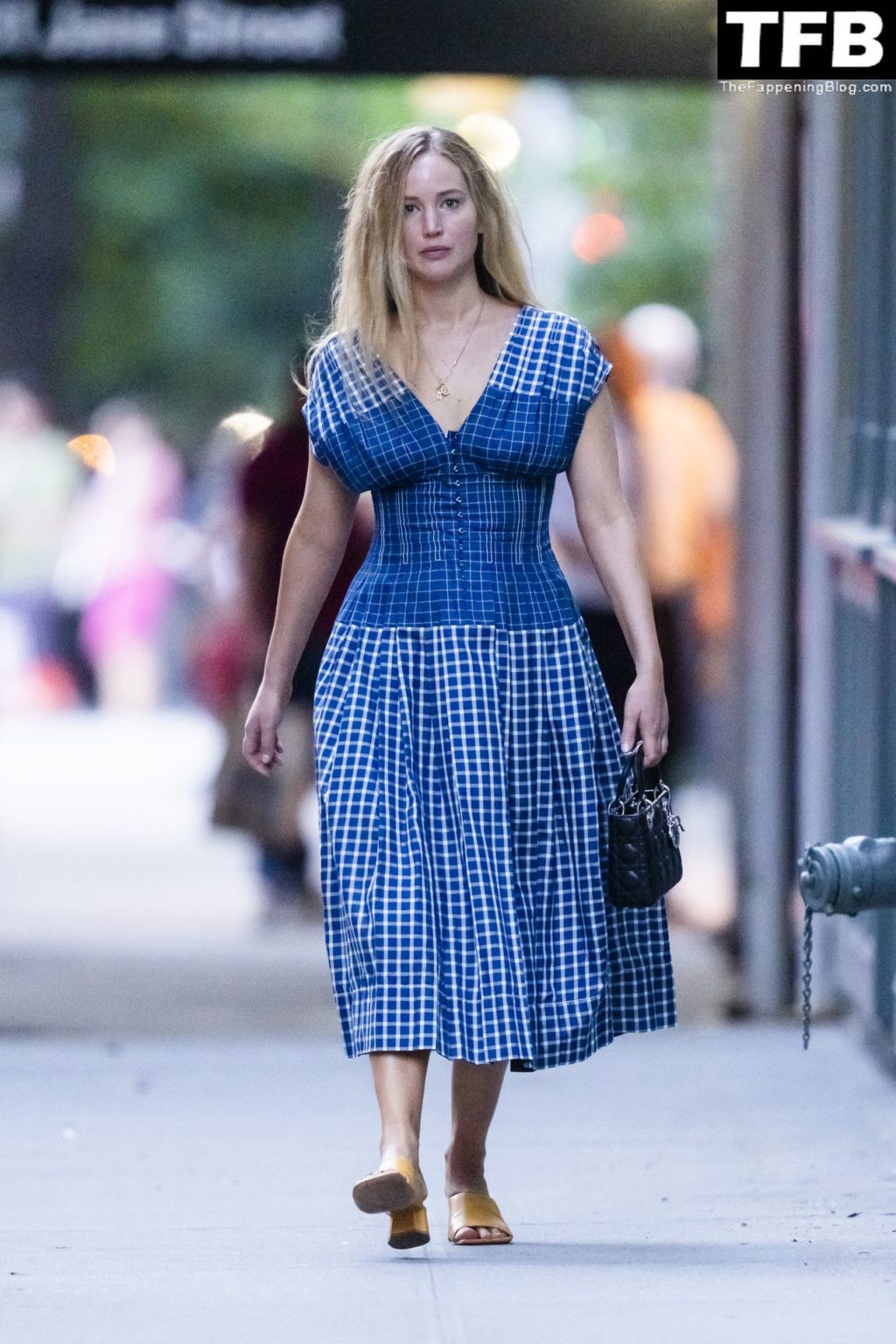 L’actrice et star de The Fappening Jennifer Lawrence est magnifique dans une robe bleue alors qu’elle est vue quittant le restaurant Cafe Cluny à New York, le 15/07/2022.