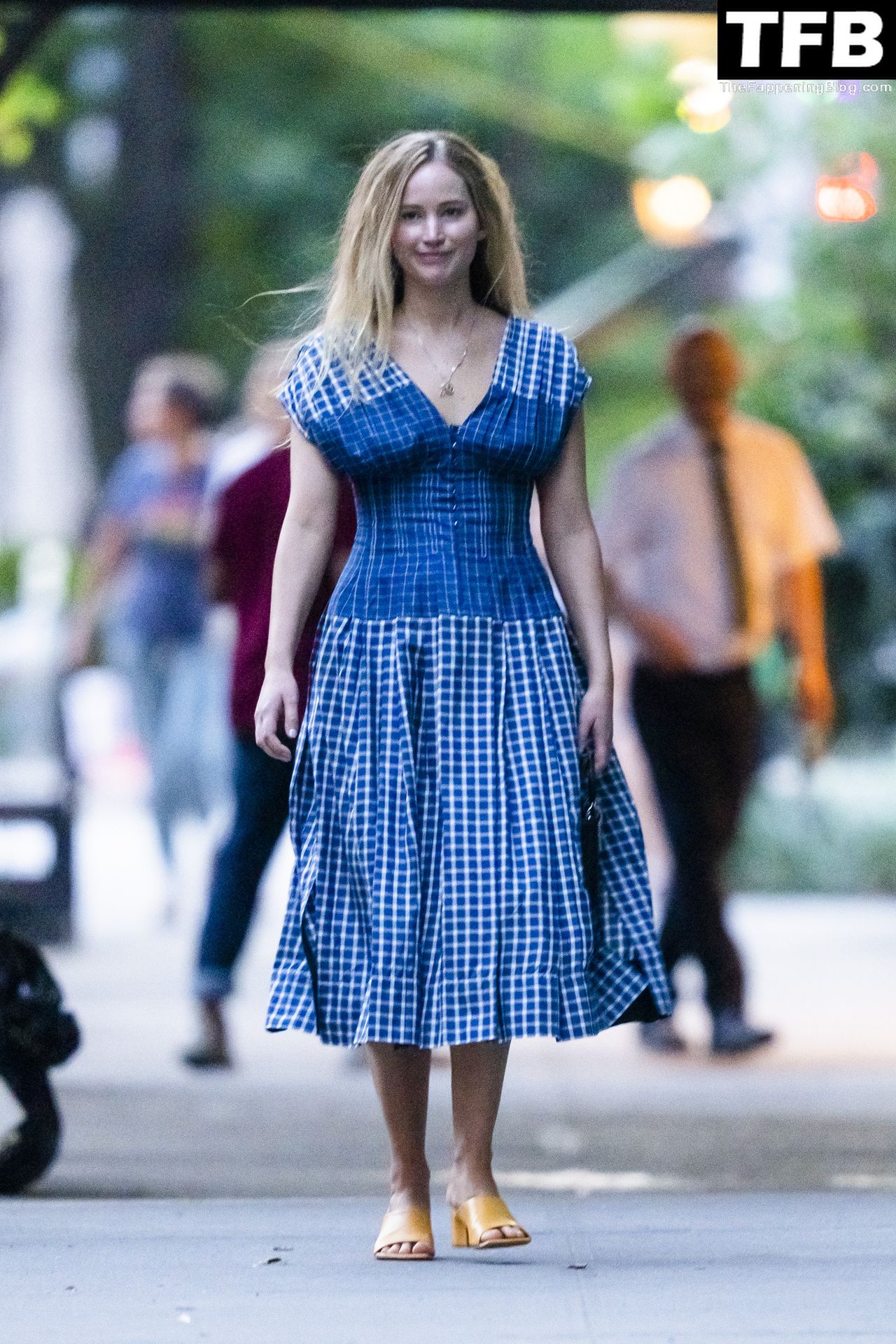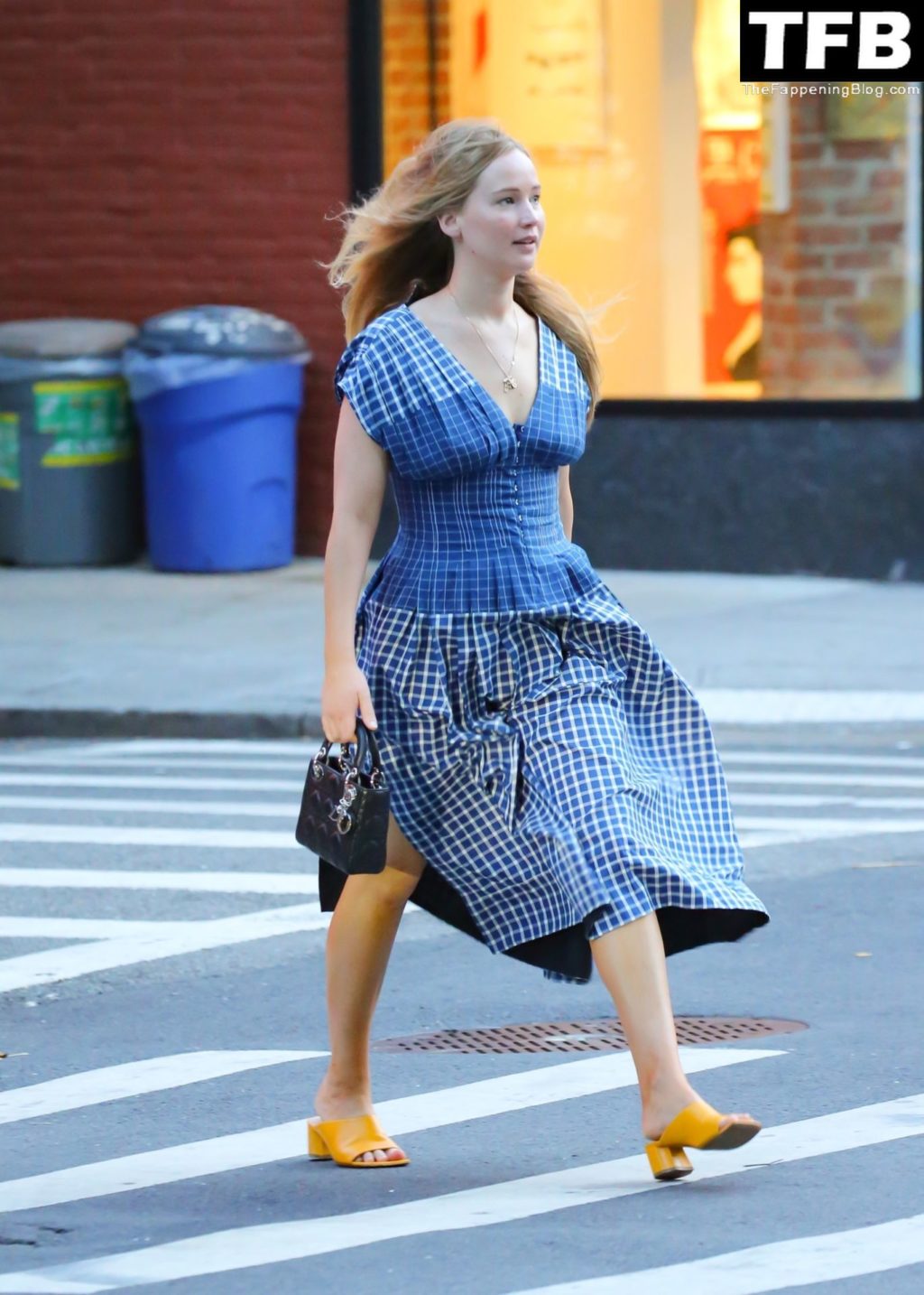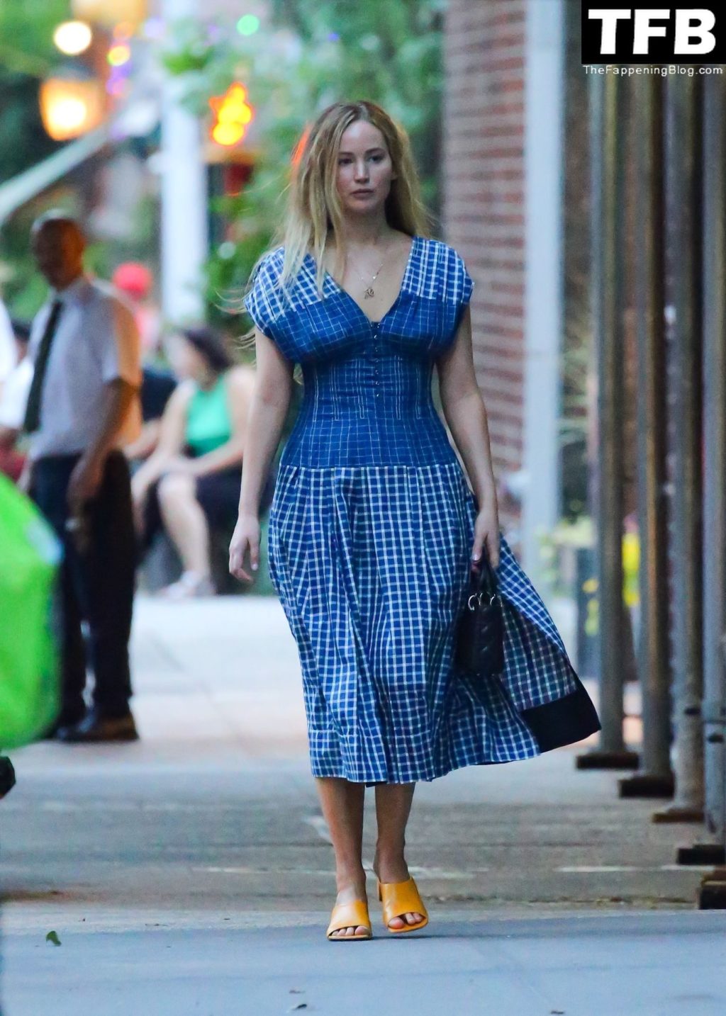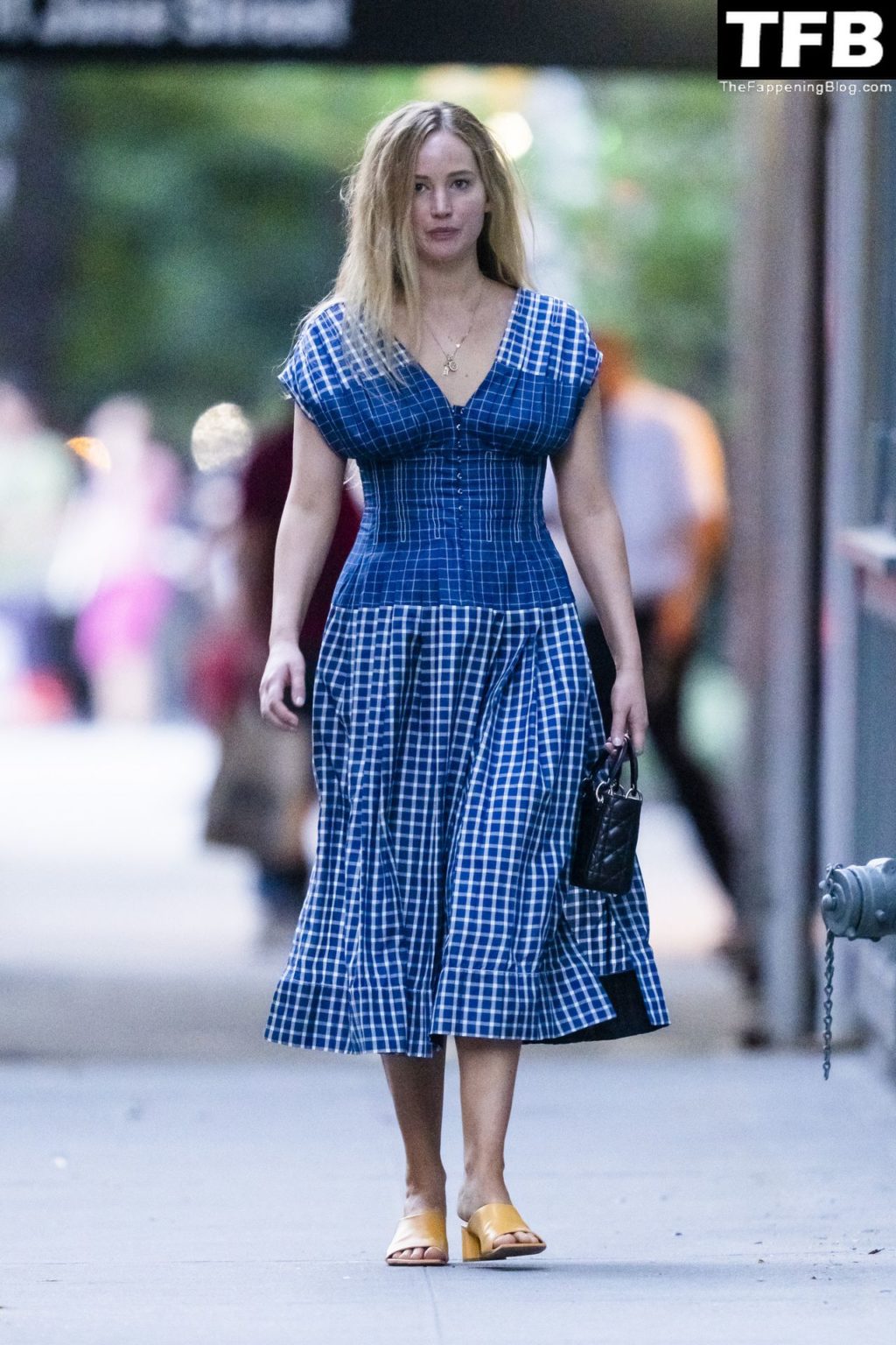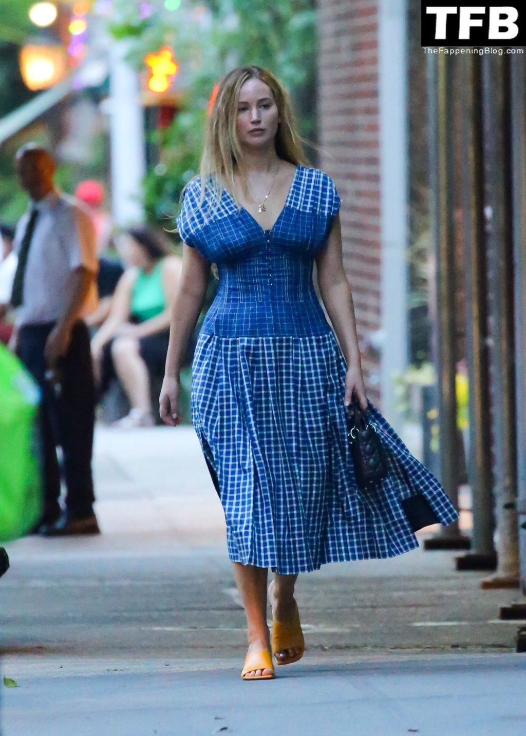 L’actrice et star de The Fappening Jennifer Lawrence est magnifique dans une robe bleue alors qu’elle est vue quittant le restaurant Cafe Cluny à New York, le 15/07/2022.