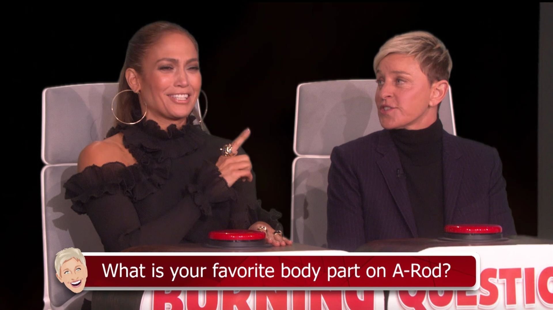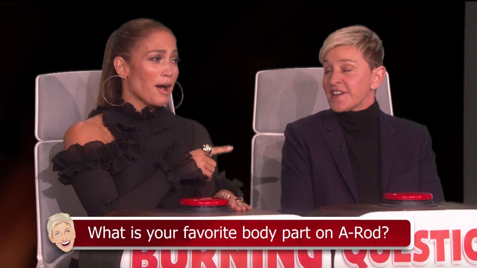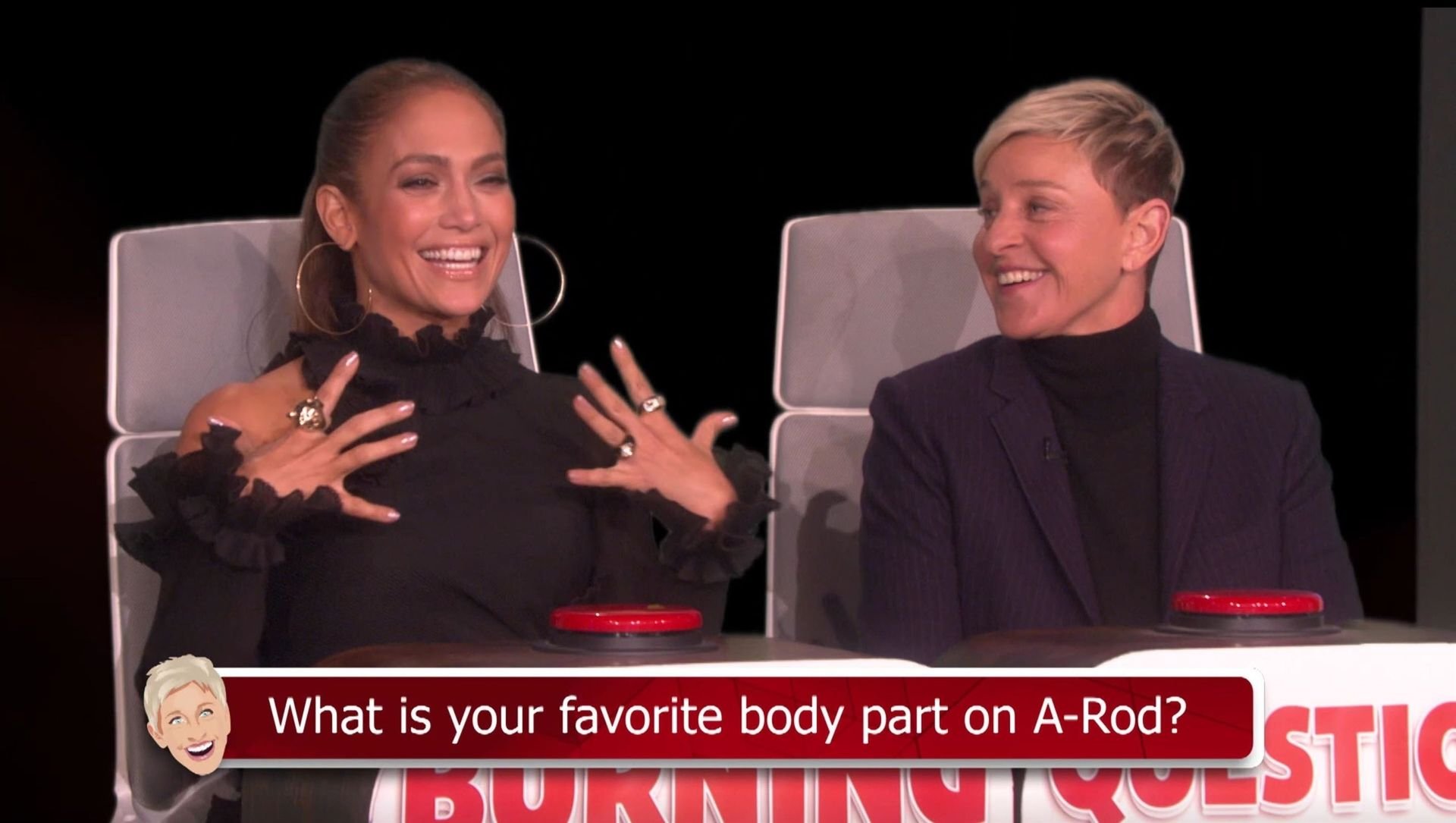 Jennifer Lopez est restée choquée lorsque Ellen DeGeneres a évoqué le pénis d’Alex Rodriguez lors d’un jeu de Burning Questions dans The Ellen Show. La chanteuse et actrice s’est assise dans le siège chaud avec Ellen pour jouer au jeu où elle doit répondre à une série de questions personnelles avec la première chose qui lui vient à l’esprit. Lorsqu’on lui a demandé quelle était sa partie du corps préférée, Jennifer a fait une pause et a dit : “Mes abdos.”