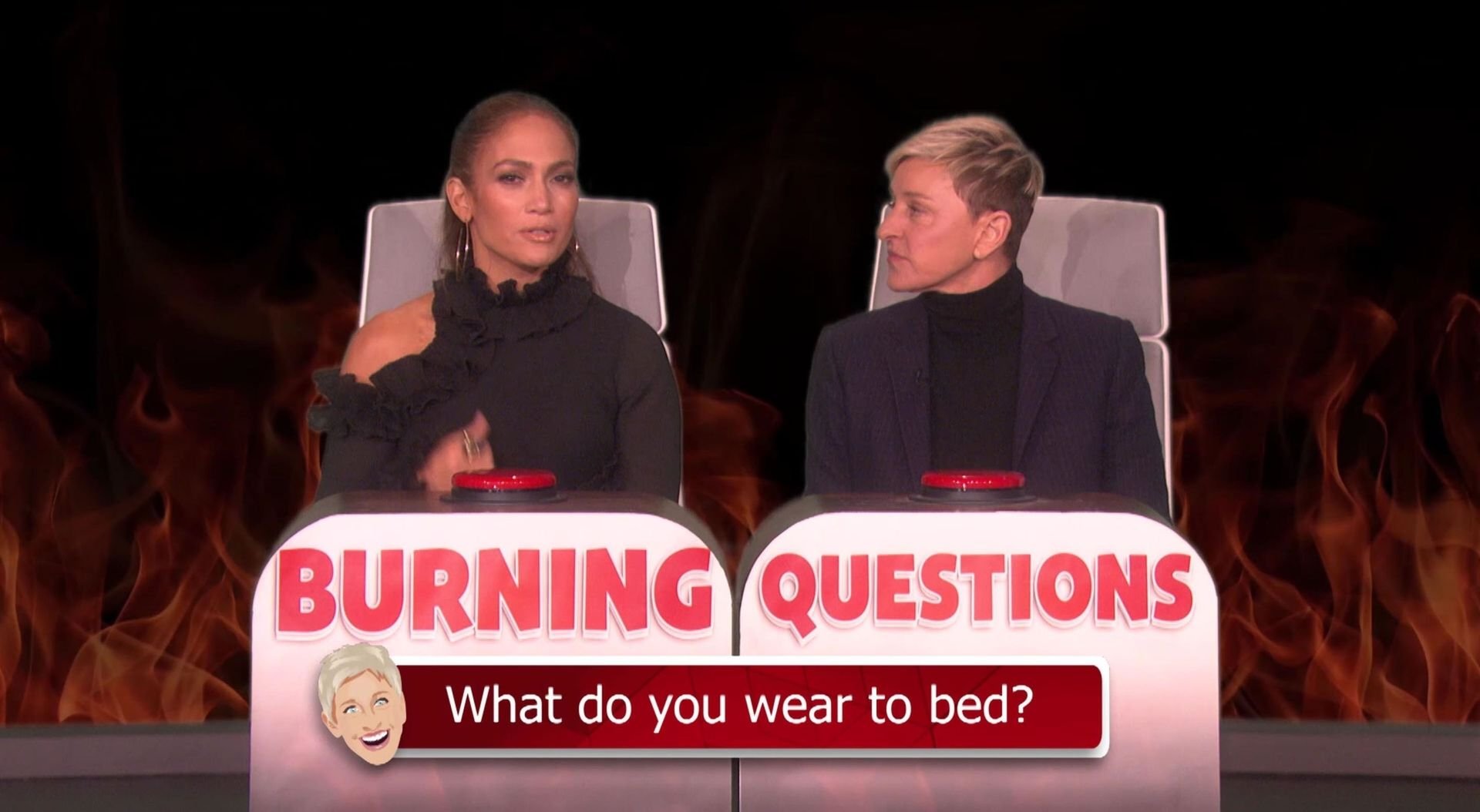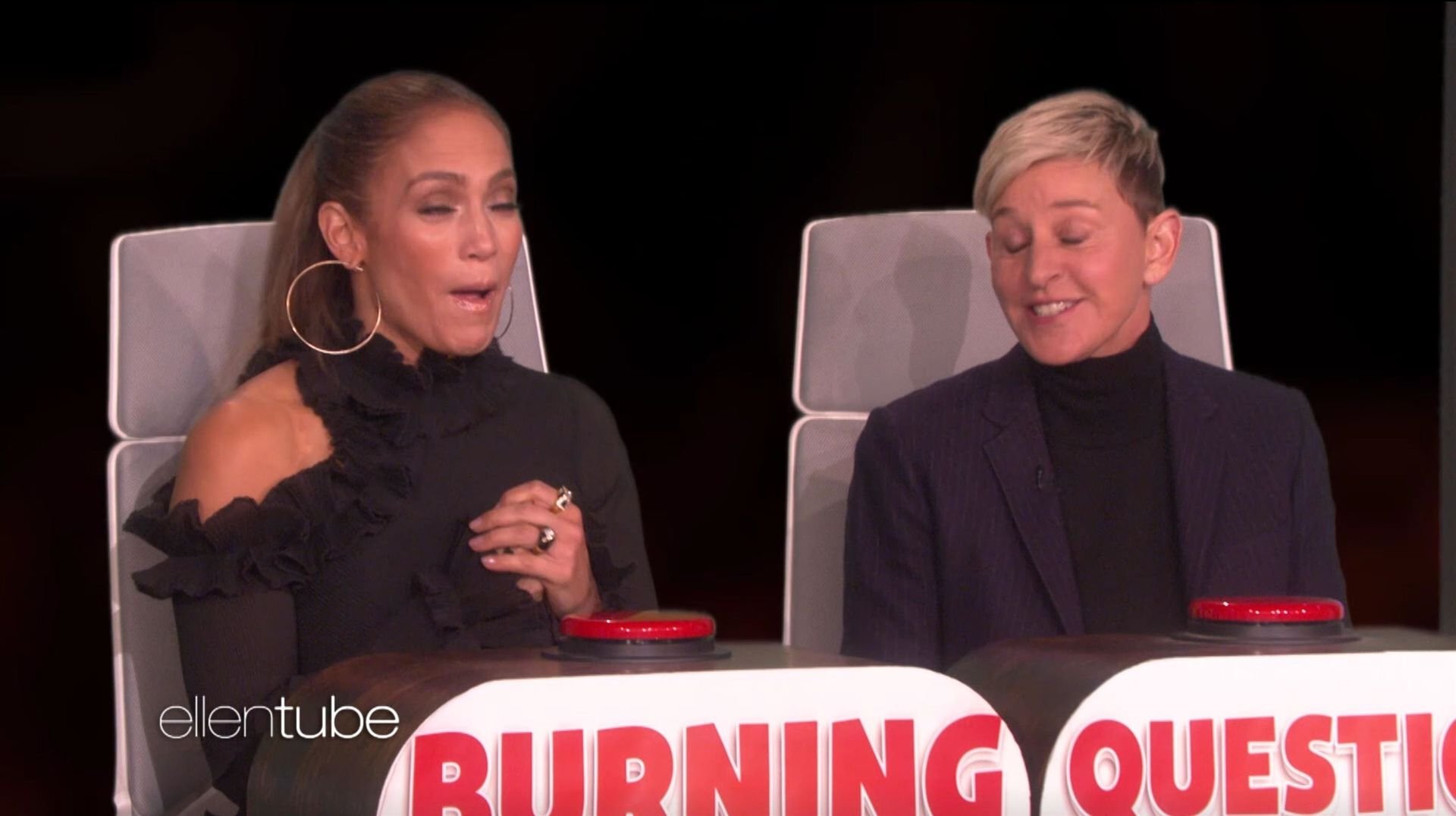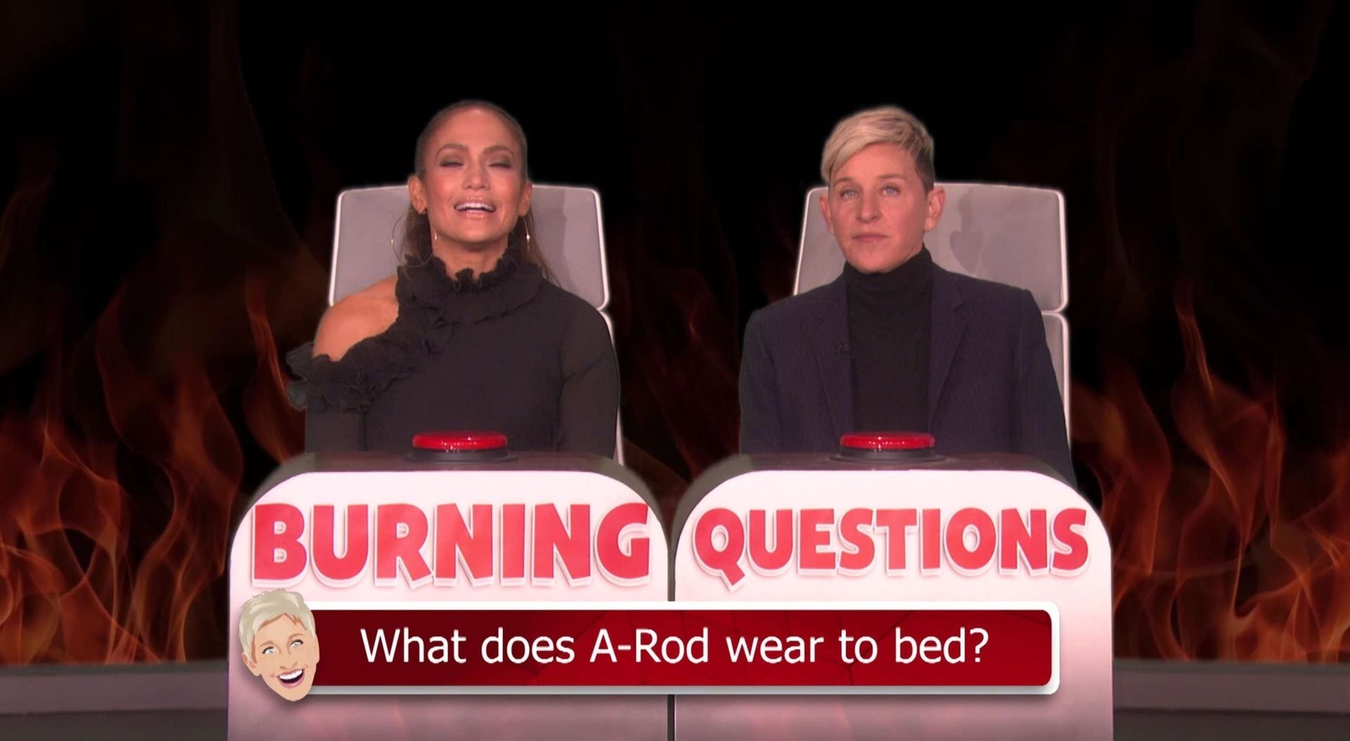 “Ma partie préférée d’A-Rod ? J’adore son pénis,” a dit Ellen. “Oui.” “Tu es une personne malade,” a dit Jennifer entre deux éclats de rire. “Tu es une personne malade. Wow.” Il y a eu beaucoup d’autres questions, mais tout est revenu au point de départ avec la dernière question d’Ellen : “Quelle est une chose idiote dont tu as peur ?” La réponse de J-Lo fut les rats, disant à Ellen qu’ils sont ‘dégueulasses’. Mais Ellen a répondu : “J’ai peur du pénis d’A-Rod. C’est toujours ma chose préférée, et pourtant j’en ai peur.” Lopez a répondu à plusieurs autres questions pendant le jeu, révélant qu’elle porte un tee-shirt pour dormir tandis qu’A-Rod porte des sous-vêtements, qu’elle mange un cookie avant d’aller se coucher et qu’une habitude que Jen ne brisera probablement jamais est qu’elle est parfois en retard.