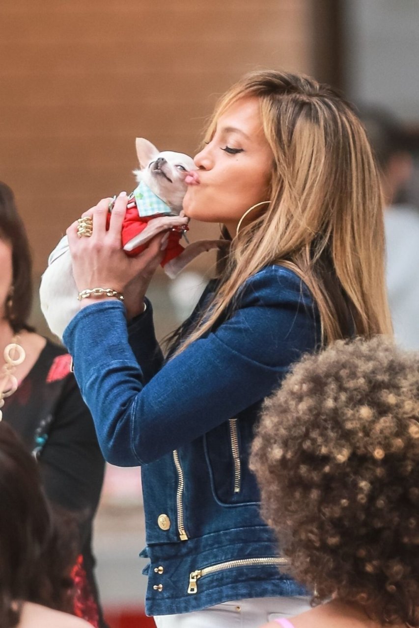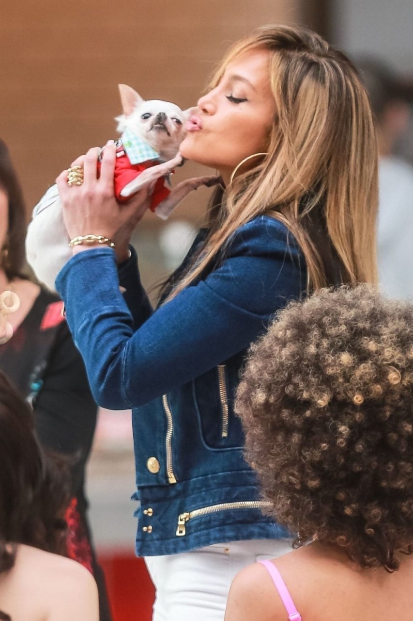 La chanteuse qui porte un jean blanc moulant affiche un piercing sous les lèvres tout en sirotant une boisson à côté de Constance Wu. J-Lo câline aussi malicieusement un petit chiot et lui donne des bisous bien que le chiot semble rejeter l’affection de J-Lo.