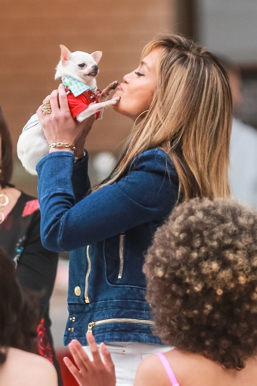 La chanteuse qui porte un jean blanc moulant affiche un piercing sous les lèvres tout en sirotant une boisson à côté de Constance Wu. J-Lo câline aussi malicieusement un petit chiot et lui donne des bisous bien que le chiot semble rejeter l’affection de J-Lo.