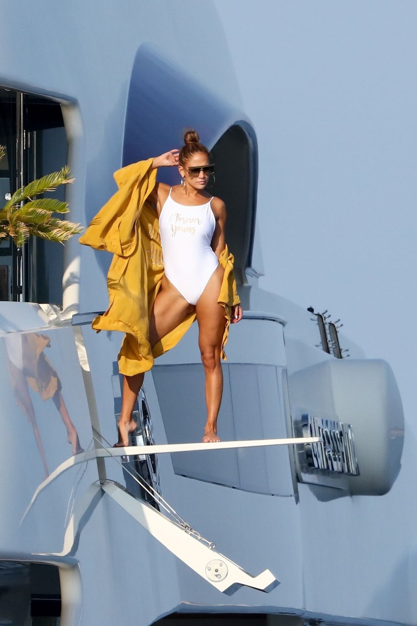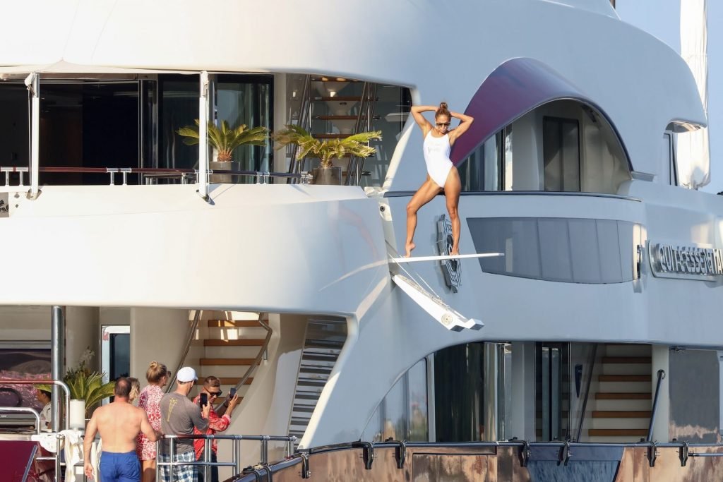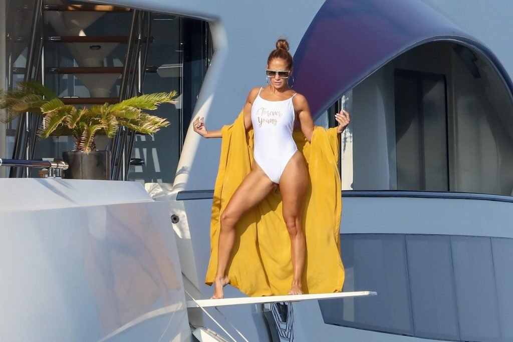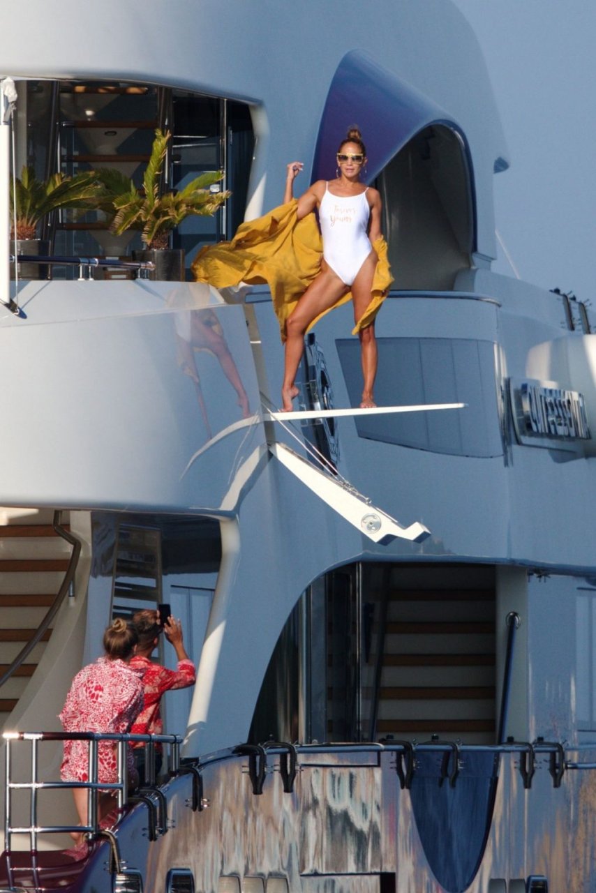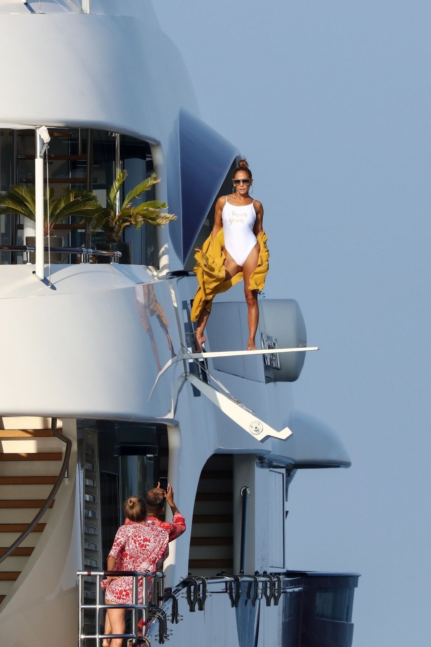 Jennifer Lopez pose pour une séance photo au-dessus d’un plongeoir sur le pont de son yacht au large de Saint-Tropez, 03/09/2019.