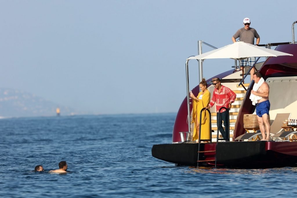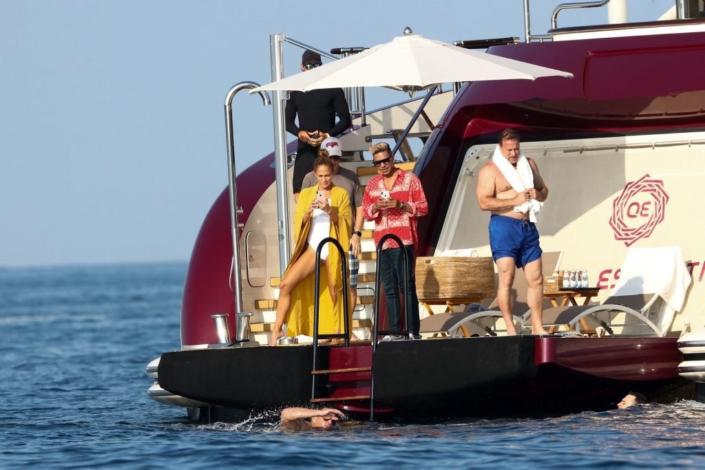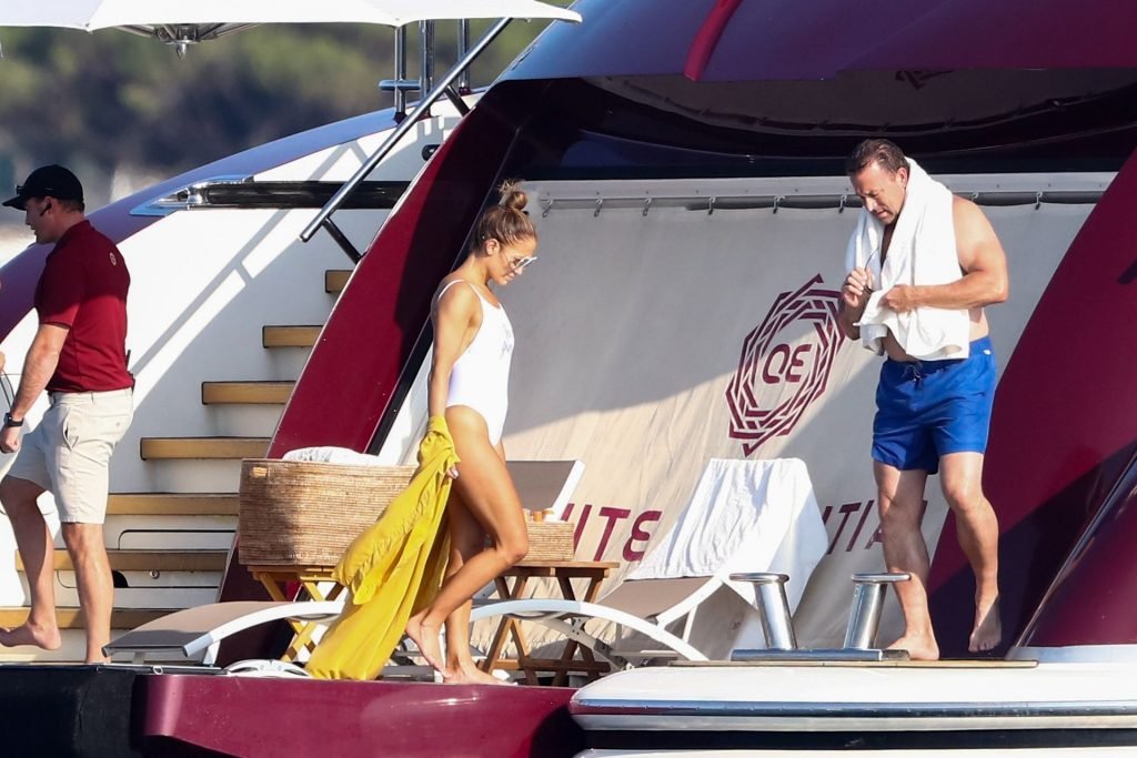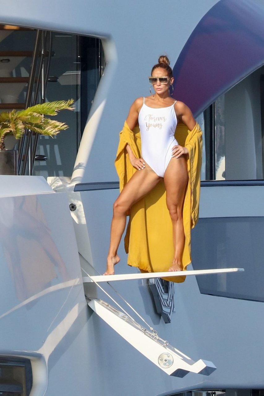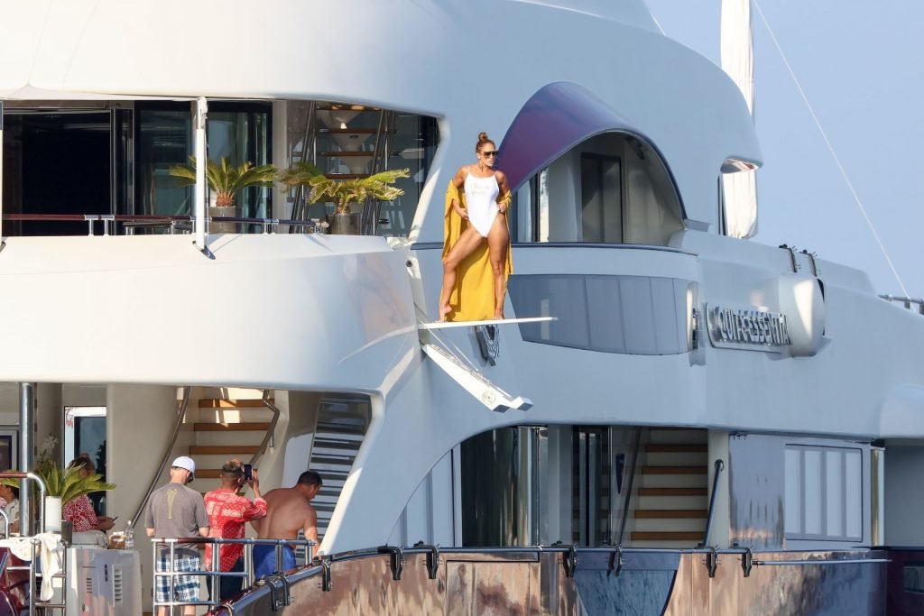 Jennifer Lopez pose pour une séance photo au-dessus d’un plongeoir sur le pont de son yacht au large de Saint-Tropez, 03/09/2019.