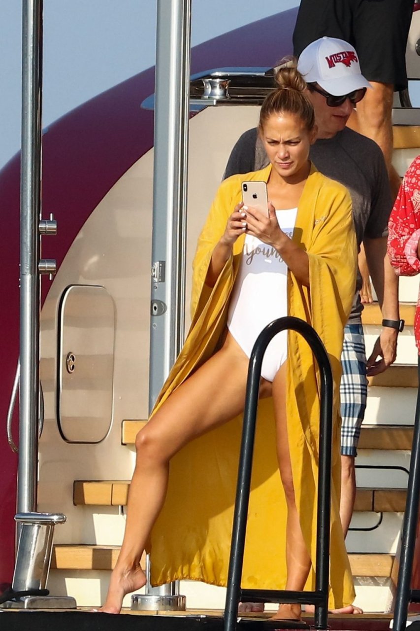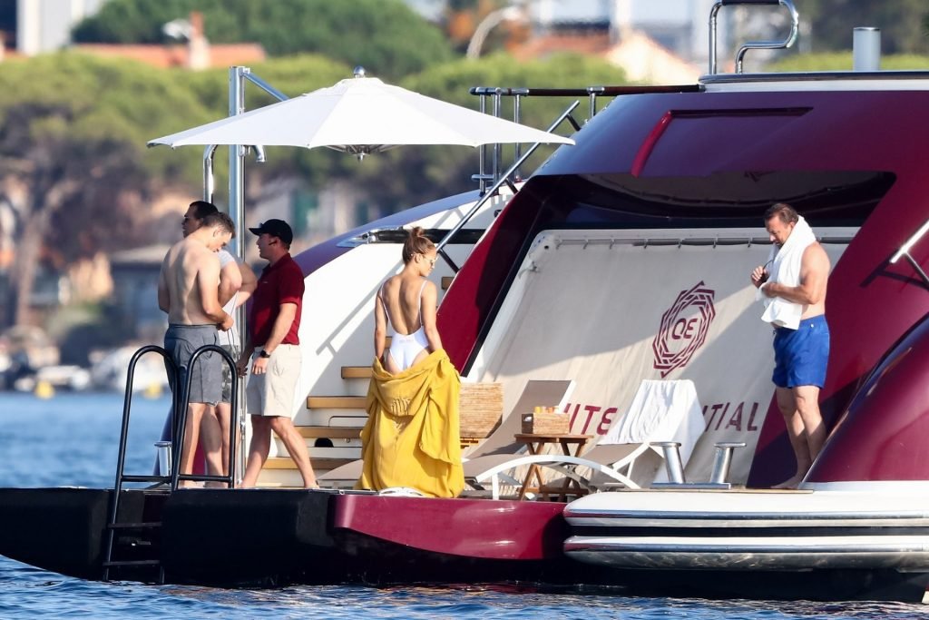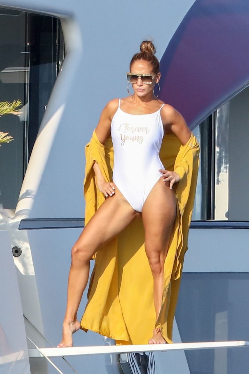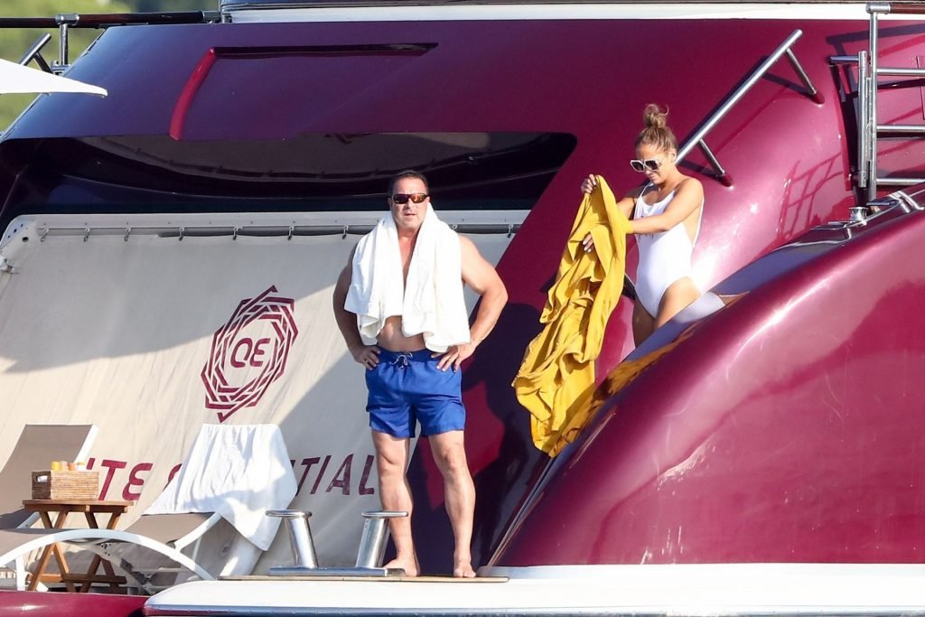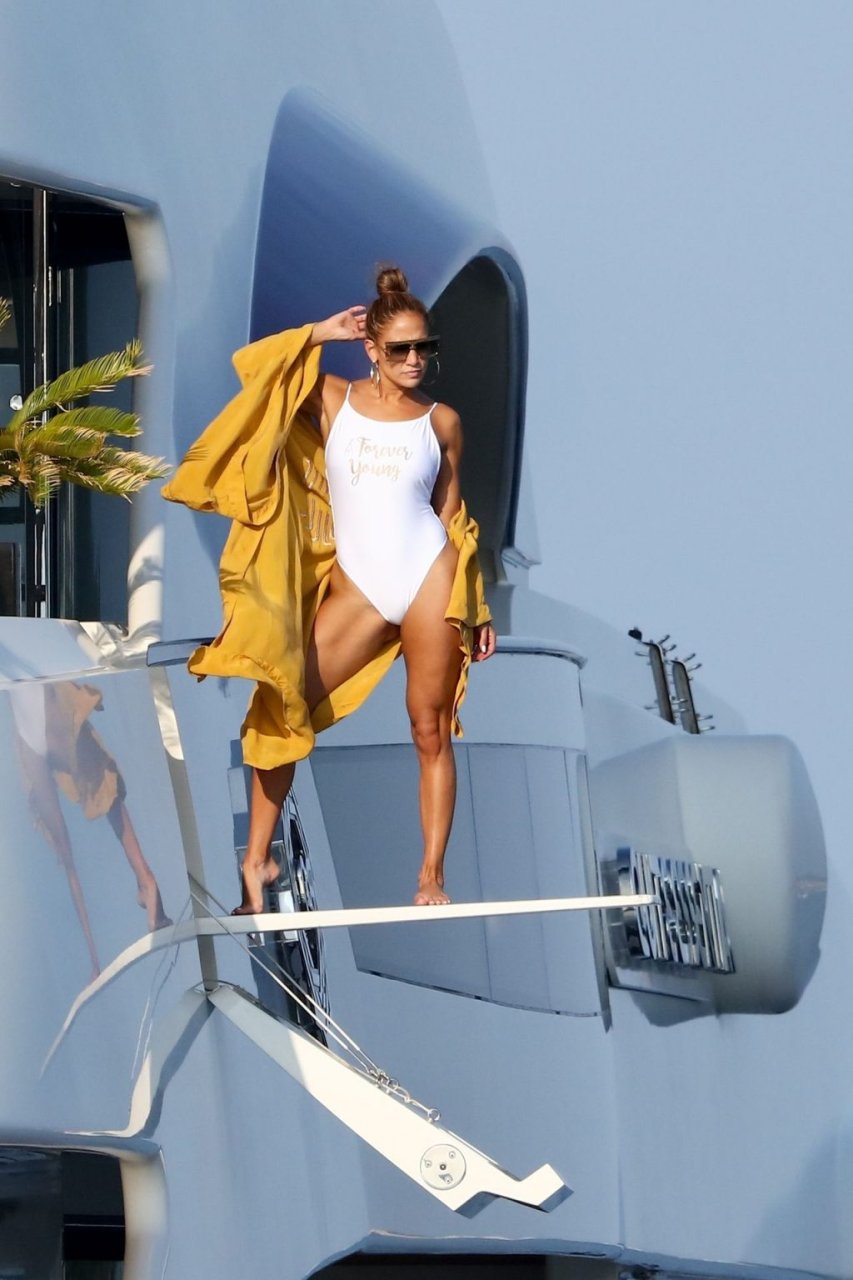 Jennifer Lopez pose pour une séance photo au-dessus d’un plongeoir sur le pont de son yacht au large de Saint-Tropez, 03/09/2019.