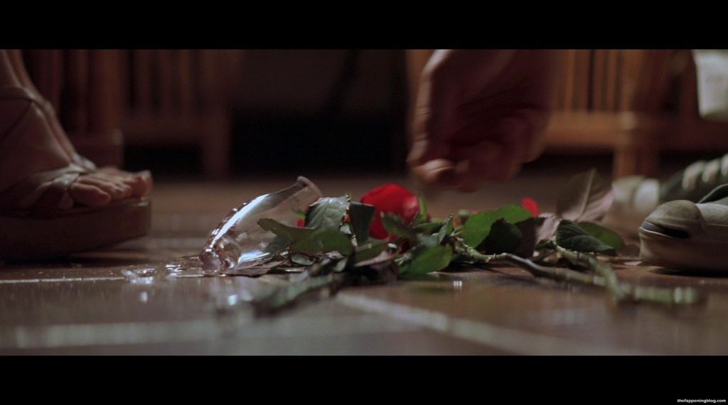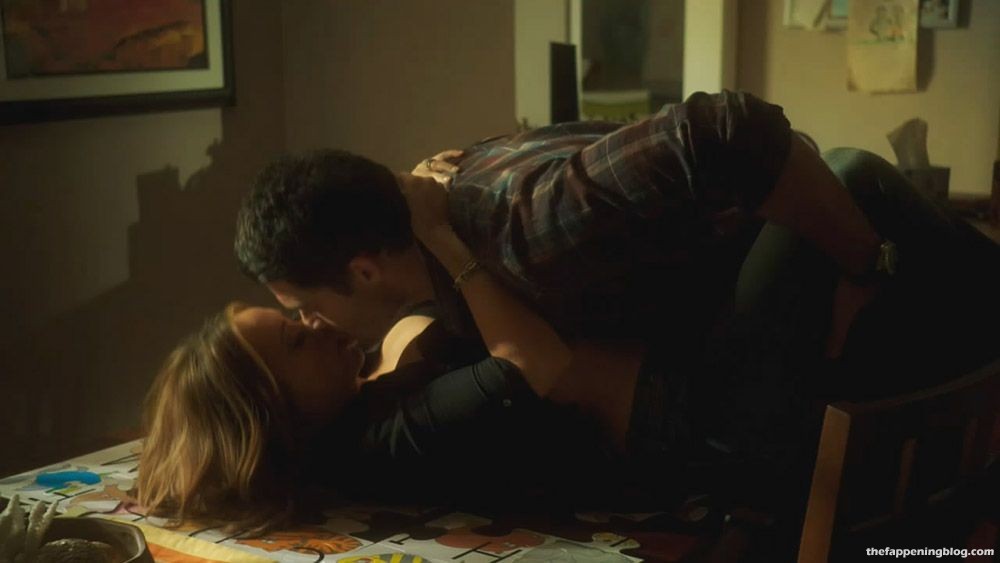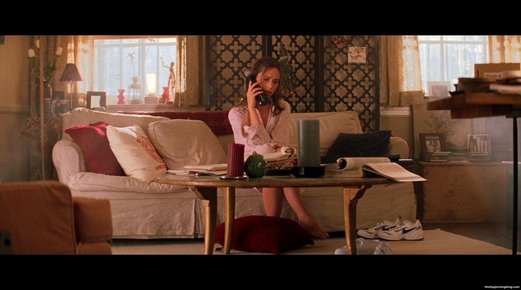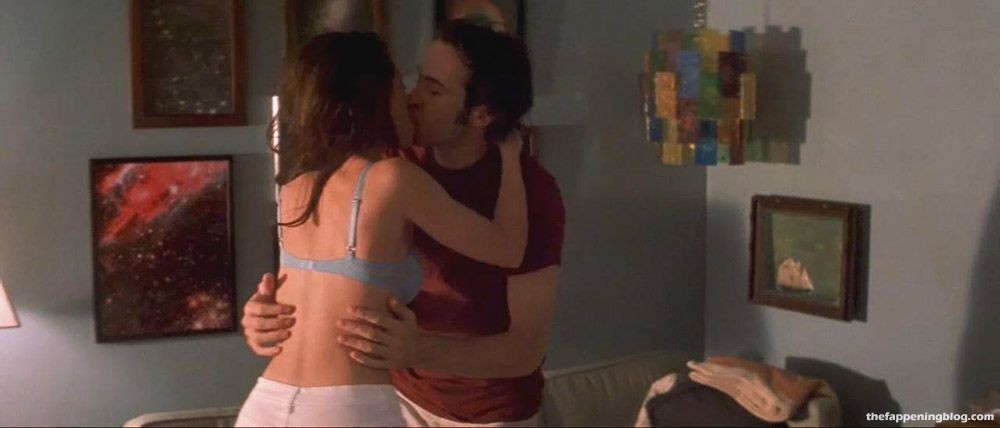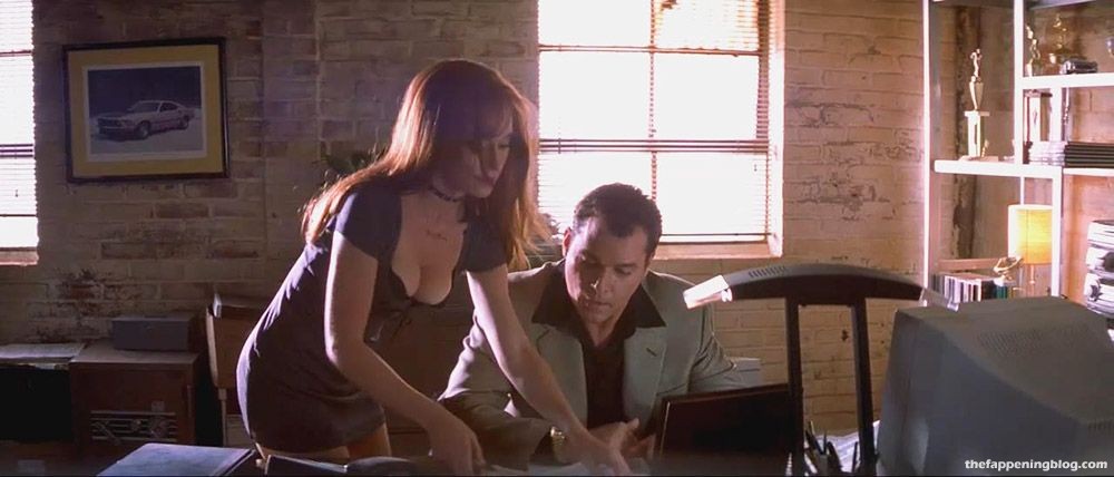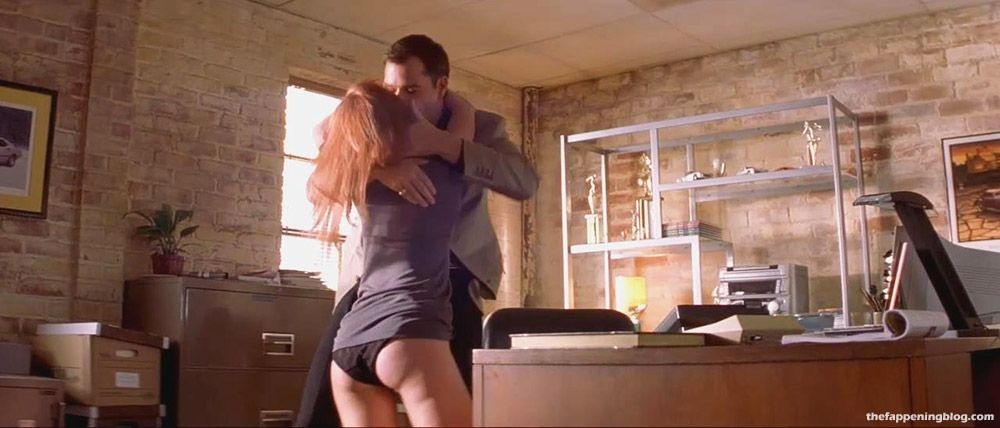 Jennifer Love Hewitt is seen wearing a low-cut short grey dress. It showed off her legs and butt as she bent over in a guy’s office. She then approaches his desk and leans over. Love’s giving him a great view of her cleavage in close-up. She then pretends to drop the papers and bends over on the floor. Hewitt is kneeling as the guy then kisses her. Finally, she jumps into his arms with her legs wrapped around him. Her butt is in her panties in view.