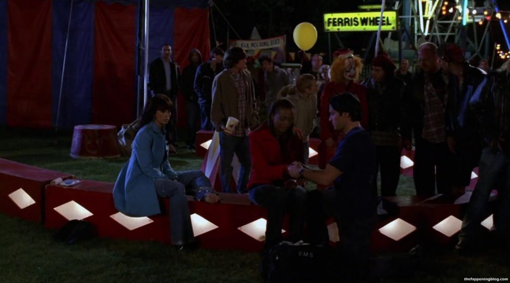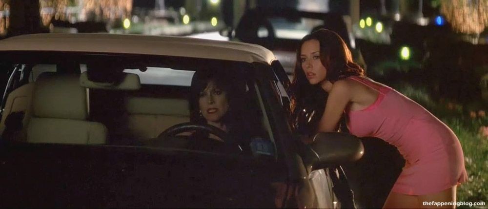 Then hot Jennifer Love Hewitt is showing cleavage in a revealing short pink dress. She squats by a road and rolls out some tire spikes to cause a car accident. Hewitt then walks over to the crashed car and talks to a guy for a while. Then she pushes him out of view when another car approaches, flashing her panties.