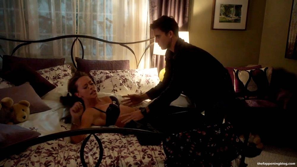 Then Jennifer Love Hewitt is in tight leather pants, as the man carries her into a house and a bedroom. And lays her on the bed and then Jennifer is trying to remove her top.