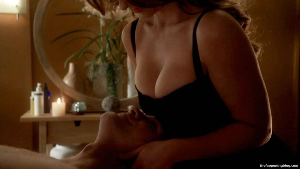 Jennifer Love Hewitt is giving us some great looks at her impressive cleavage in a low-cut black bustier. She walks around a table massaging and talking with the man before ending up with her breasts against his head.