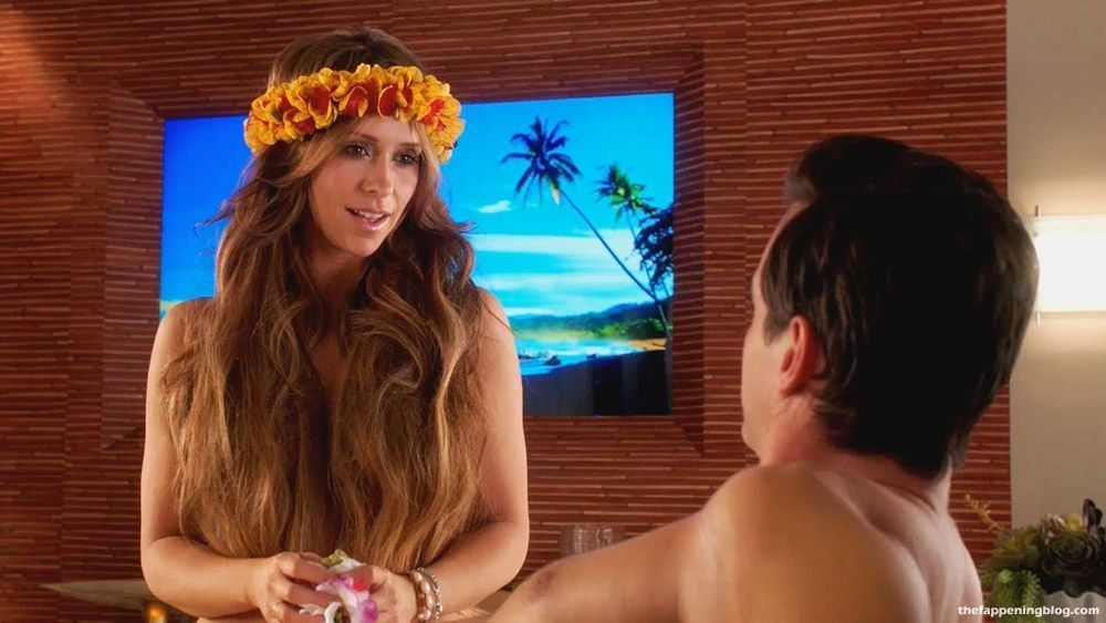 Then Jennifer Love Hewitt is seen topless in a grass skirt and nothing else with her bare back to a guy. She shakes her hips side to side.