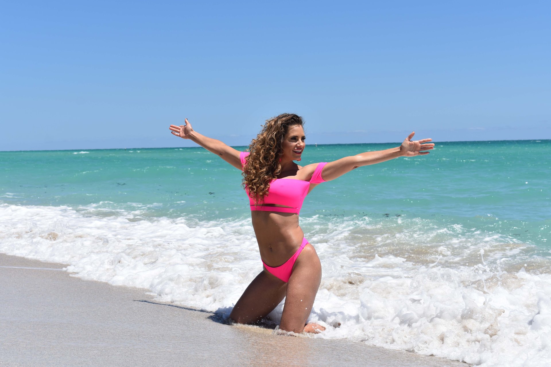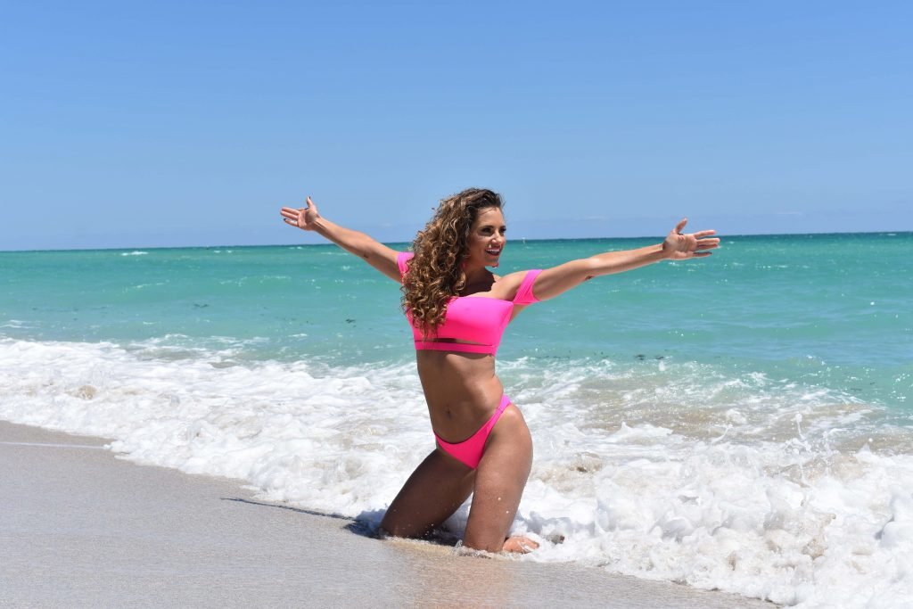 Modèle fitness et coach de vie Jennifer Nicole Lee, 42 ans, réalise une nouvelle séance photo en bikini rose sur la plage de Miami Beach, le 24/04/2018. La milf a exhibé son corps bronzé en l’honneur du nouveau numéro d’Ocean Magazine.