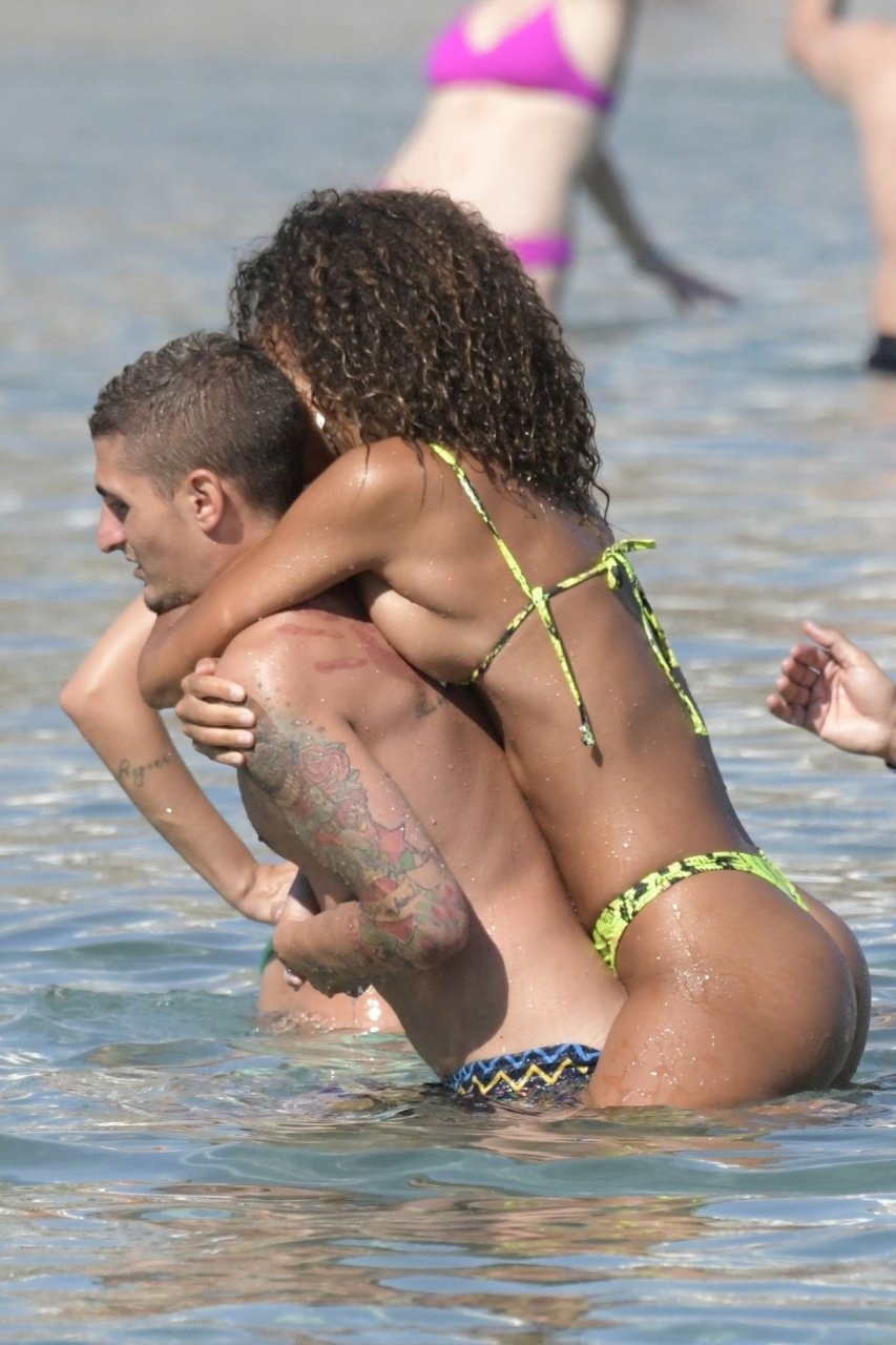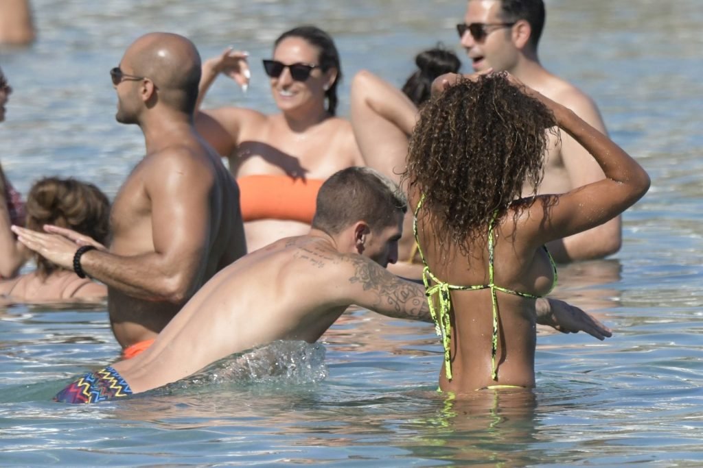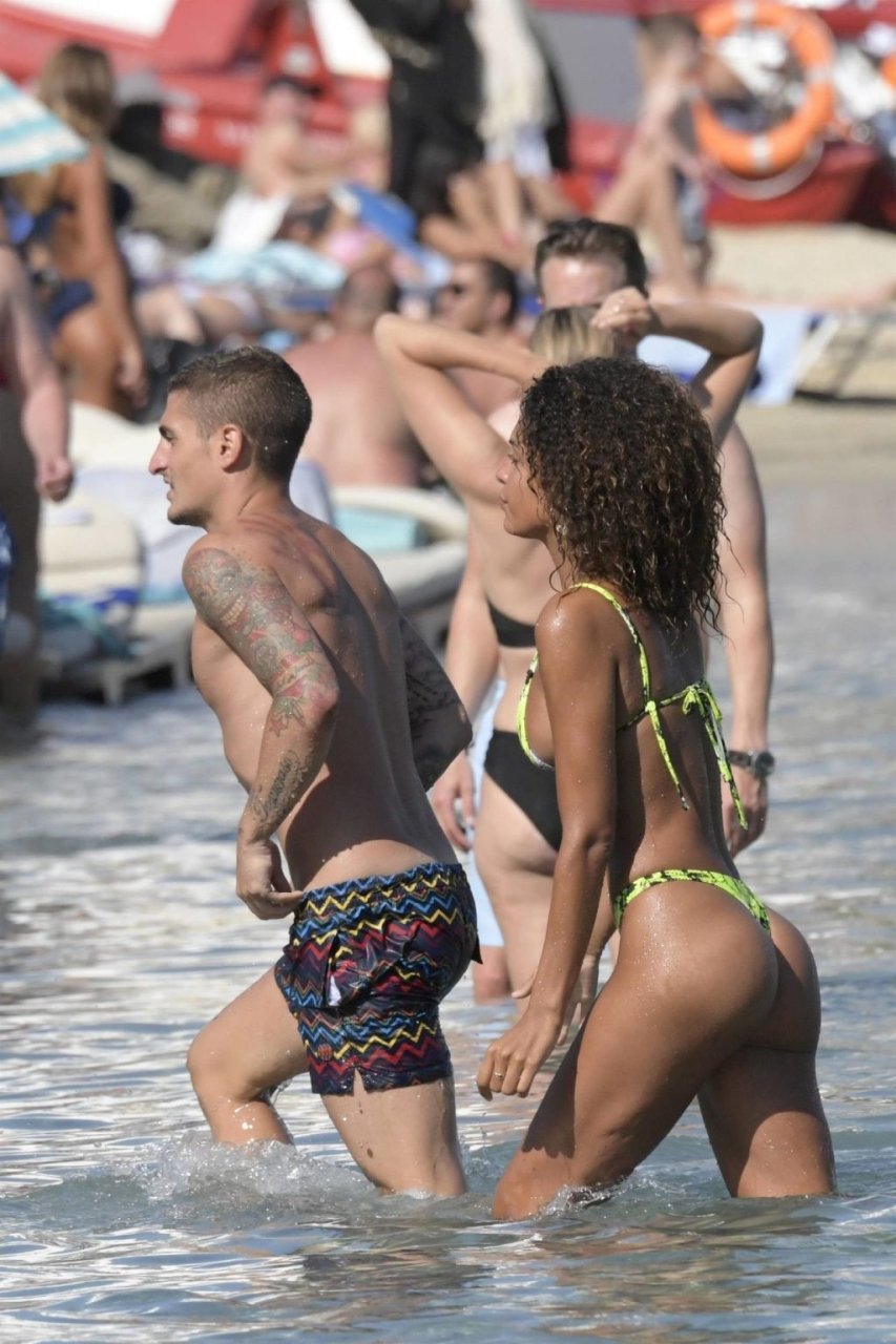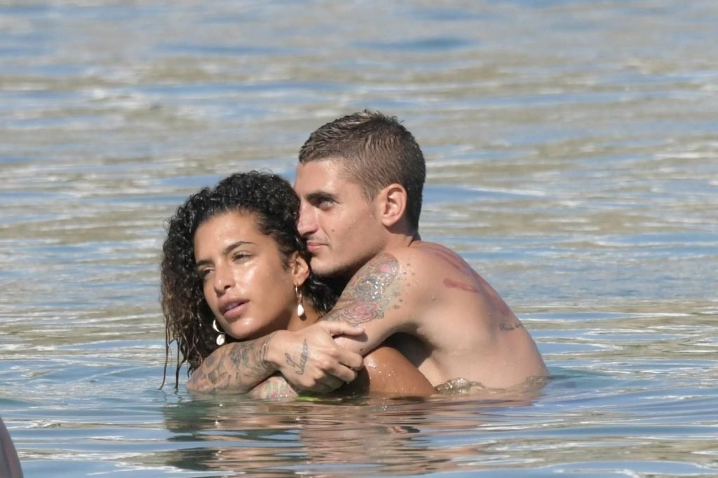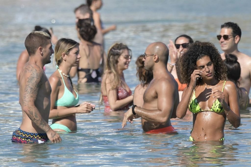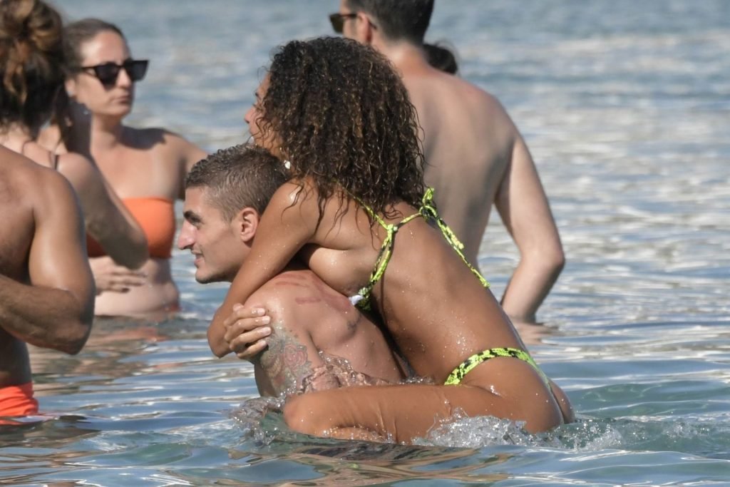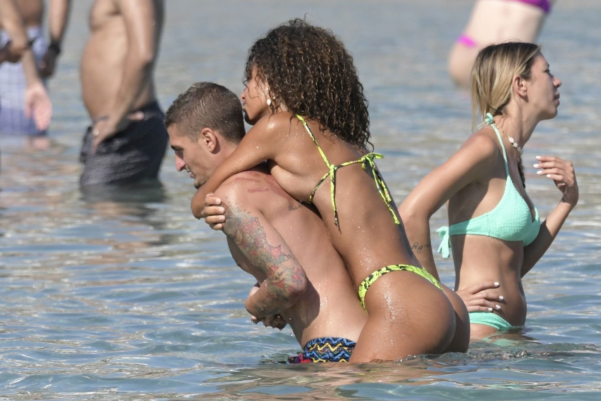 Le footballeur italien du Paris St. Germain, Marco Verratti, et Jessica Aidi profitent des vacances d’été sur l’île de Mykonos, 07/06/2019. Ils démontrent leur amour en faisant des éclaboussures sur la plage.