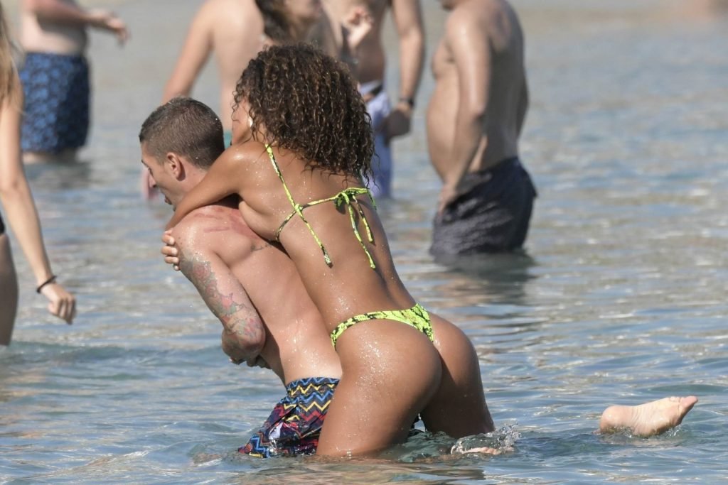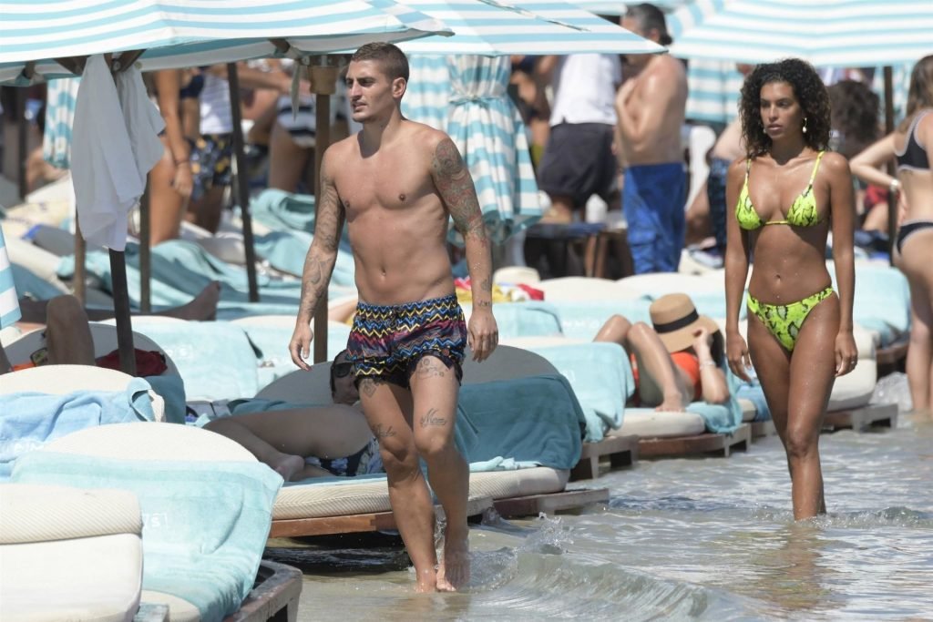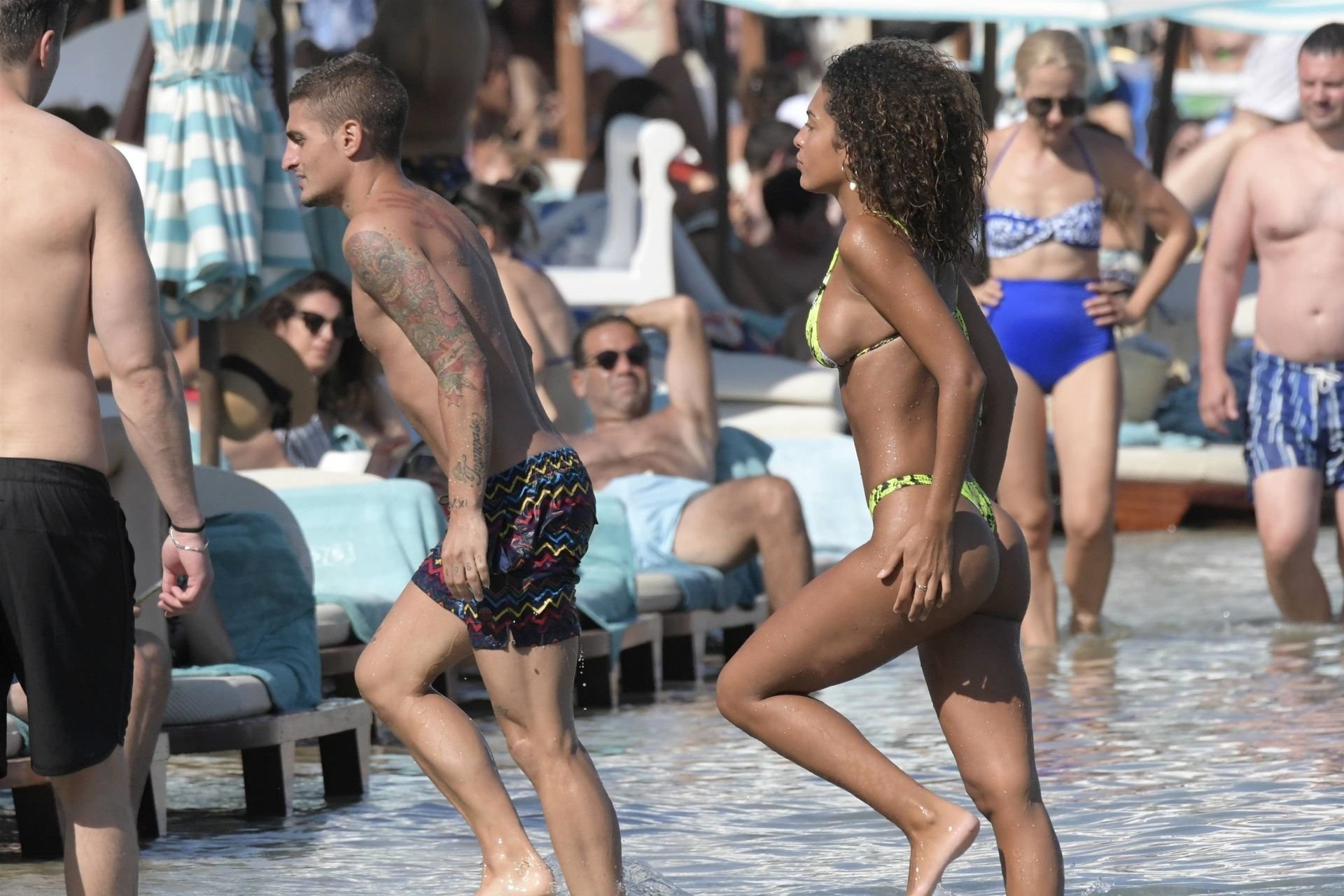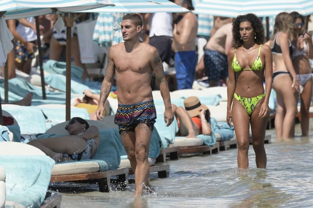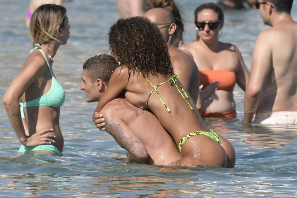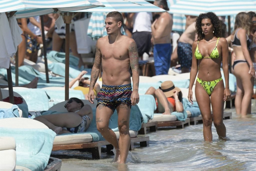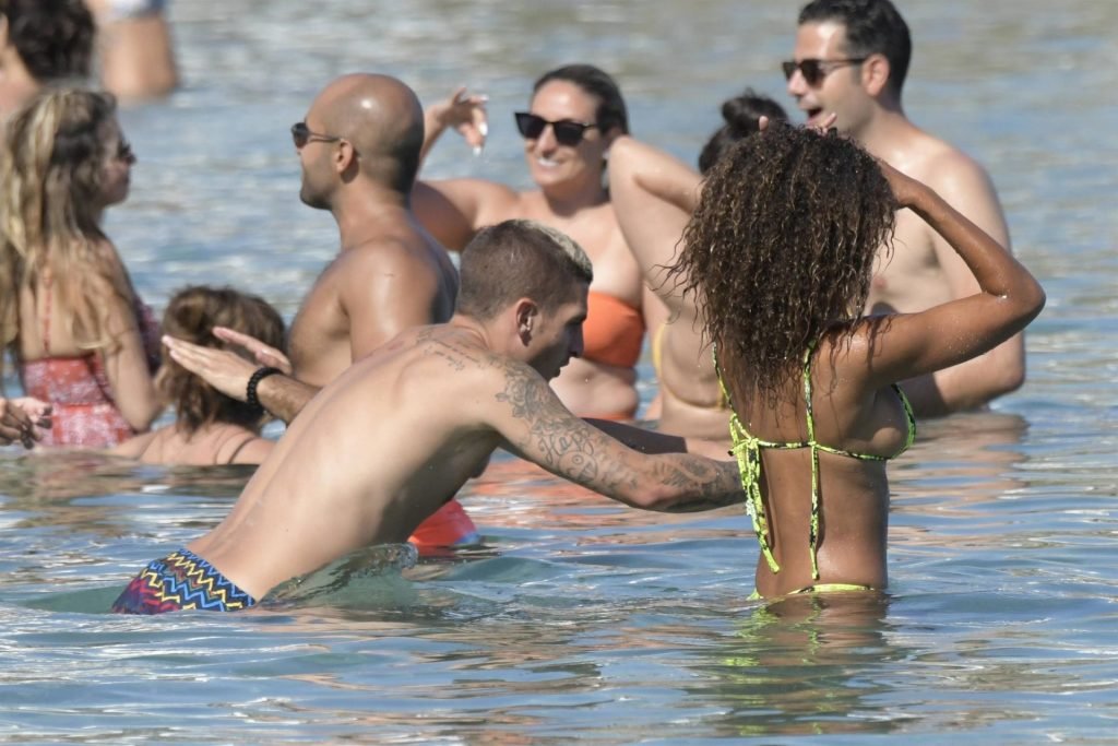 Le footballeur italien du Paris St. Germain, Marco Verratti, et Jessica Aidi profitent des vacances d’été sur l’île de Mykonos, 07/06/2019. Ils démontrent leur amour en faisant des éclaboussures sur la plage.