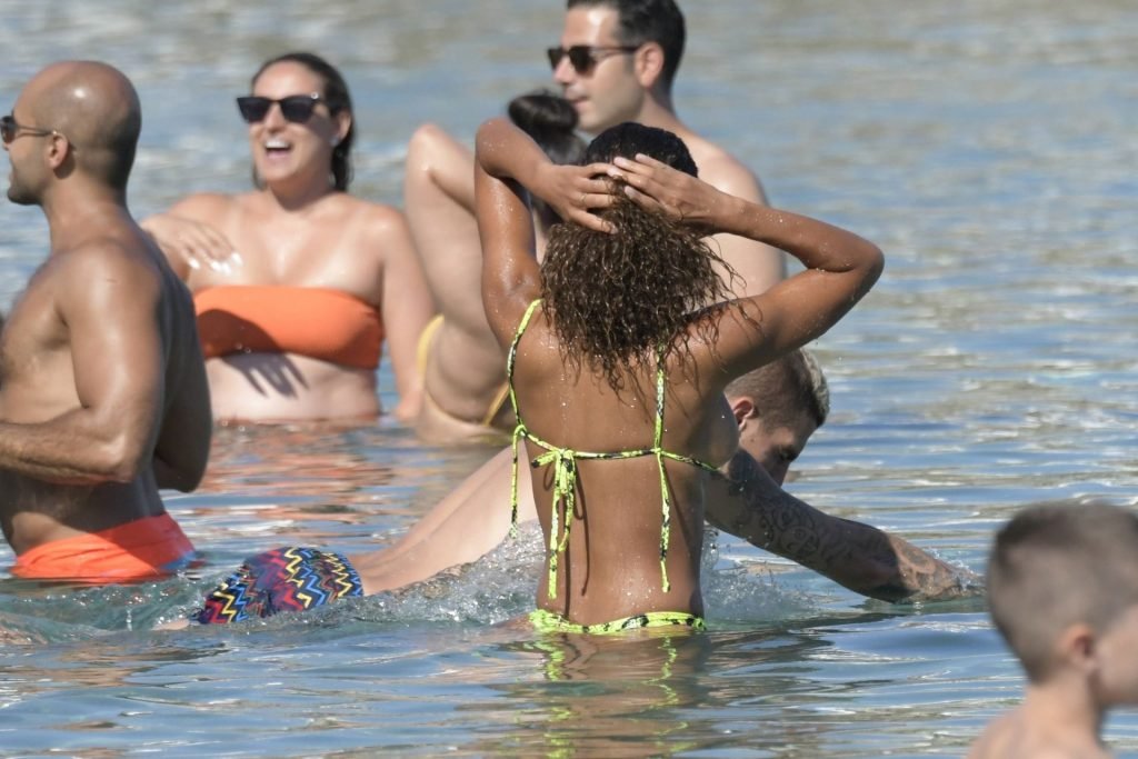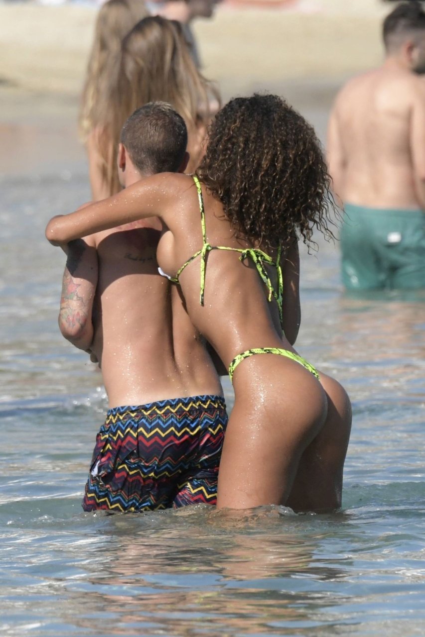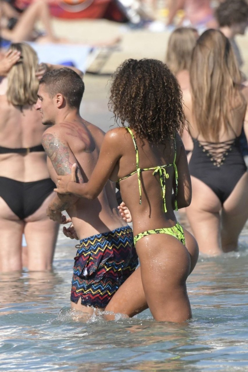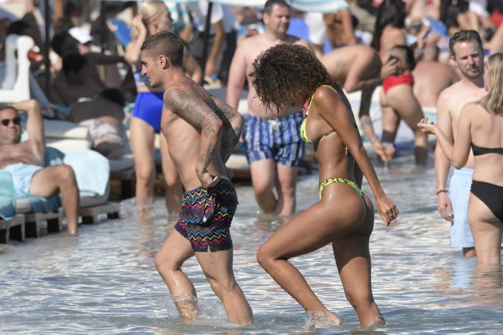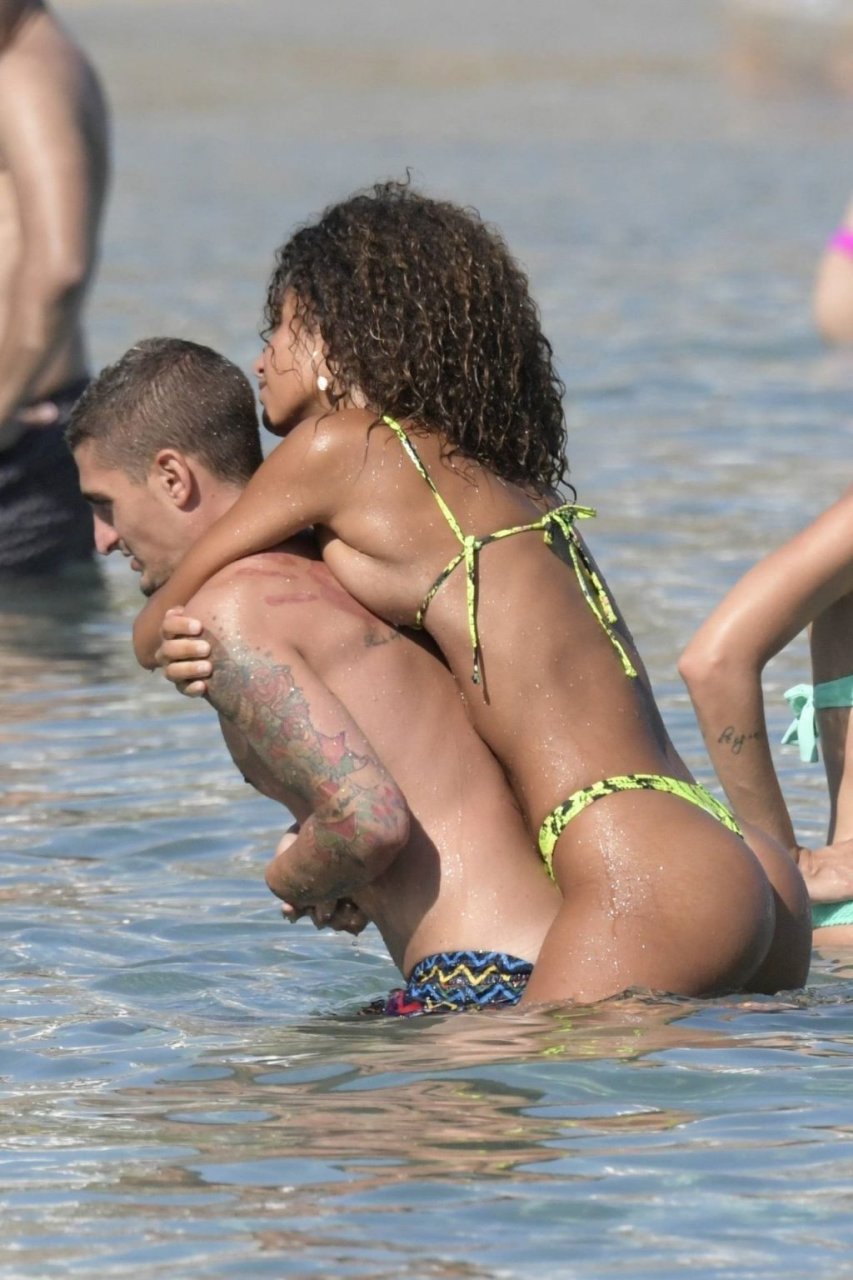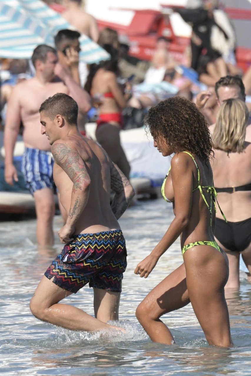 Le footballeur italien du Paris St. Germain, Marco Verratti, et Jessica Aidi profitent des vacances d’été sur l’île de Mykonos, 07/06/2019. Ils démontrent leur amour en faisant des éclaboussures sur la plage.