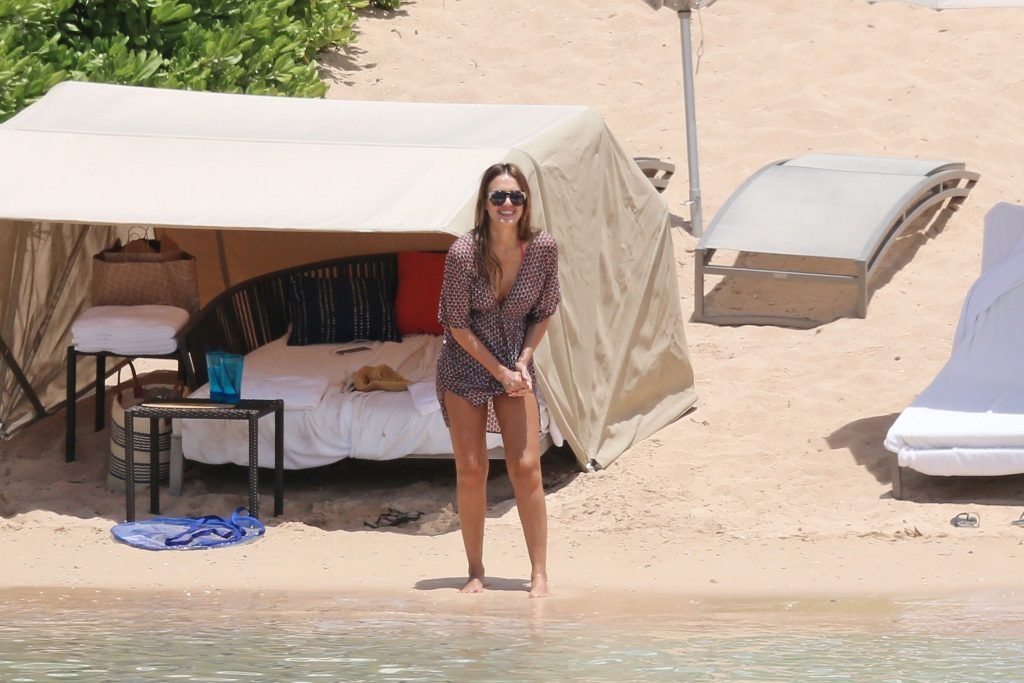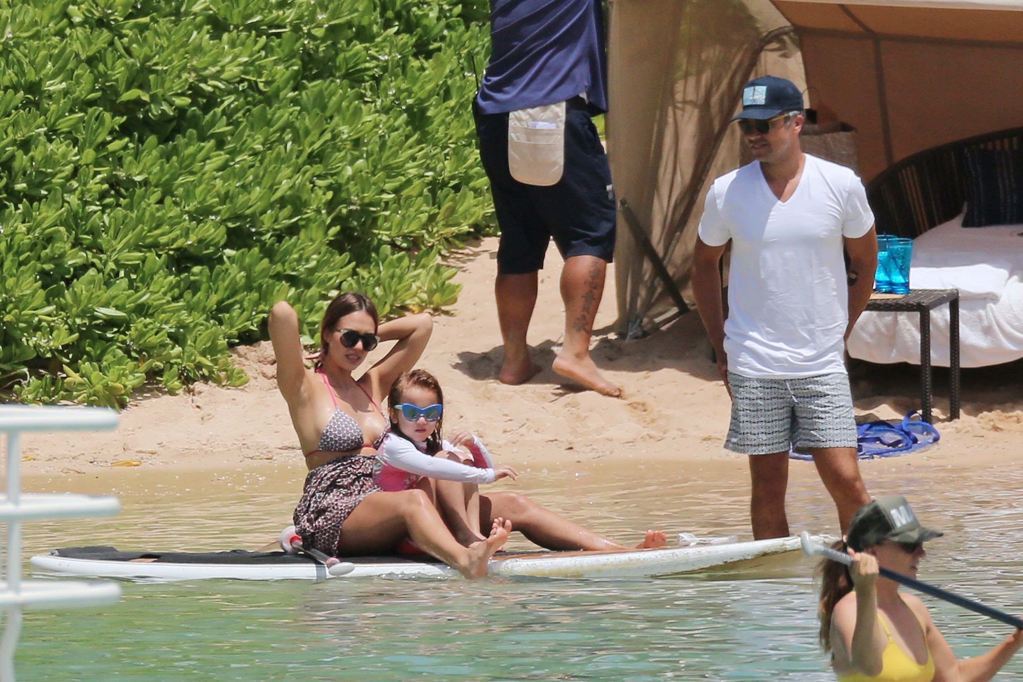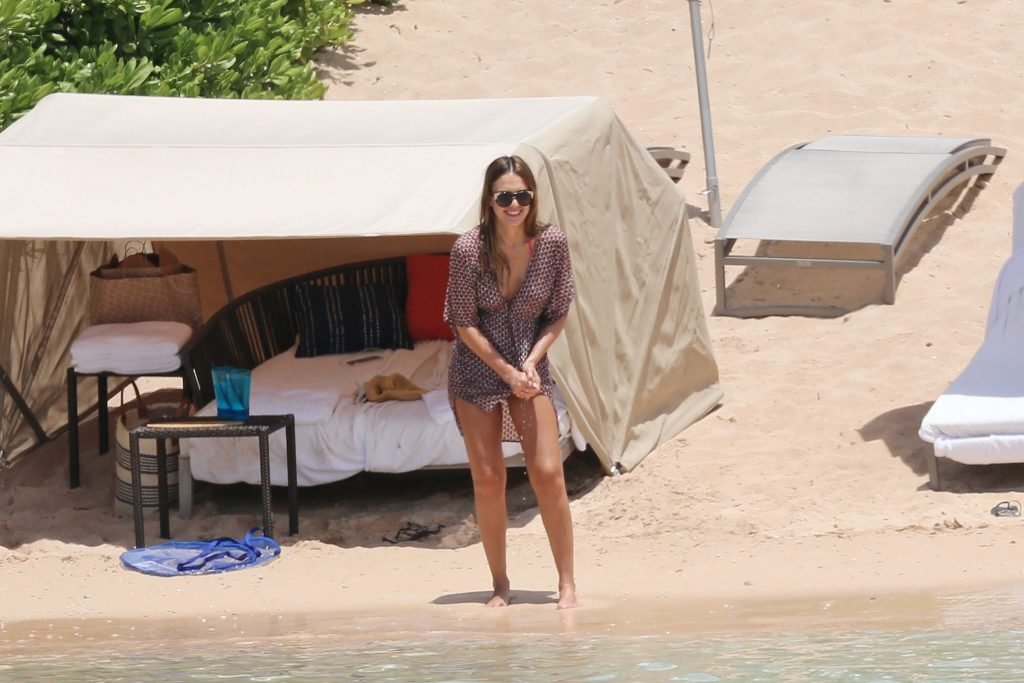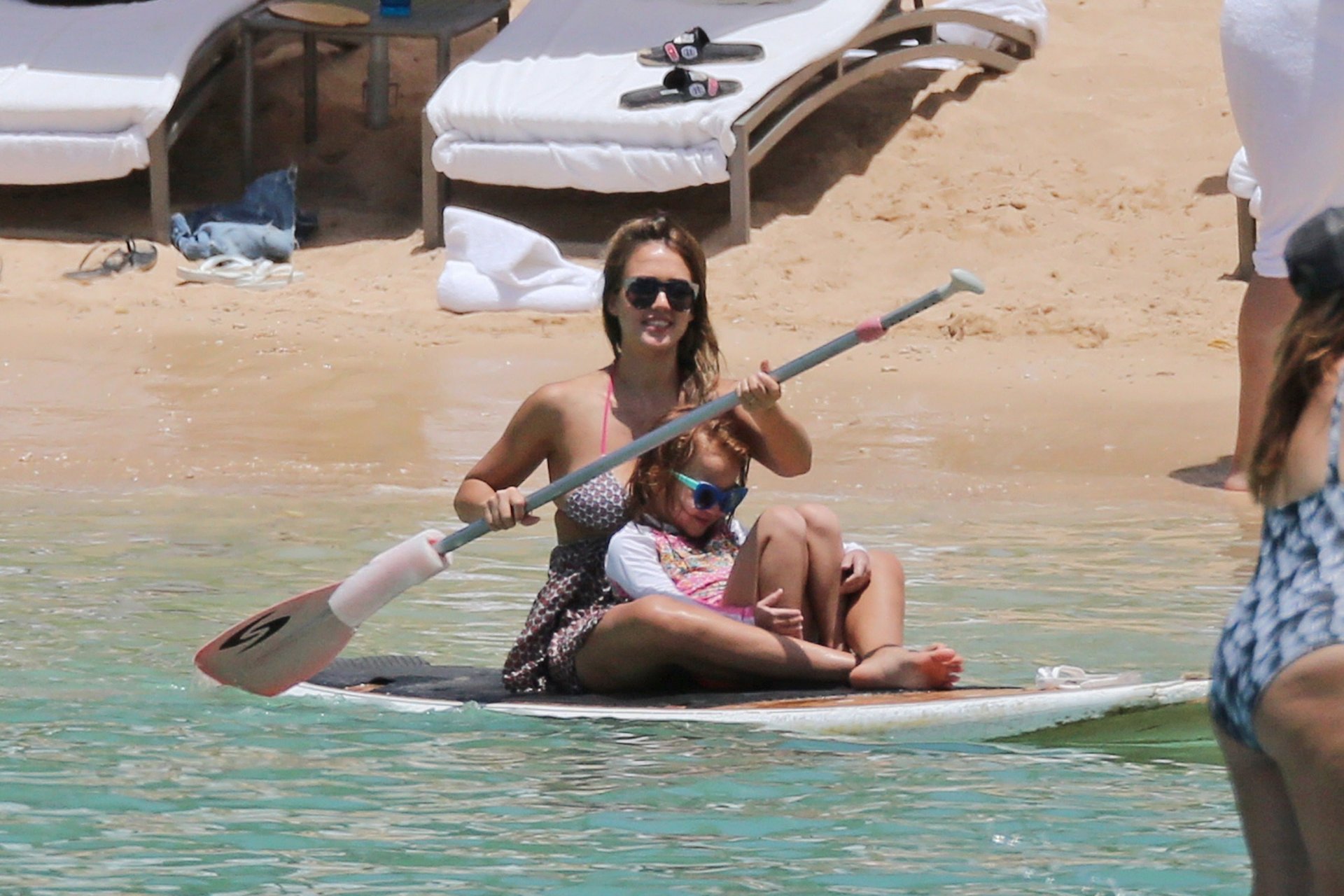 Jessica Alba profite de la plage avec un petit ventre de grossesse. La star brune est en vacances avec sa famille, 17/07/2017.