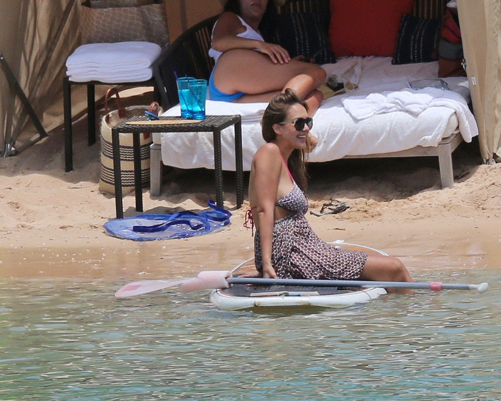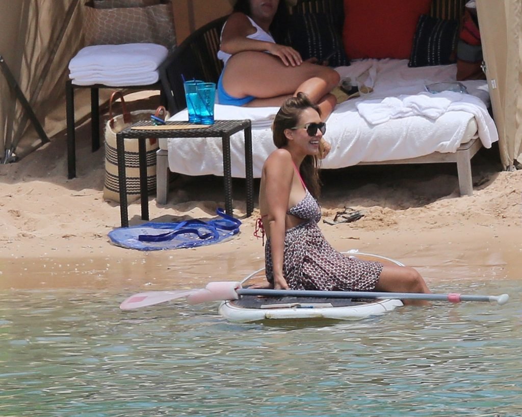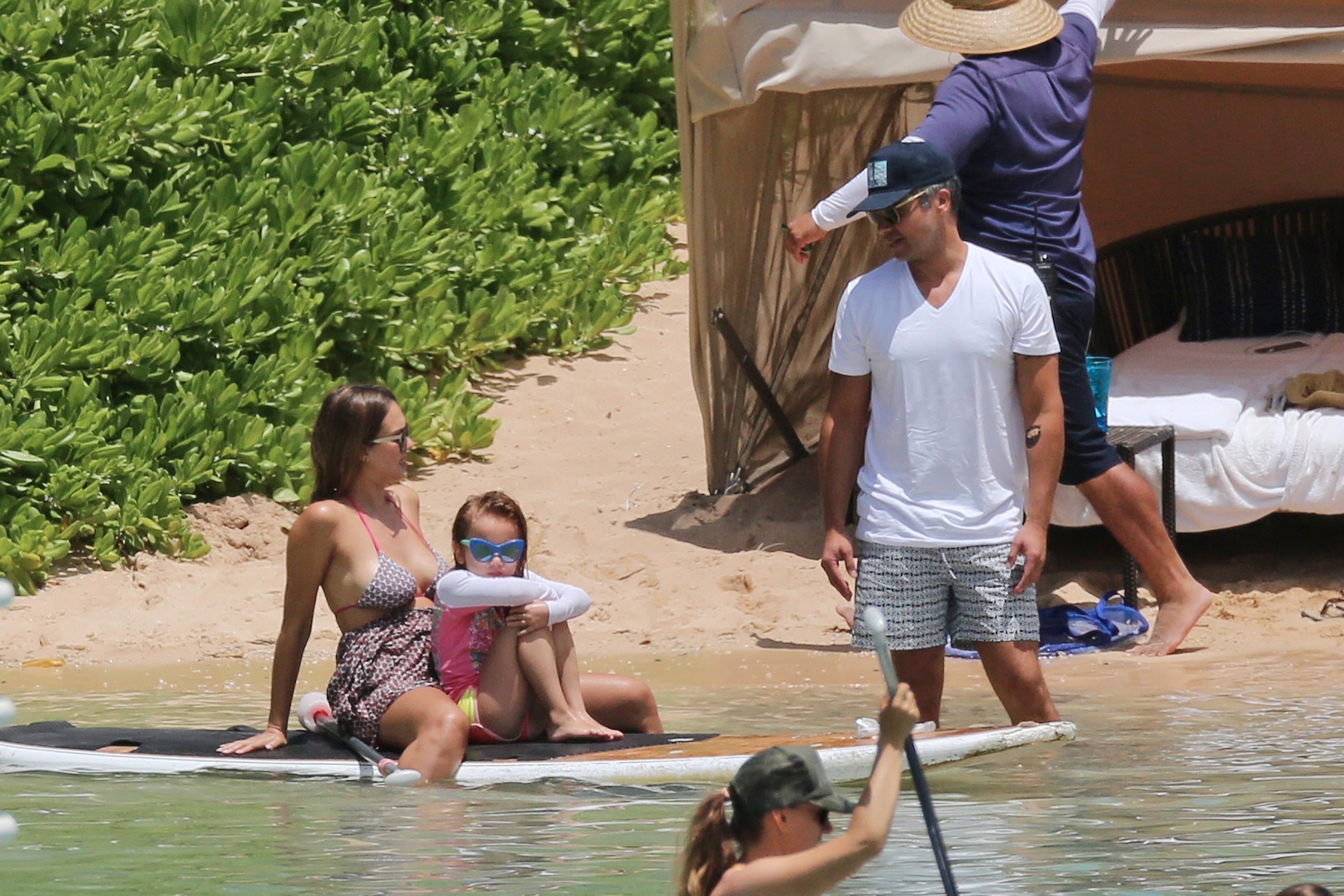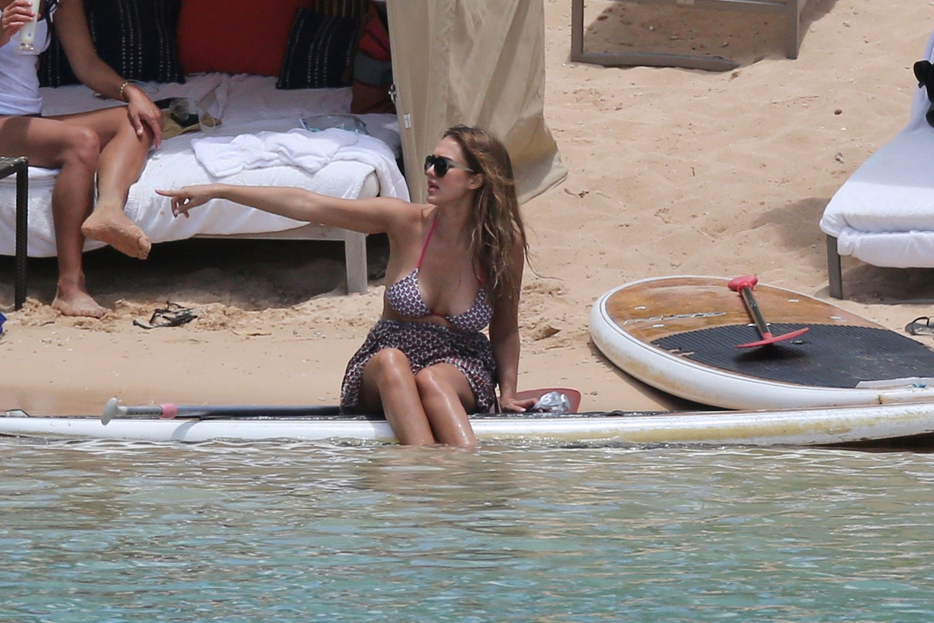 Jessica Alba profite de la plage avec un petit ventre de grossesse. La star brune est en vacances avec sa famille, 17/07/2017.