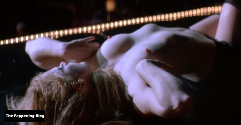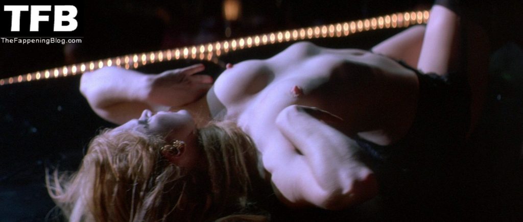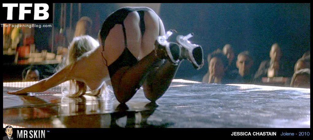 Jessica Chastain of Interstellar fame is performing a belly dance on a stage shaking her breasts wildly under her red top until they start to pop out causing her to rip off her top and bra and toss them to the side and then roll around on the ground topless continuing to shake and jiggle her breasts while arching her back until finally she collapses onto her back in exhaustion giving us a much better look at her breasts as she breathes heavily all while a group of people on a stage watch her and talk.