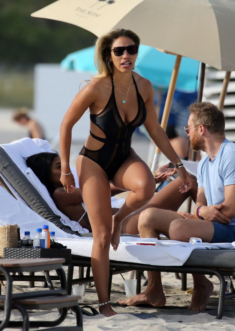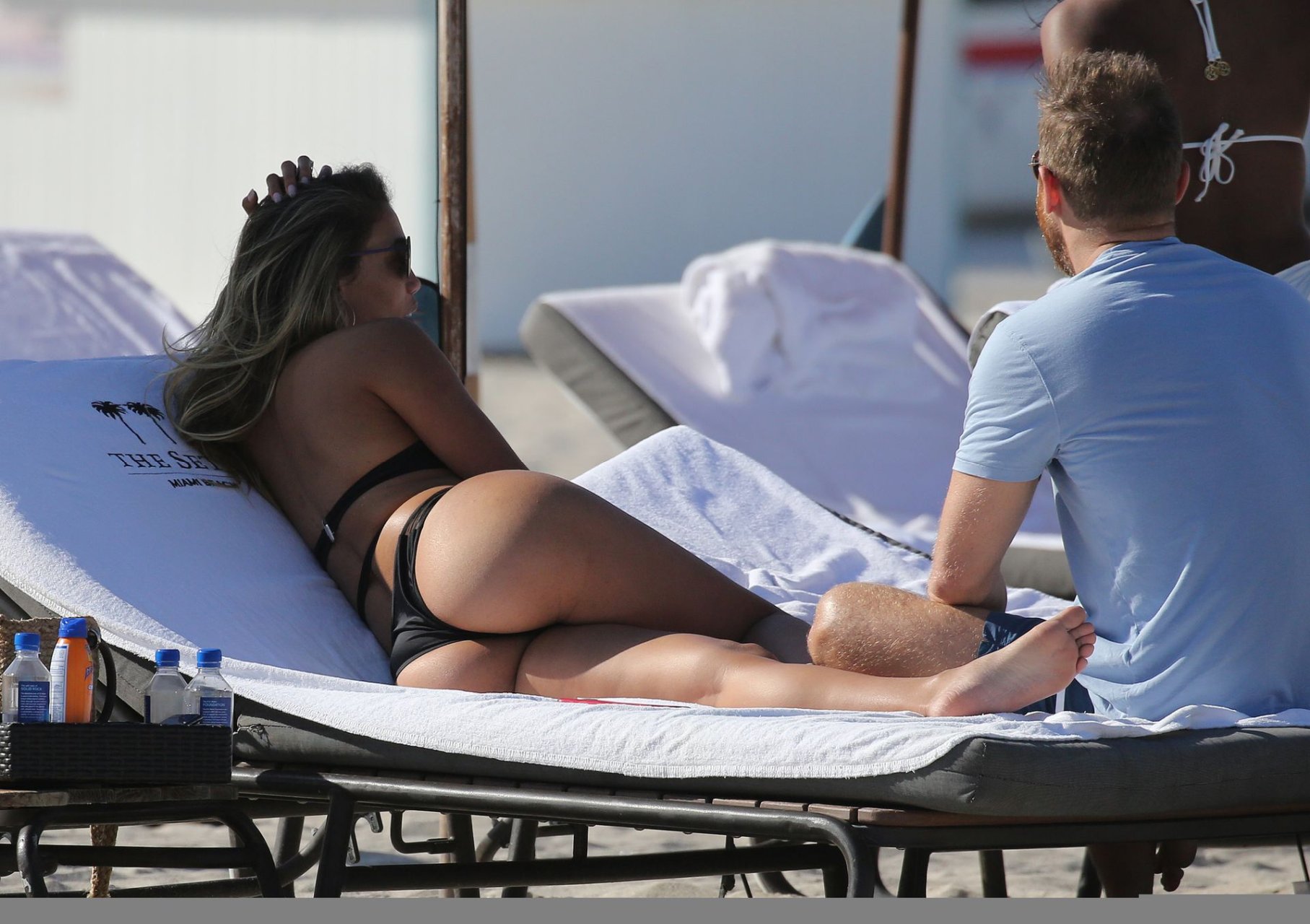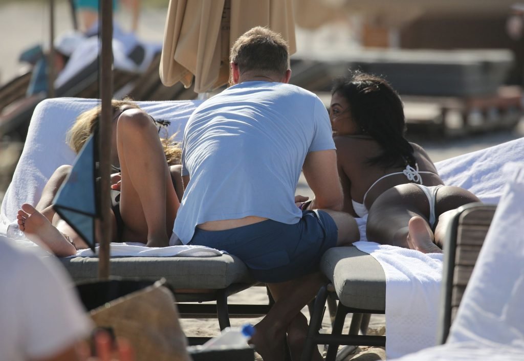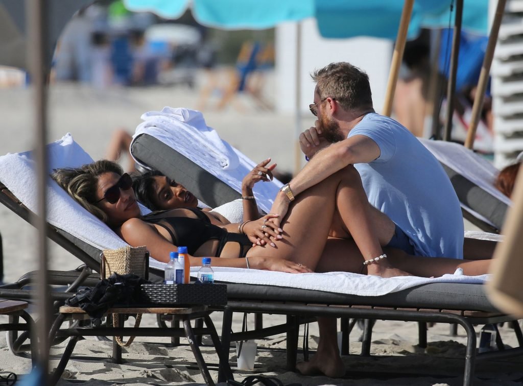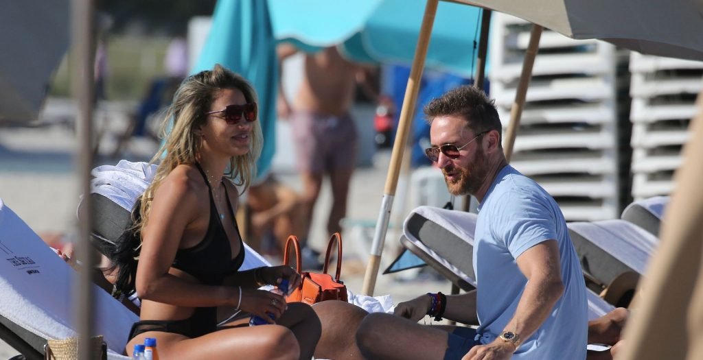 Le DJ mondialement connu David Guetta ne peut pas garder ses mains loin de sa petite amie Jessica Ledon sur la plage de Miami, 30/03/2019.