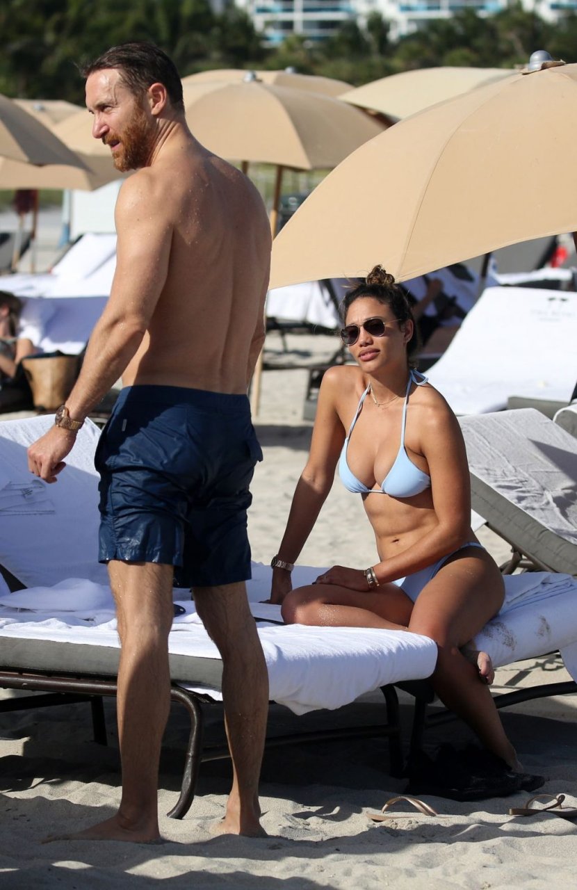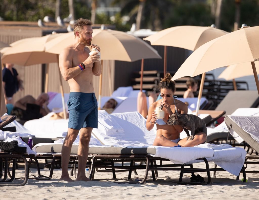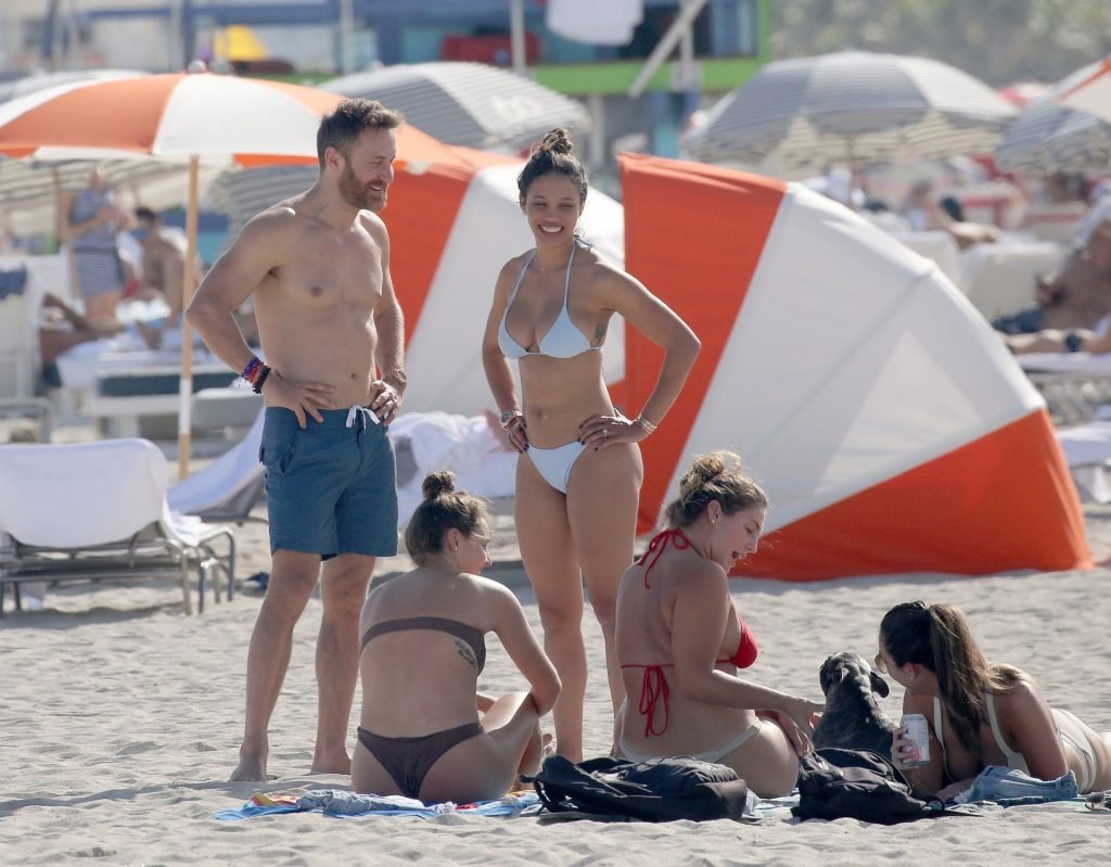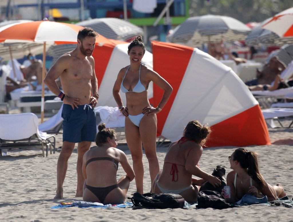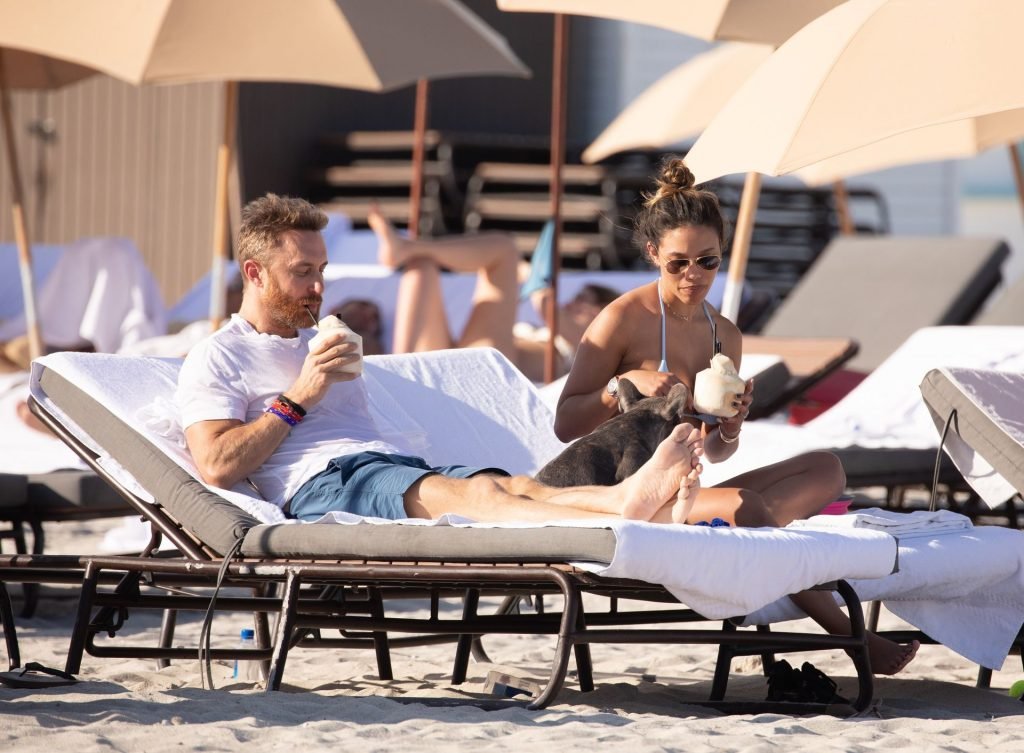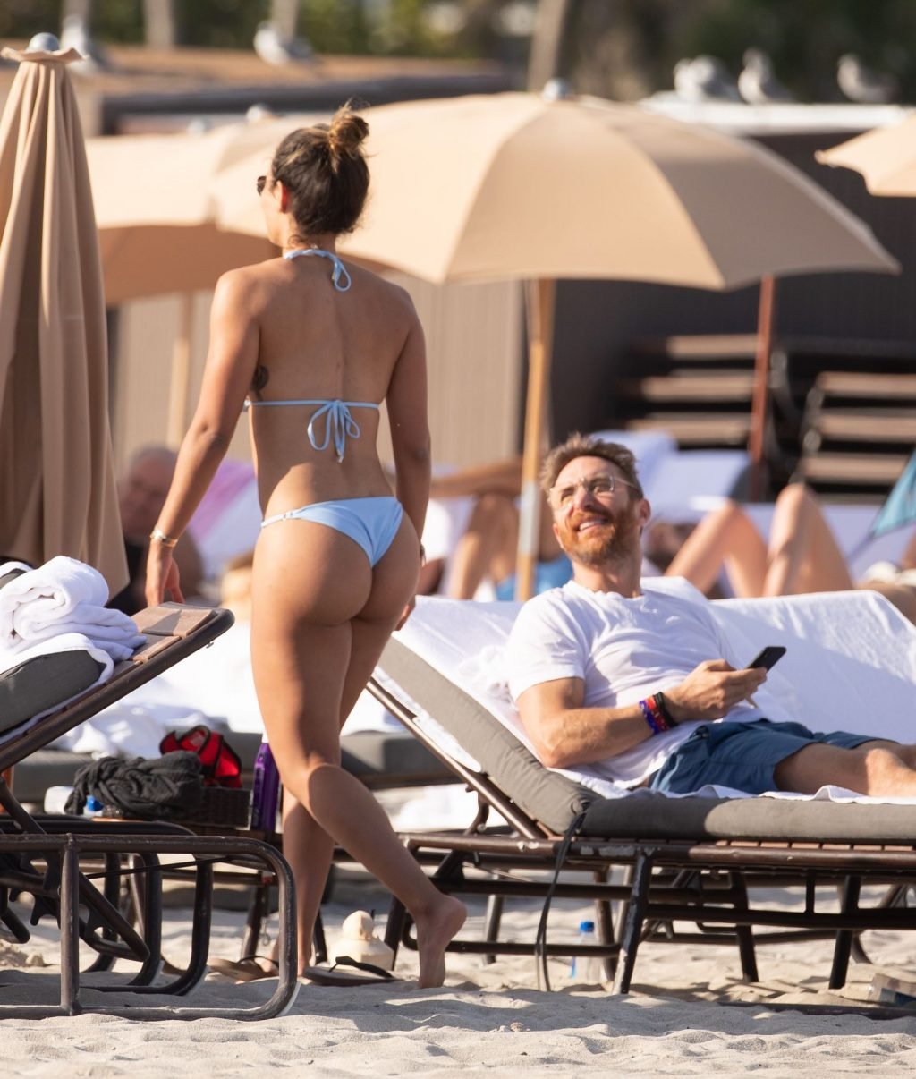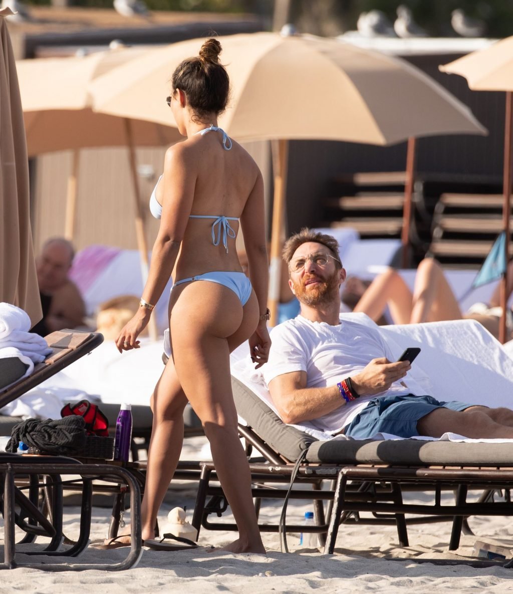 DJ David Guetta garde un œil attentif sur sa petite amie mannequin Jessica Ledon (24 ans) alors qu’elle se promène en bikini minuscule, Miami, 19/11/2018. David a salué le DJ Gianluca Vacchi qui a ensuite été aperçu en train de faire une sieste au soleil.