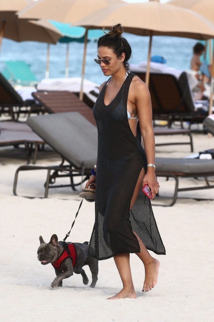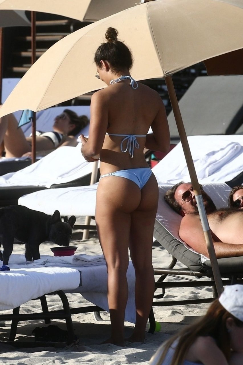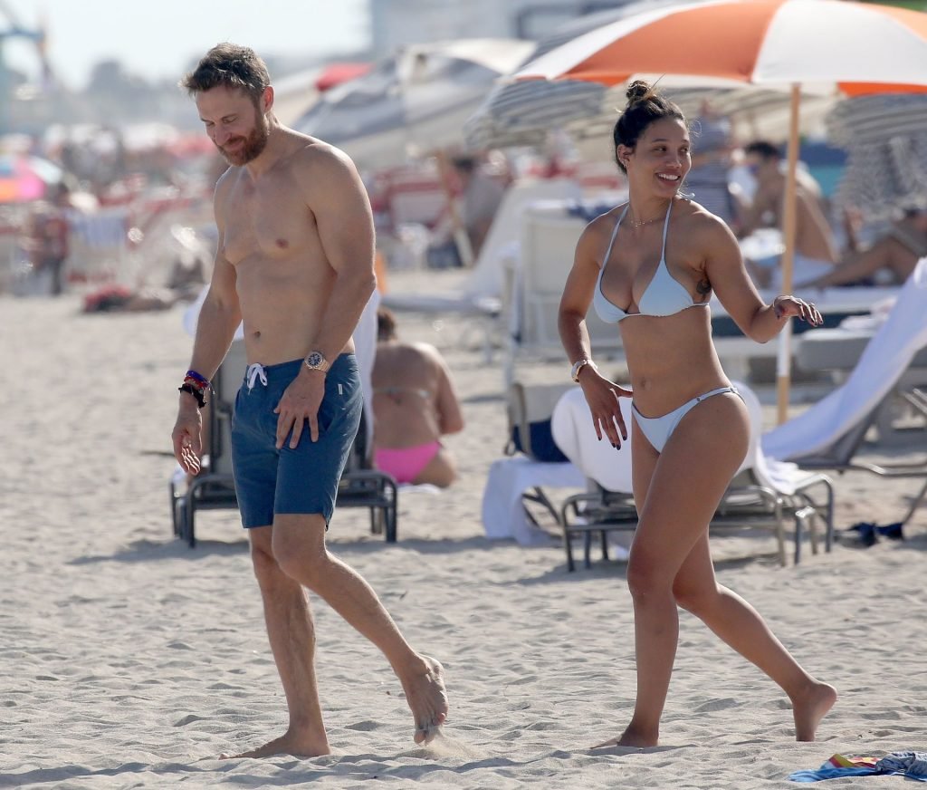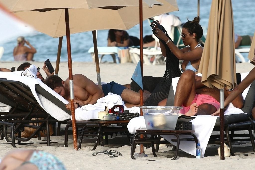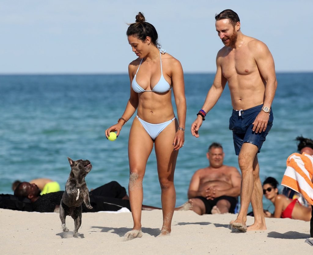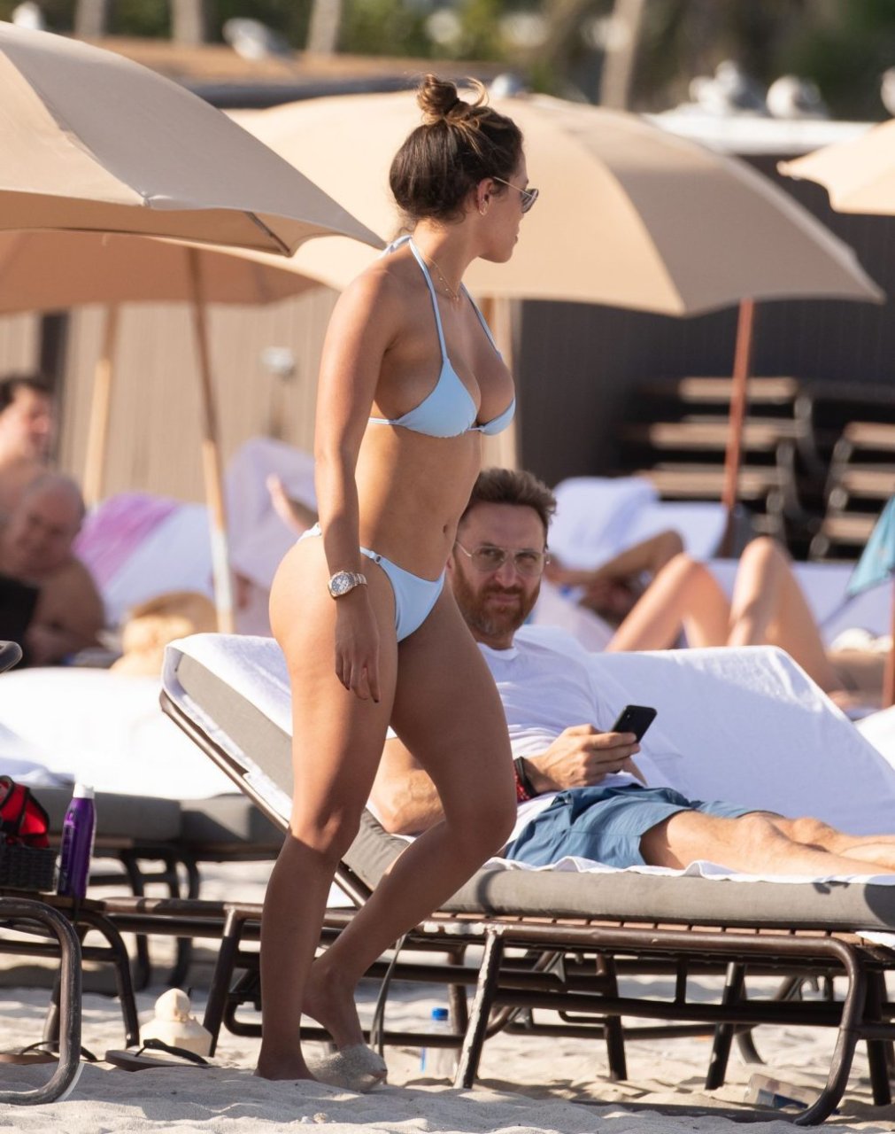 DJ David Guetta garde un œil attentif sur sa petite amie mannequin Jessica Ledon (24 ans) alors qu’elle se promène en bikini minuscule, Miami, 19/11/2018. David a salué le DJ Gianluca Vacchi qui a ensuite été aperçu en train de faire une sieste au soleil.