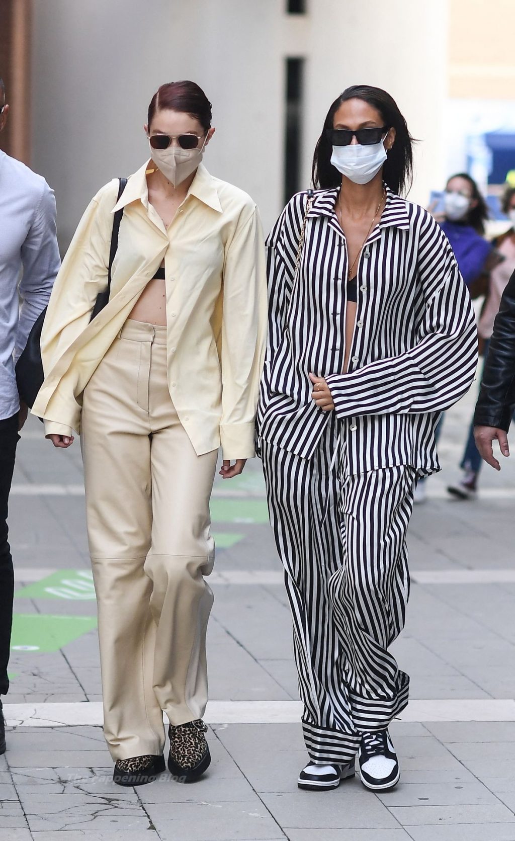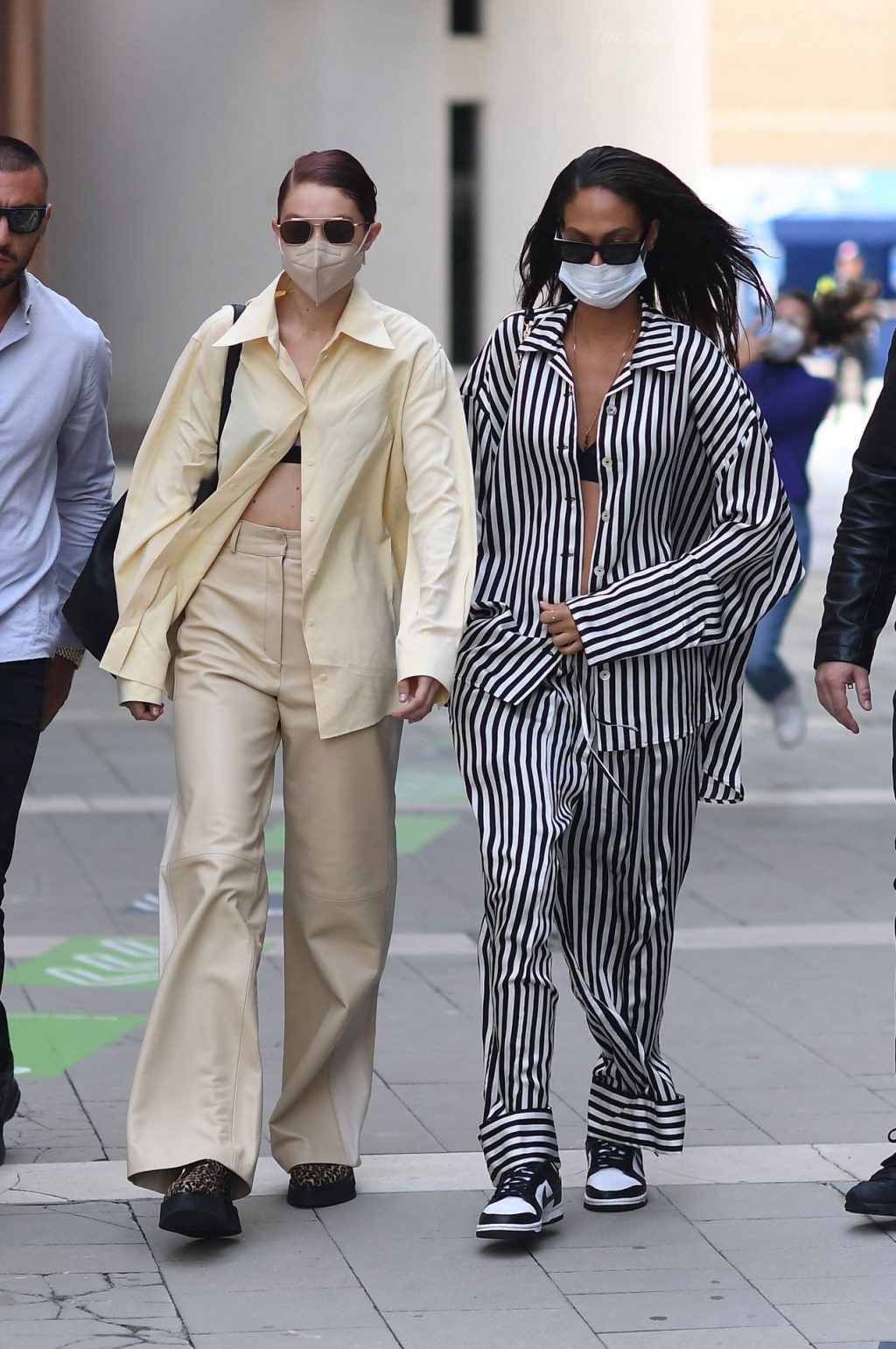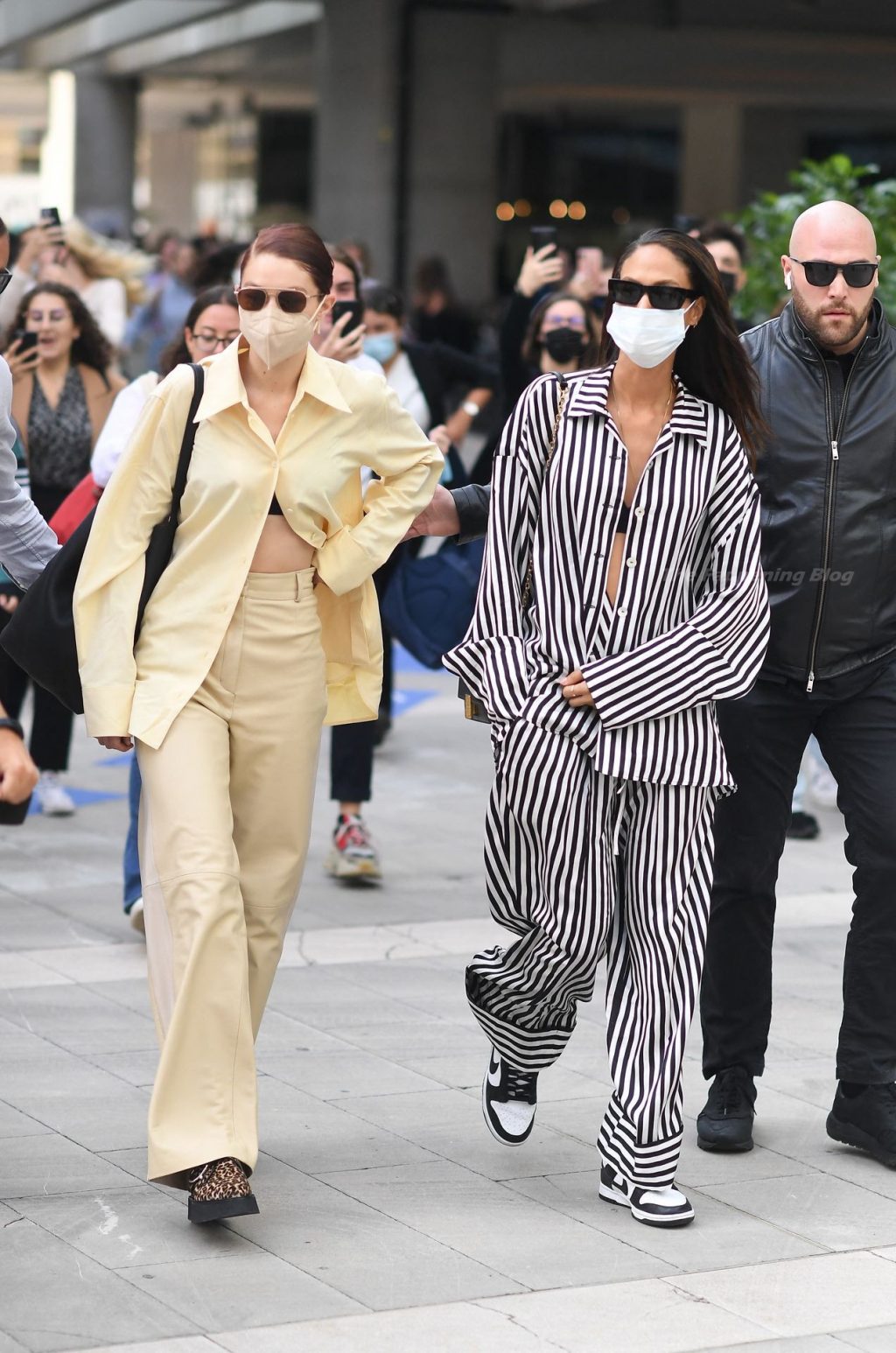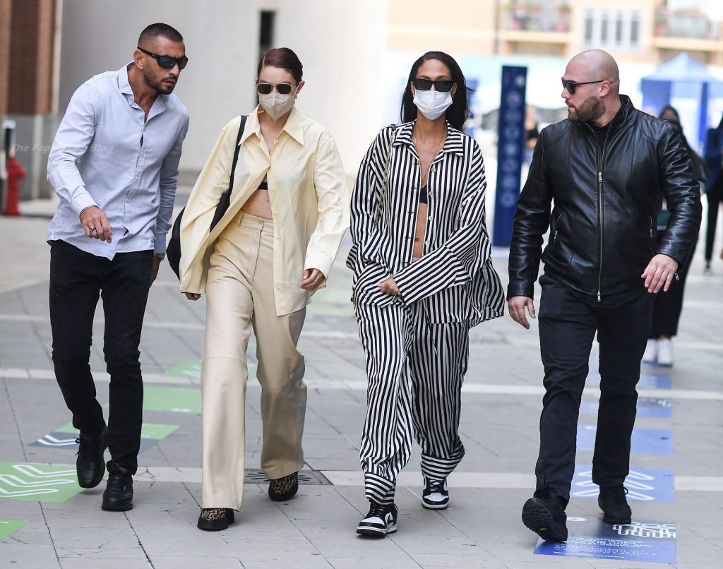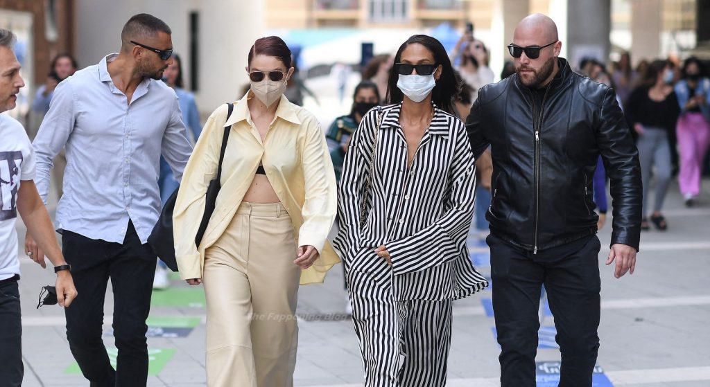 Gigi Hadid et Joan Smalls sont vues pendant la Fashion Week de Milan à Milan, le 23/09/2021. Joan montre son téton, portant un soutien-gorge transparent.