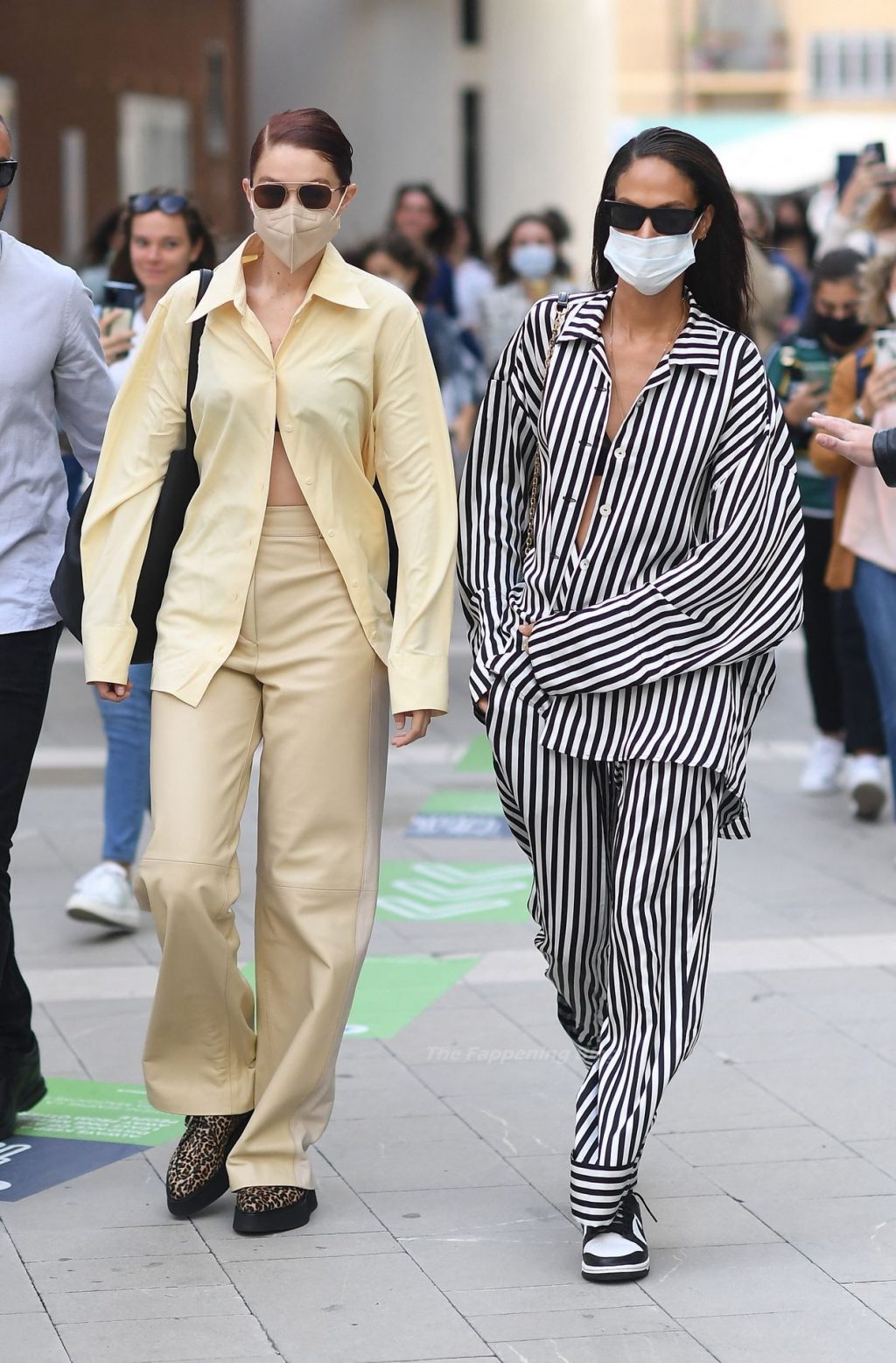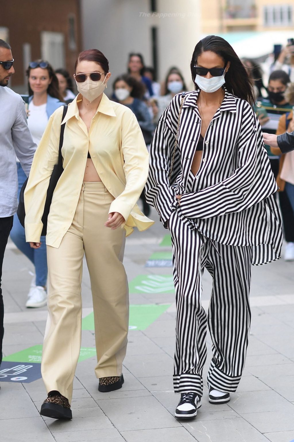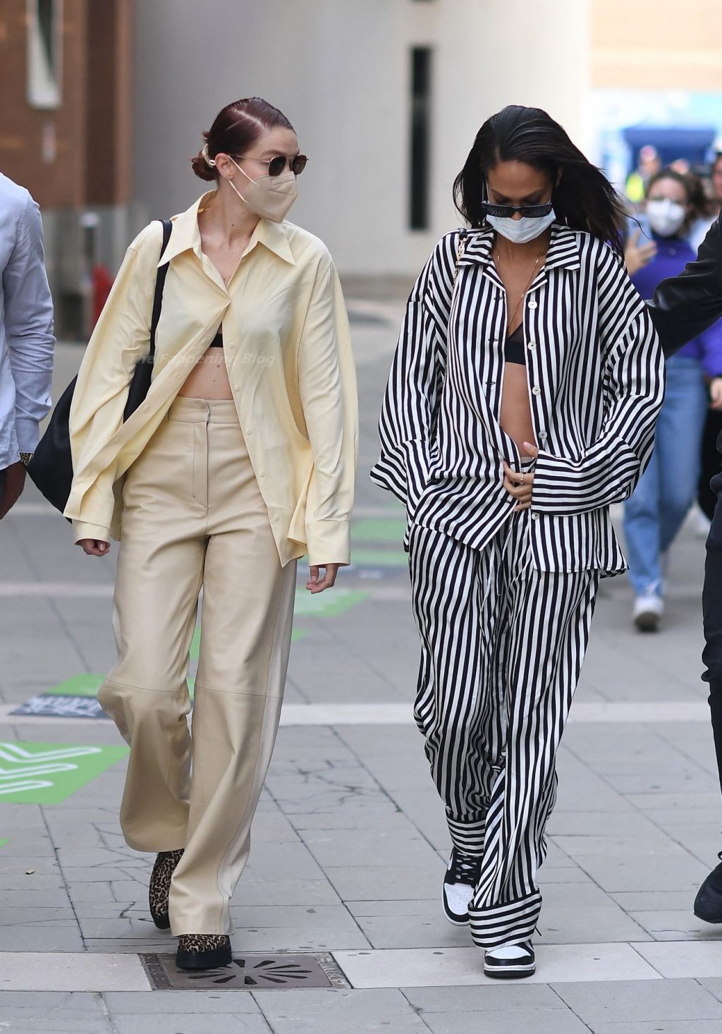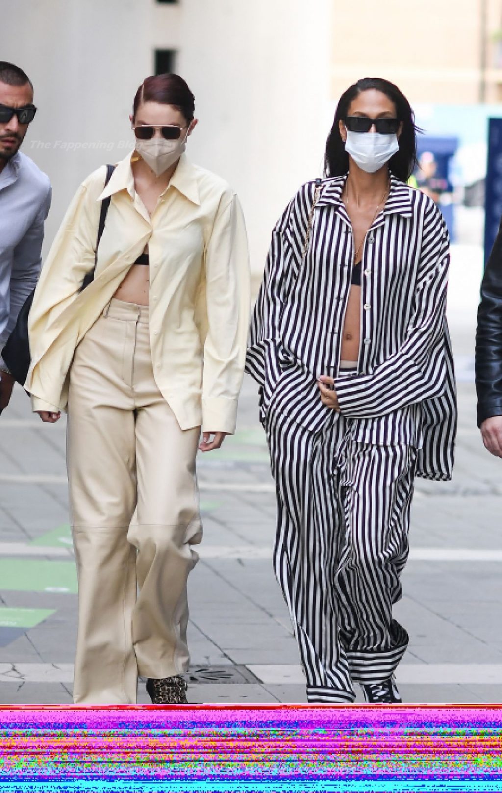 Gigi Hadid et Joan Smalls sont vues pendant la Fashion Week de Milan à Milan, le 23/09/2021. Joan montre son téton, portant un soutien-gorge transparent.
