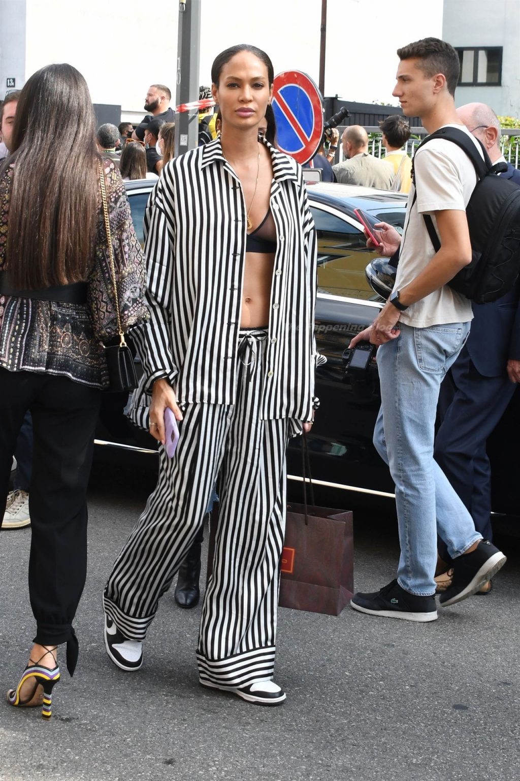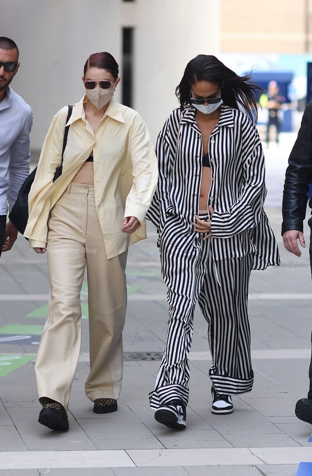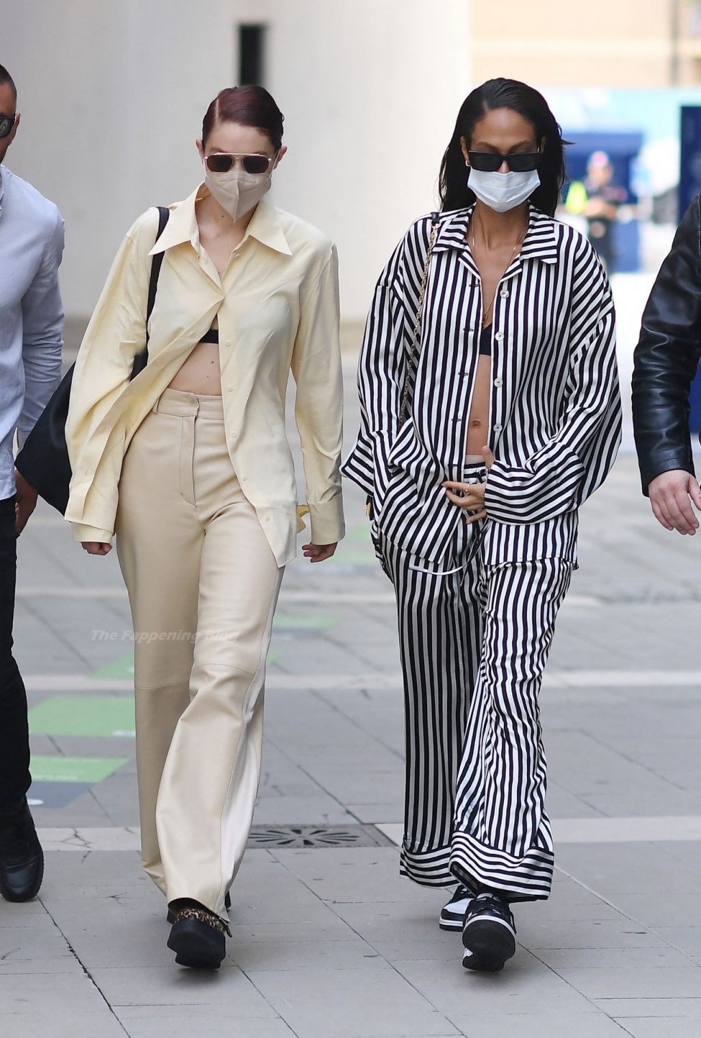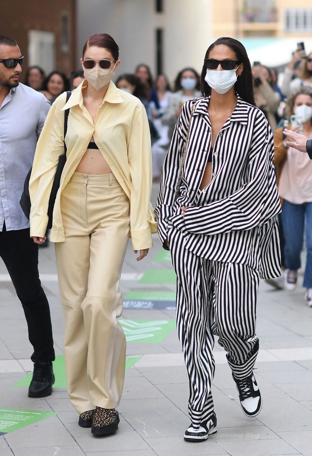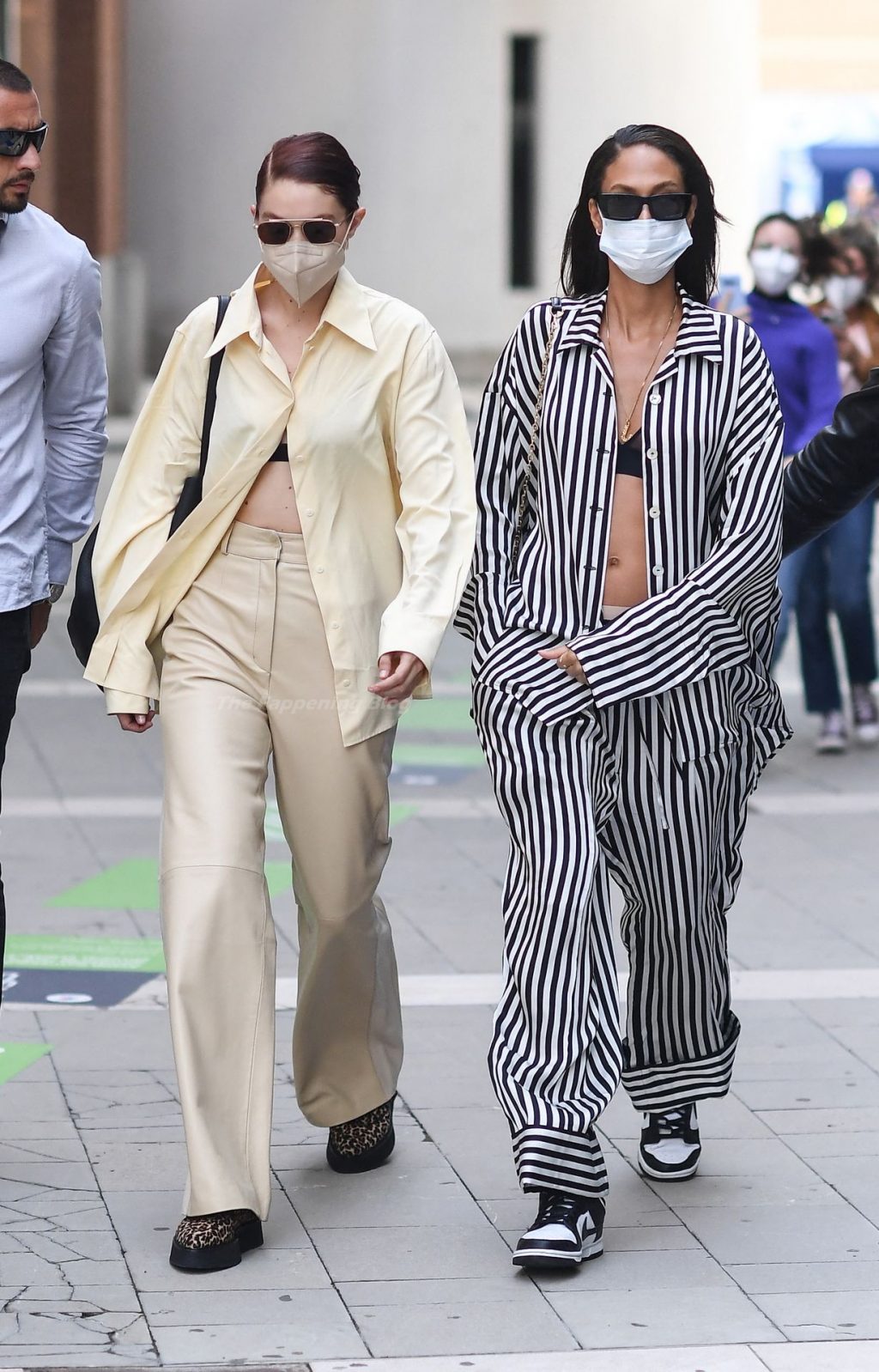 Gigi Hadid et Joan Smalls sont vues pendant la Fashion Week de Milan à Milan, le 23/09/2021. Joan montre son téton, portant un soutien-gorge transparent.