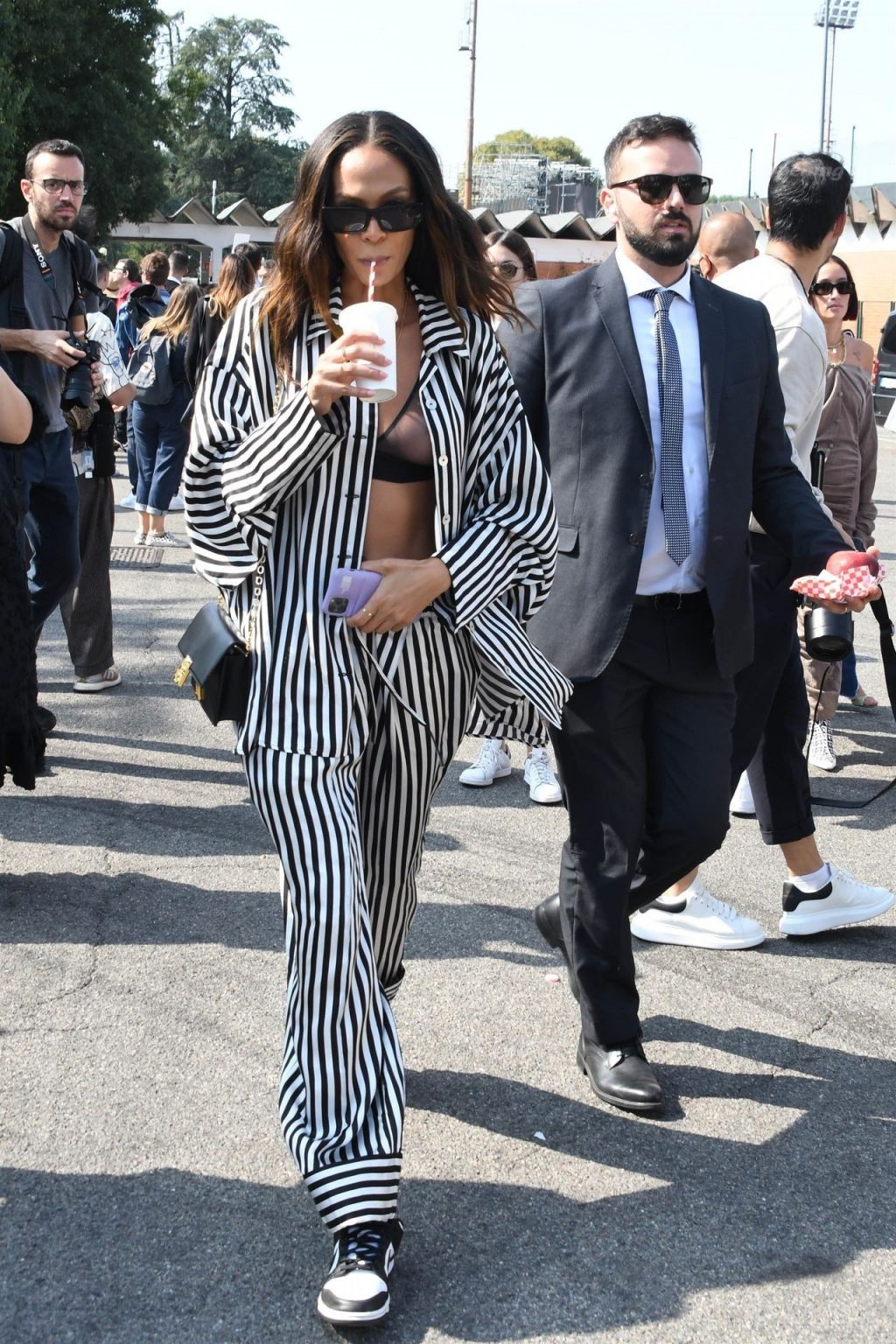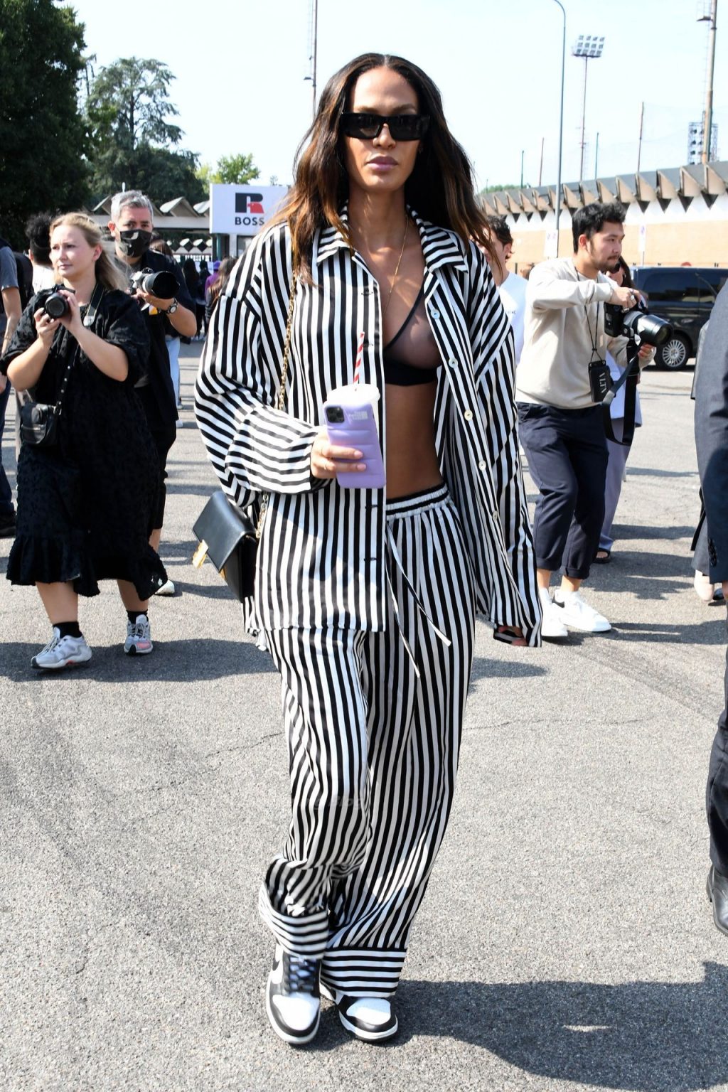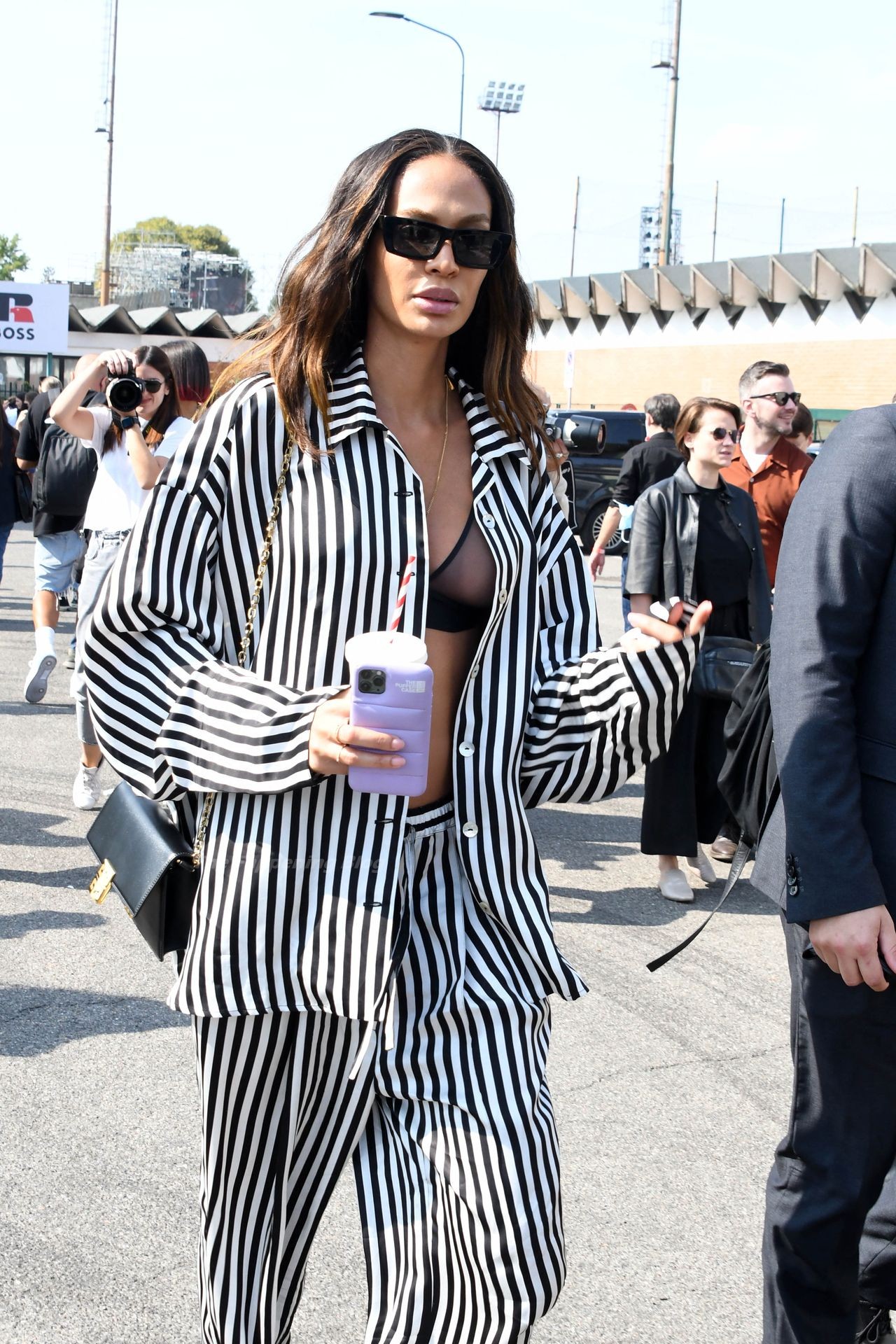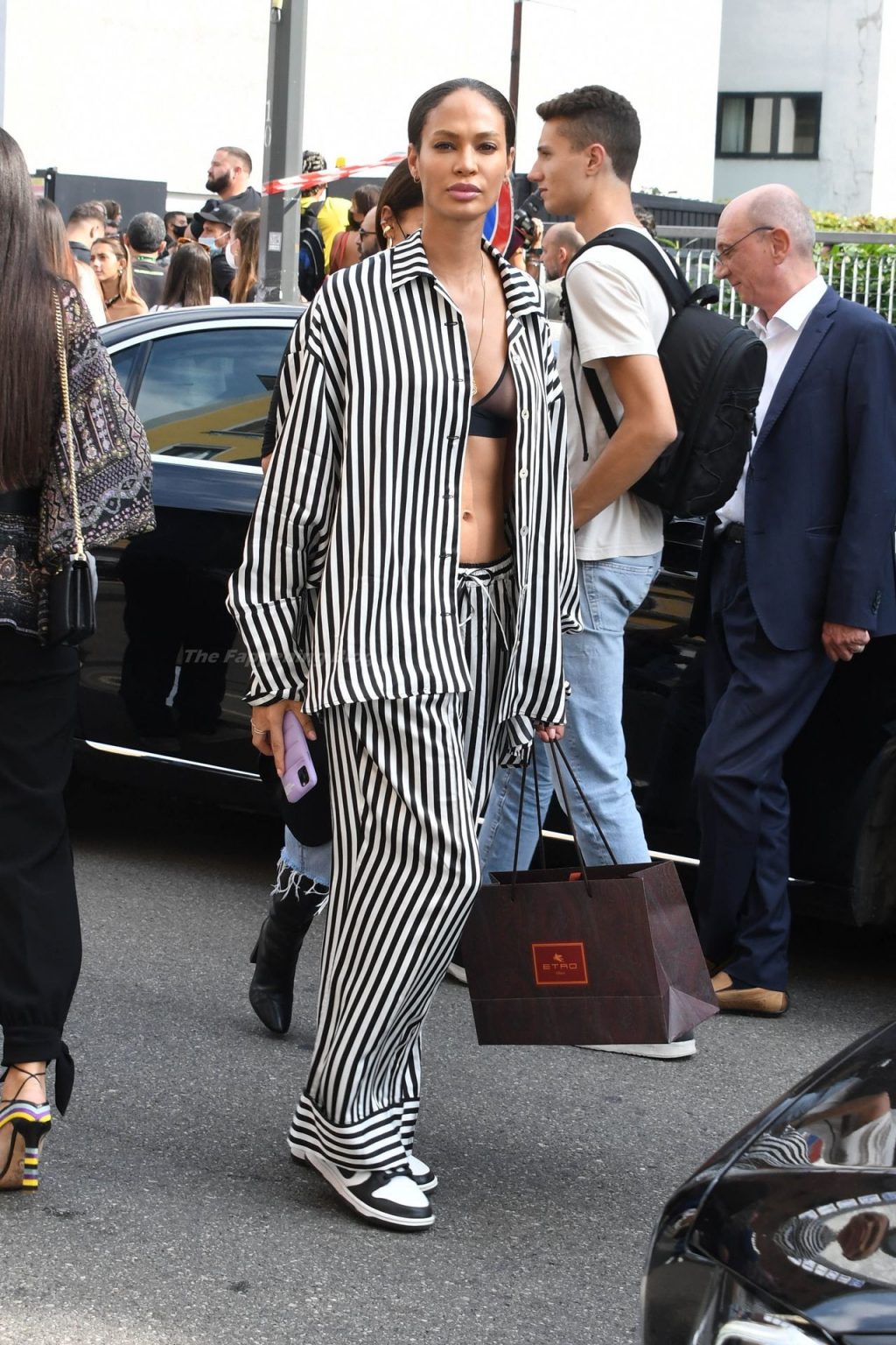 Gigi Hadid et Joan Smalls sont vues pendant la Fashion Week de Milan à Milan, le 23/09/2021. Joan montre son téton, portant un soutien-gorge transparent.