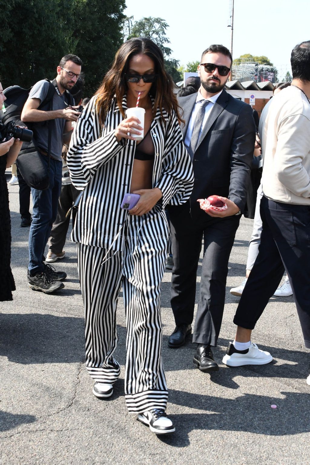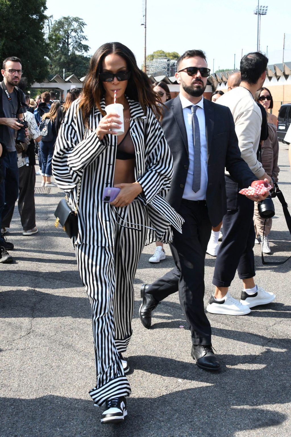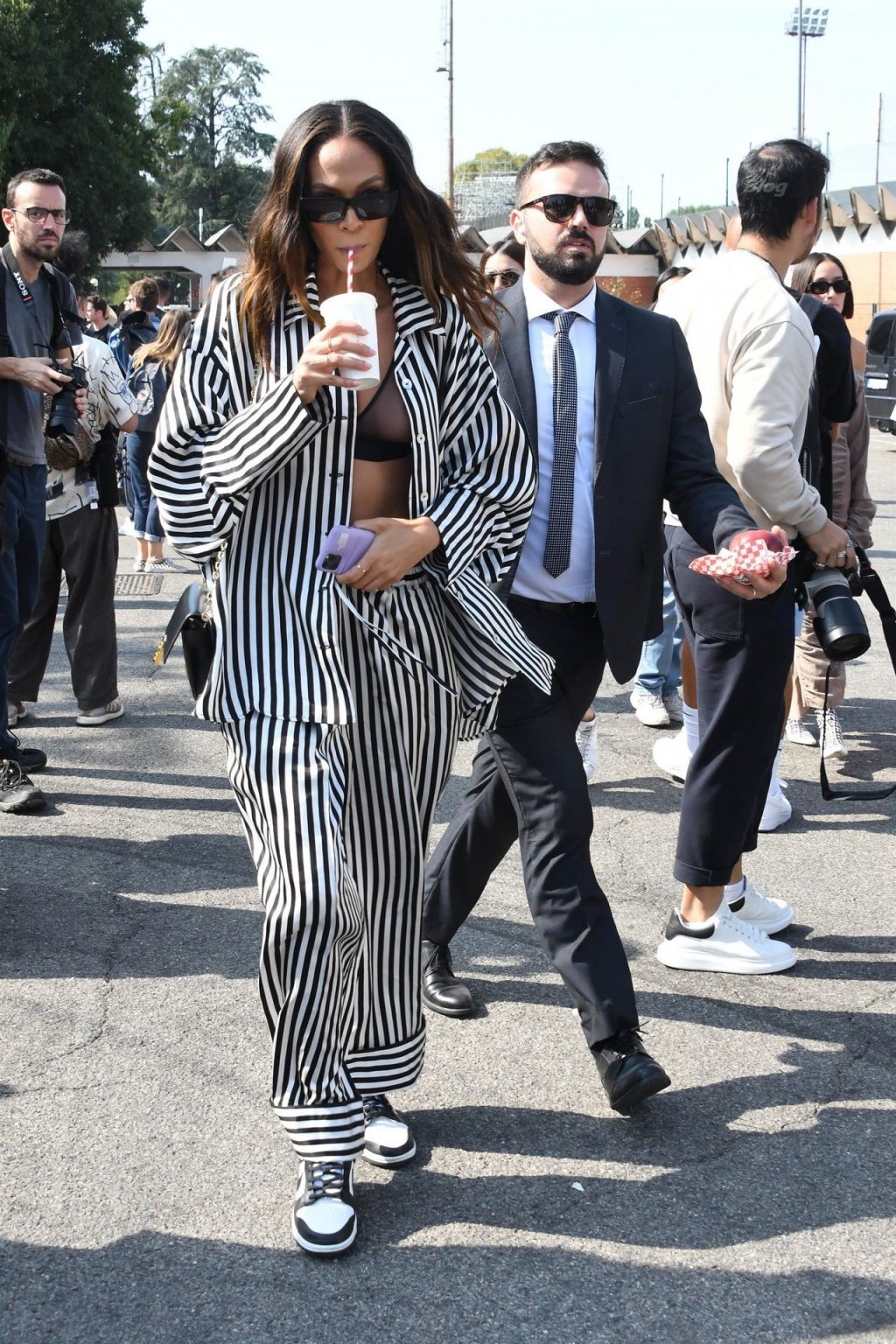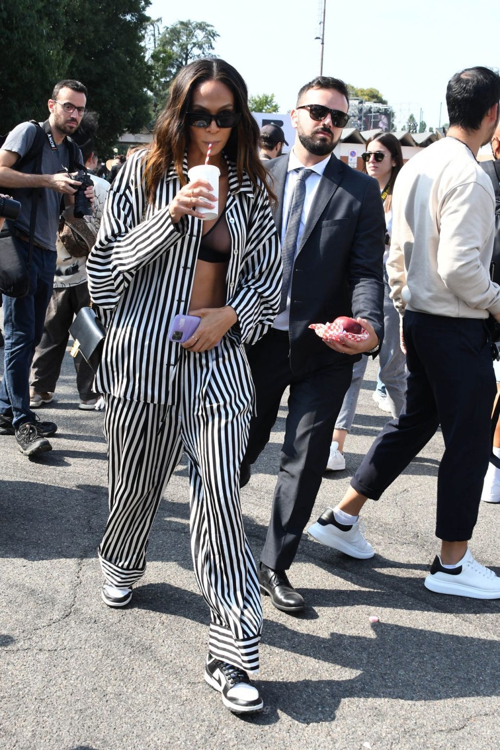Gigi Hadid et Joan Smalls sont vues pendant la Fashion Week de Milan à Milan, le 23/09/2021. Joan montre son téton, portant un soutien-gorge transparent.