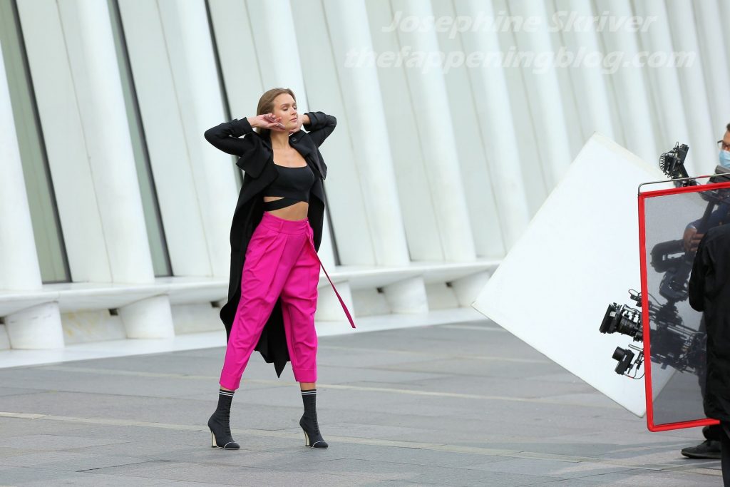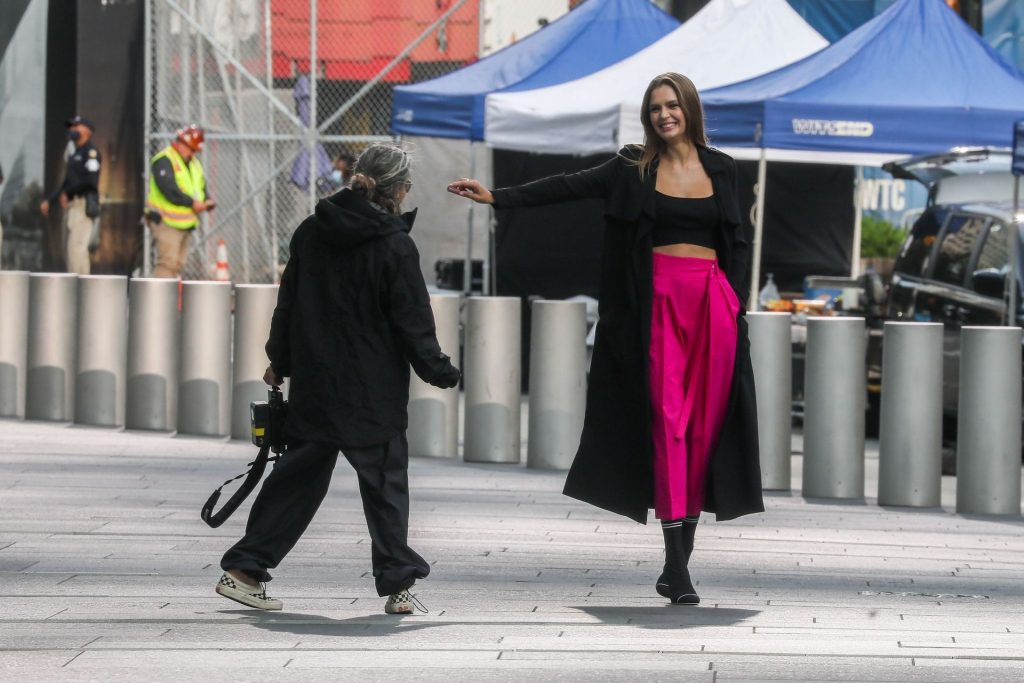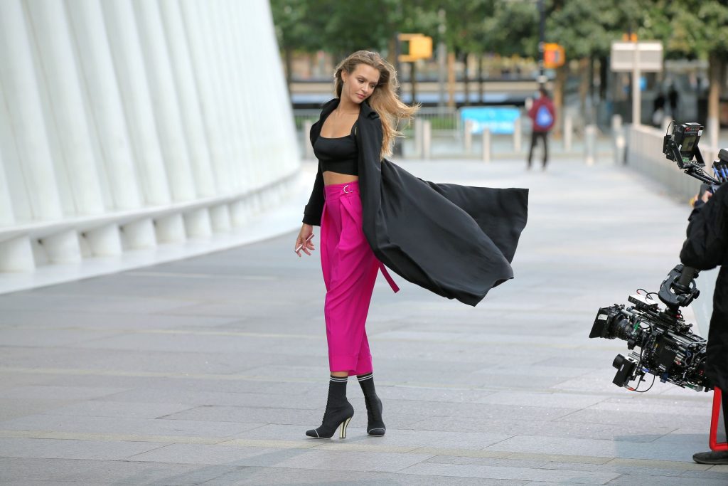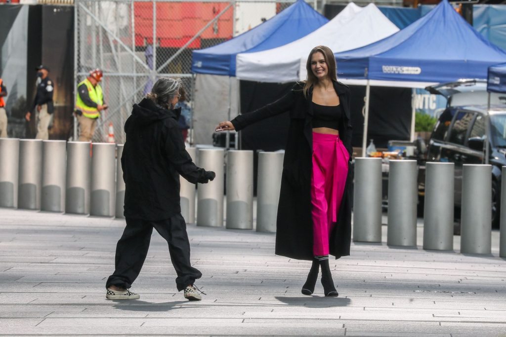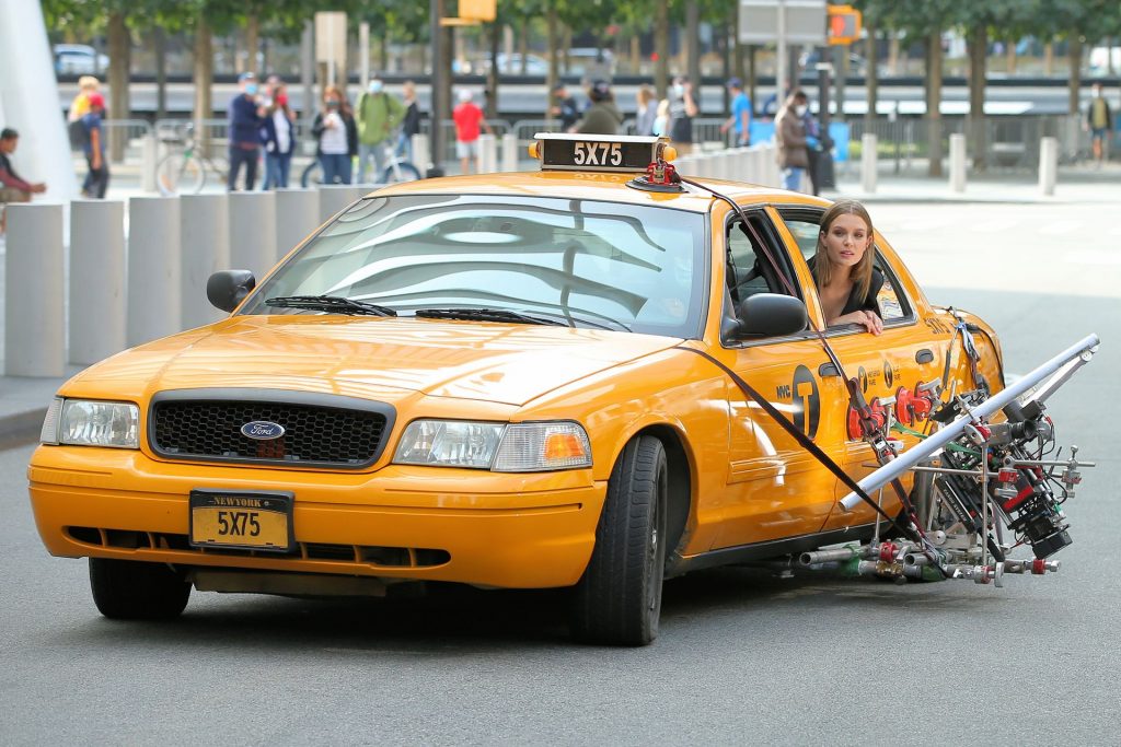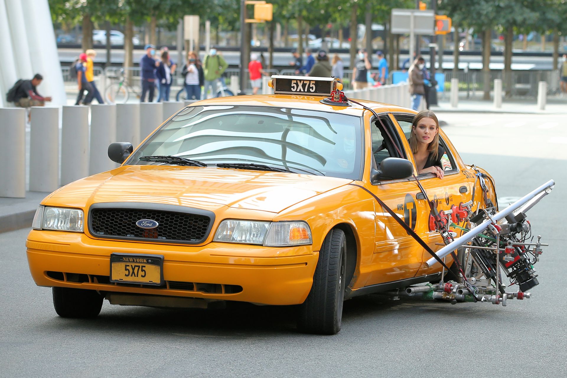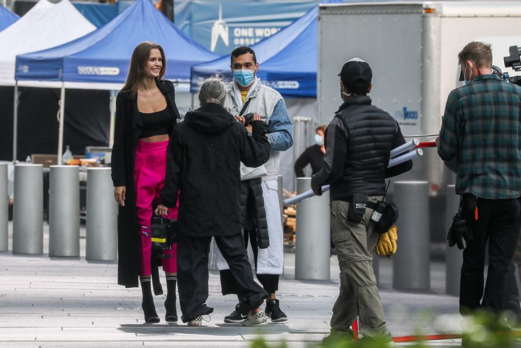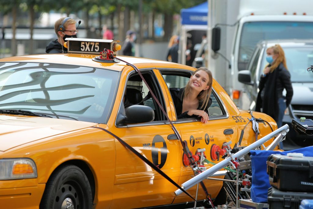 Model Josephine Skriver tourne une publicité Maybelline près de l’Oculus avec Cass Bird à New York, 15/09/2020. Josephine filme une scène où elle est dans un taxi, la tête dehors par la fenêtre !