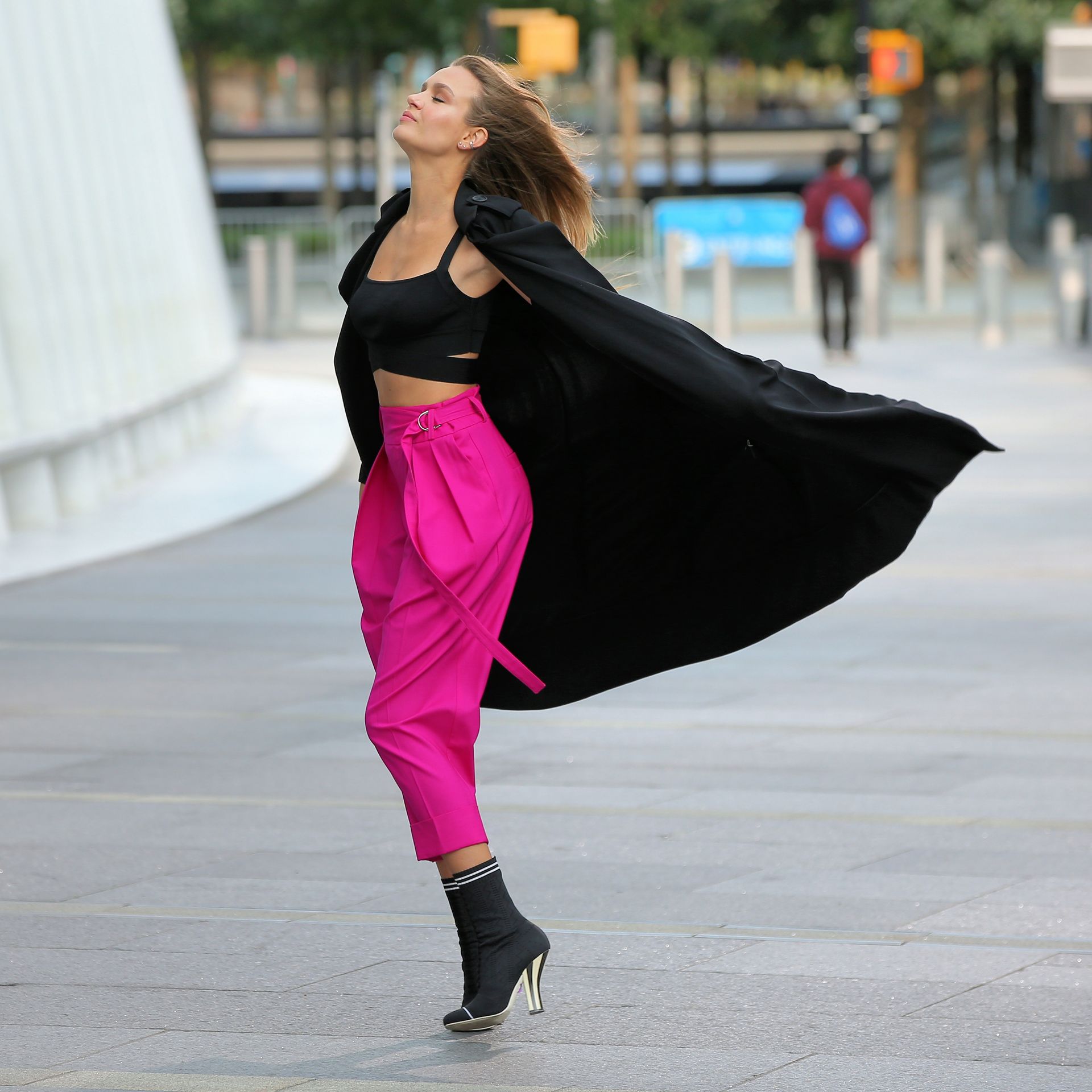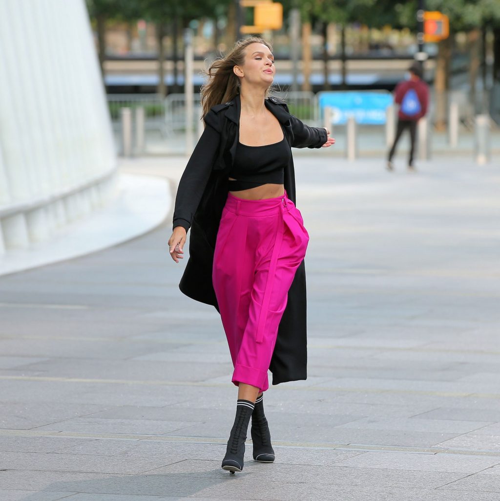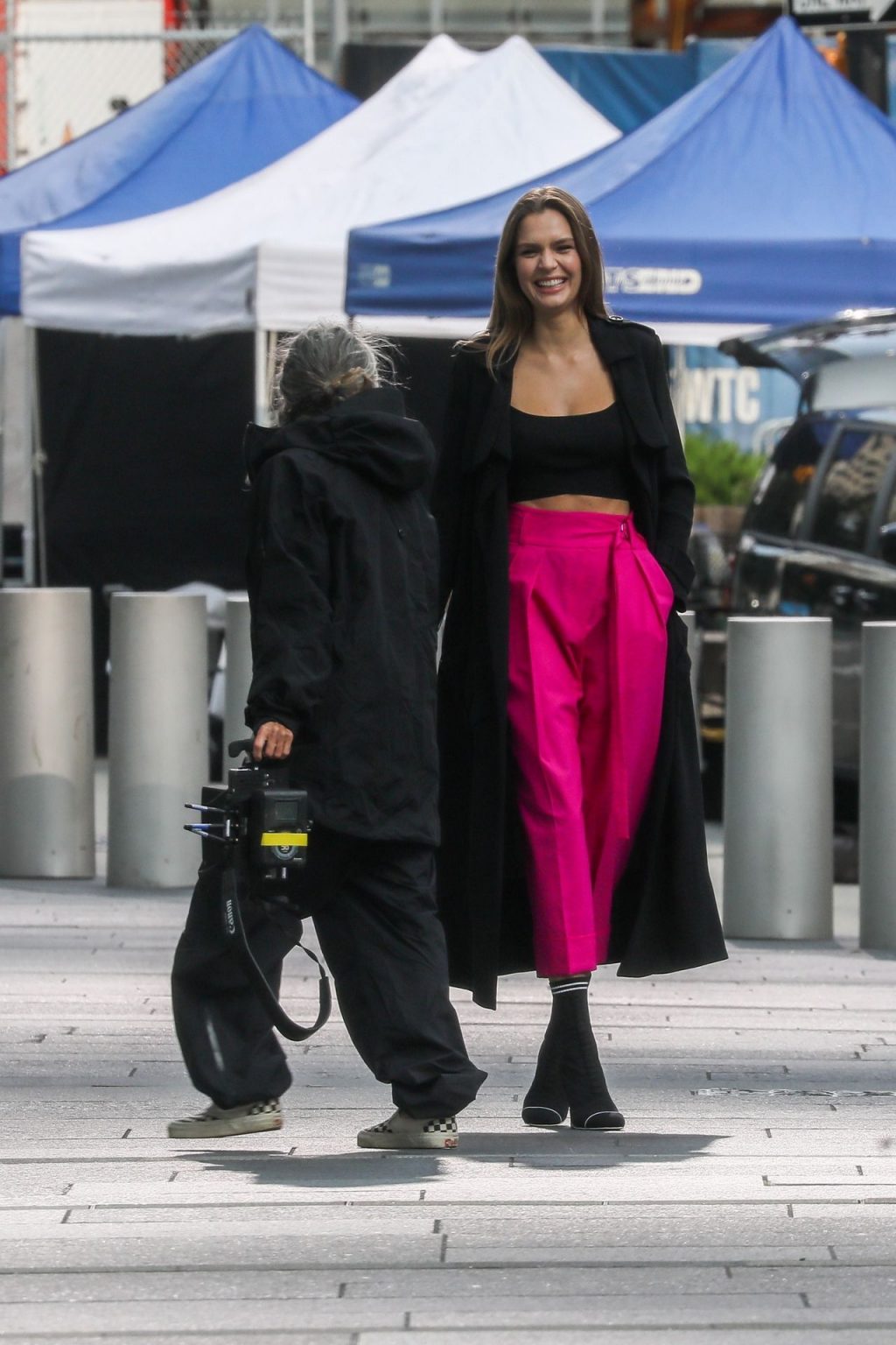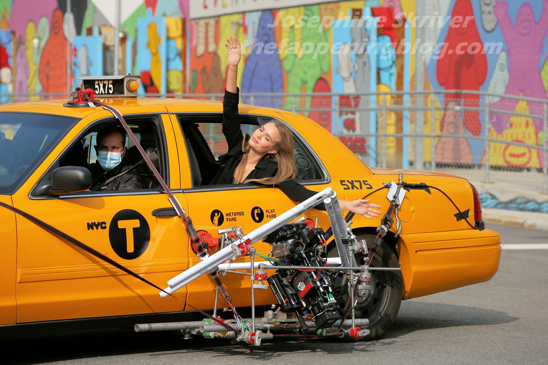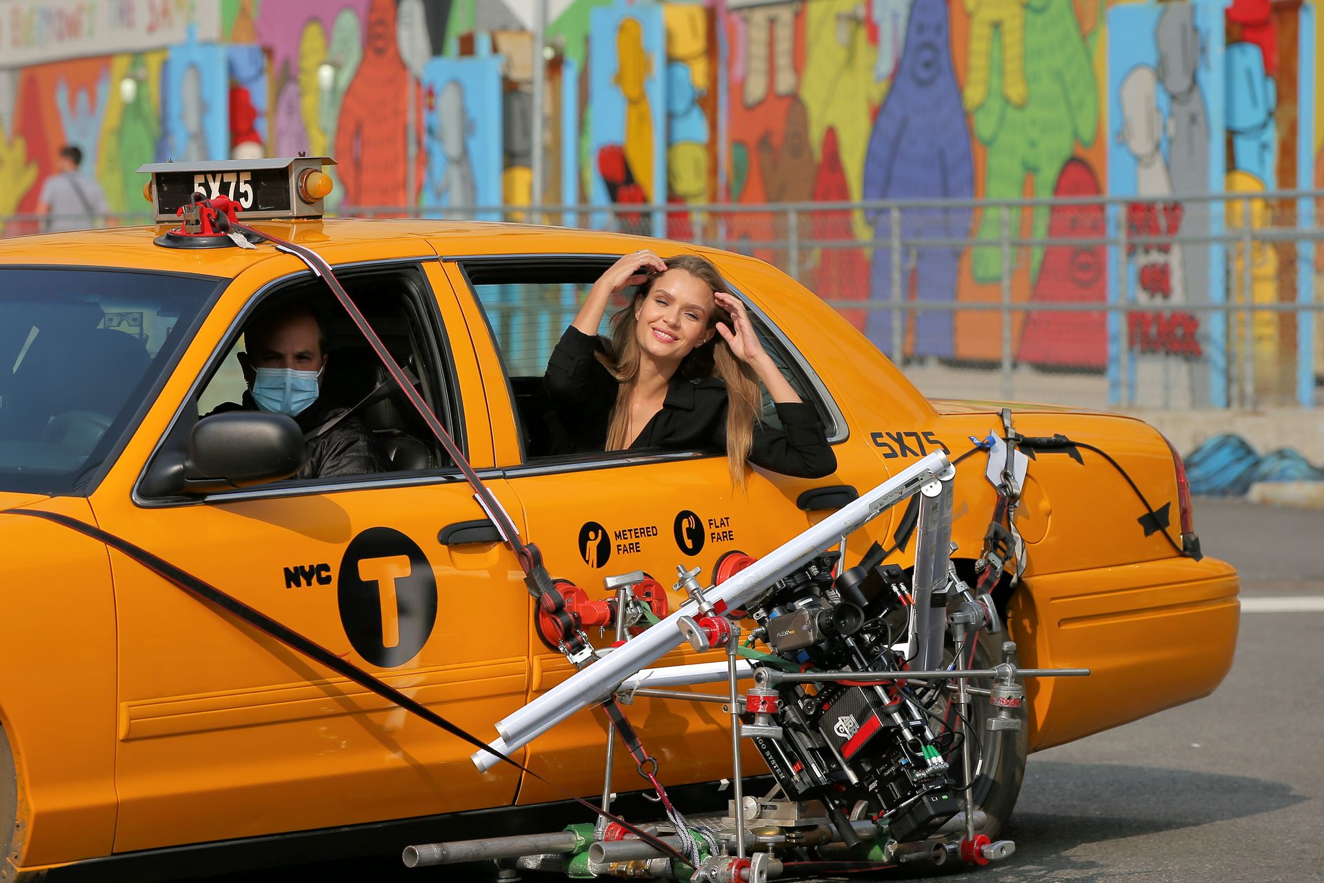 Model Josephine Skriver tourne une publicité Maybelline près de l’Oculus avec Cass Bird à New York, 15/09/2020. Josephine filme une scène où elle est dans un taxi, la tête dehors par la fenêtre !