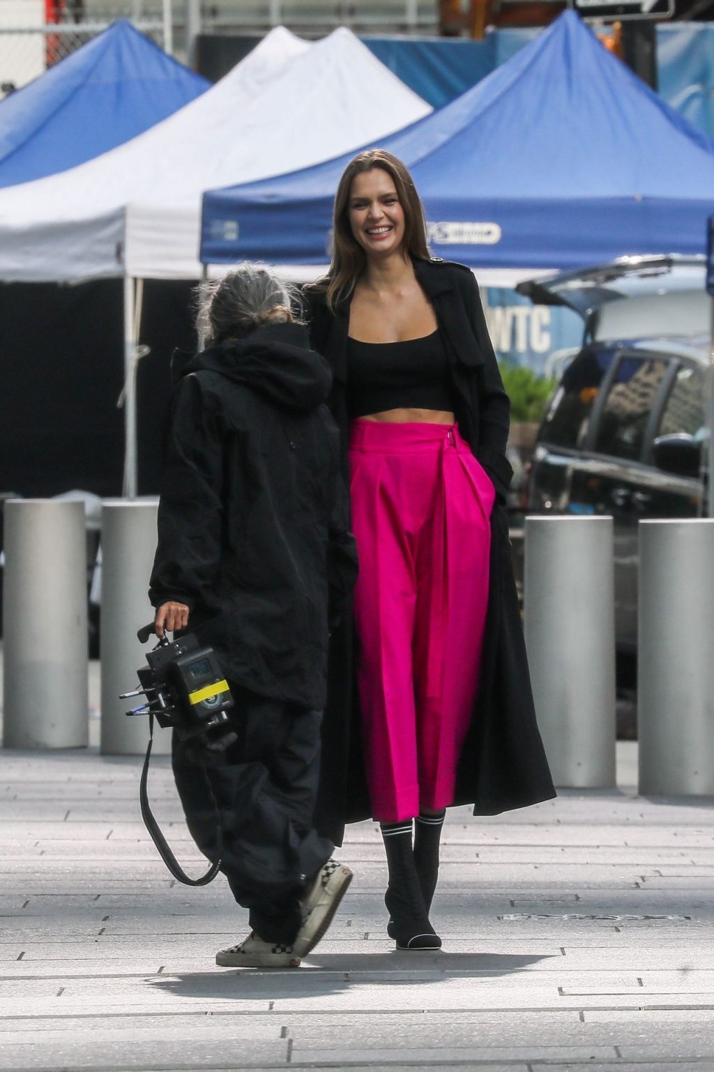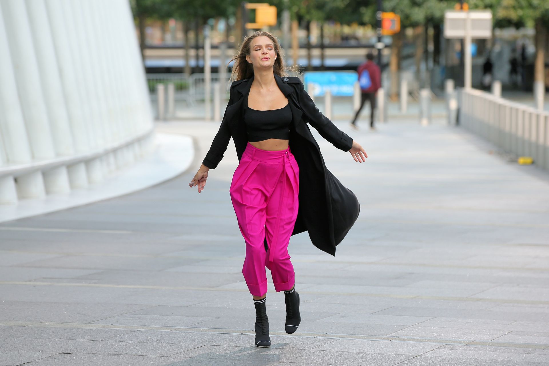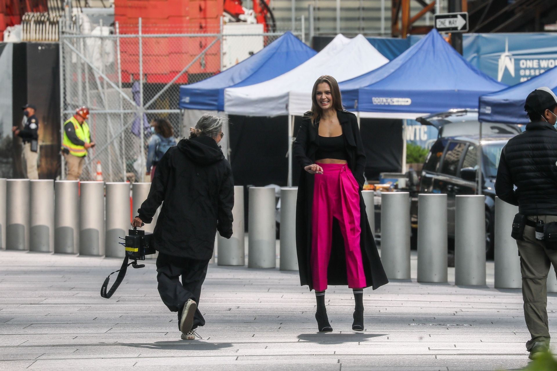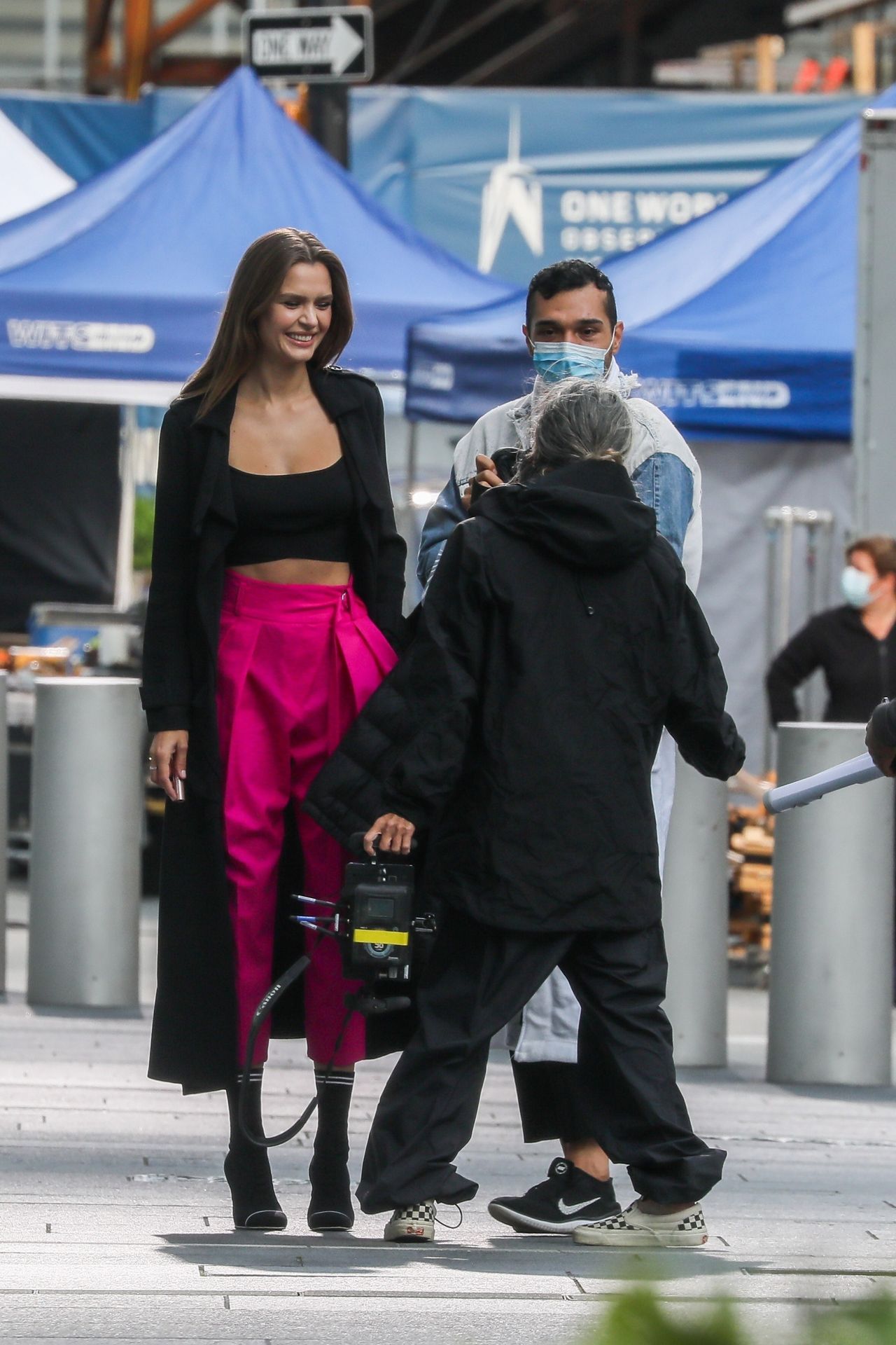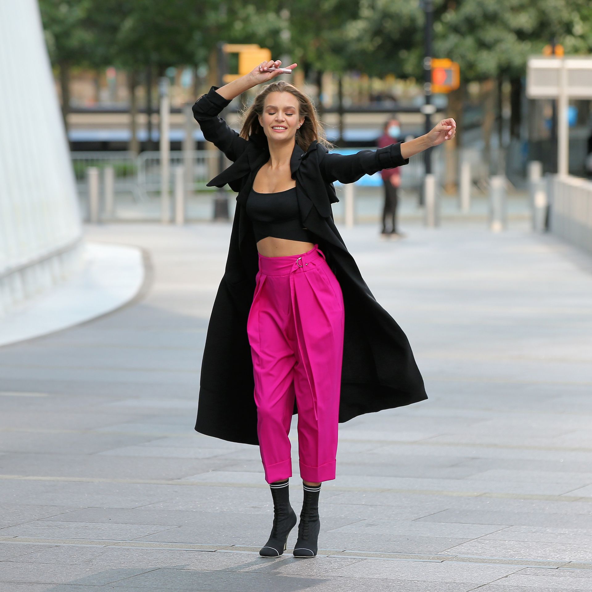 Model Josephine Skriver tourne une publicité Maybelline près de l’Oculus avec Cass Bird à New York, 15/09/2020. Josephine filme une scène où elle est dans un taxi, la tête dehors par la fenêtre !