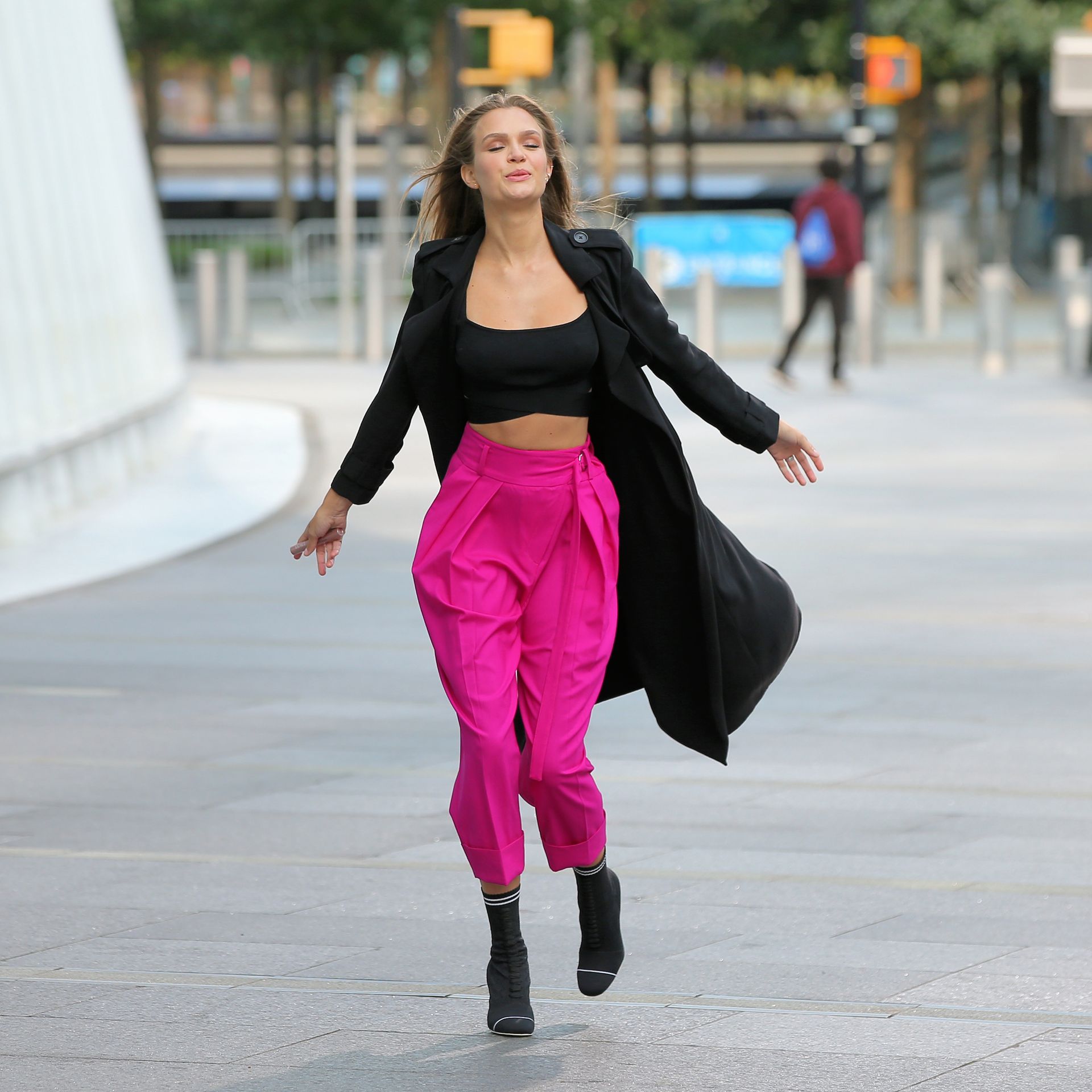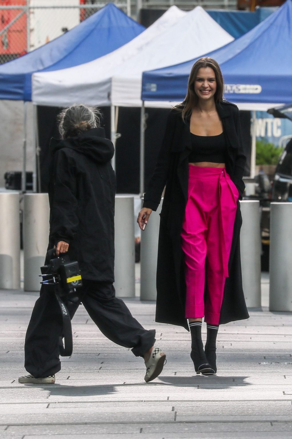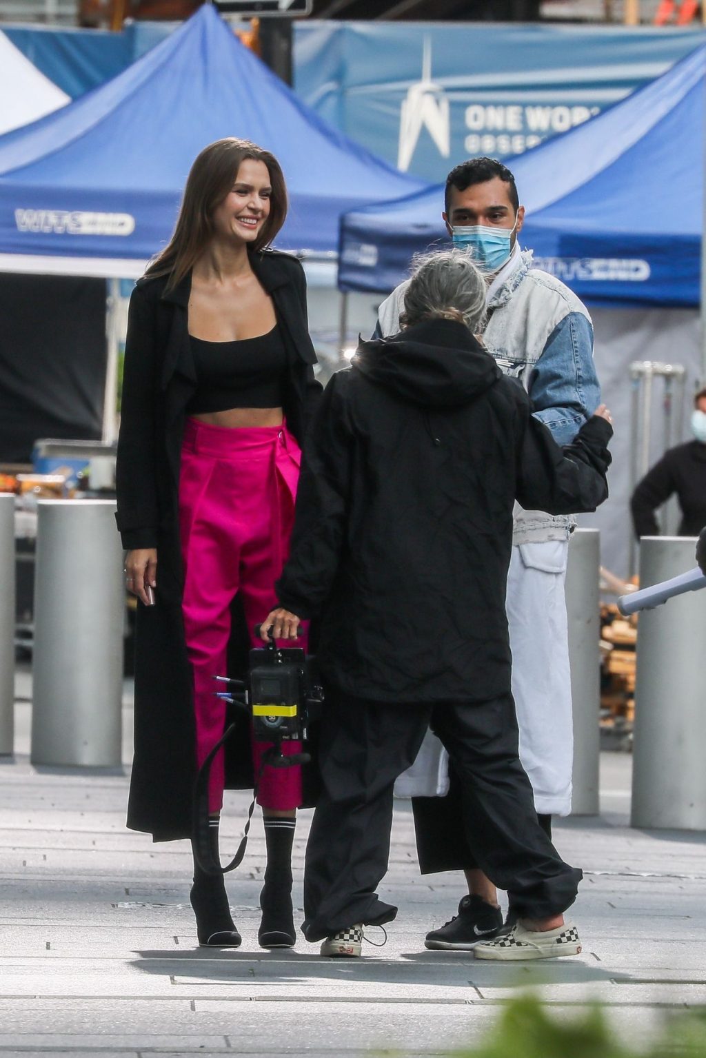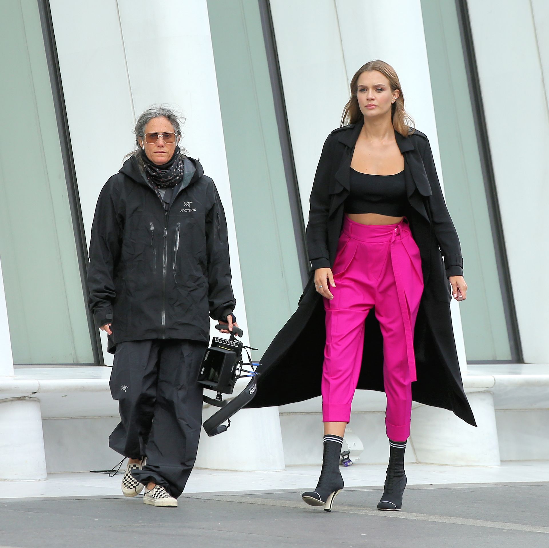 Model Josephine Skriver tourne une publicité Maybelline près de l’Oculus avec Cass Bird à New York, 15/09/2020. Josephine filme une scène où elle est dans un taxi, la tête dehors par la fenêtre !