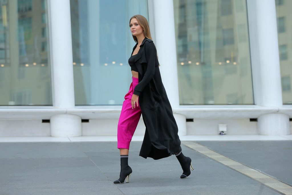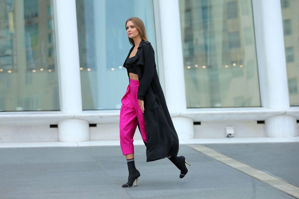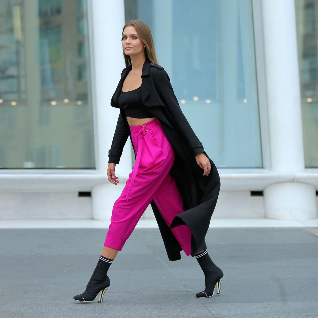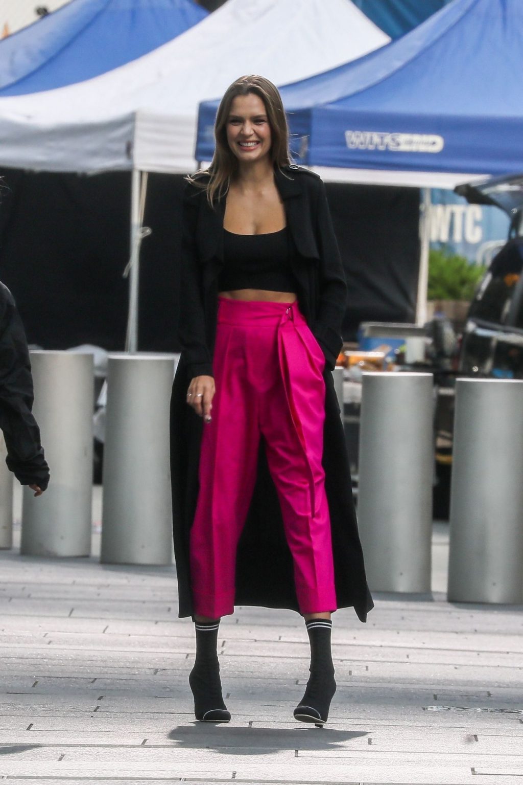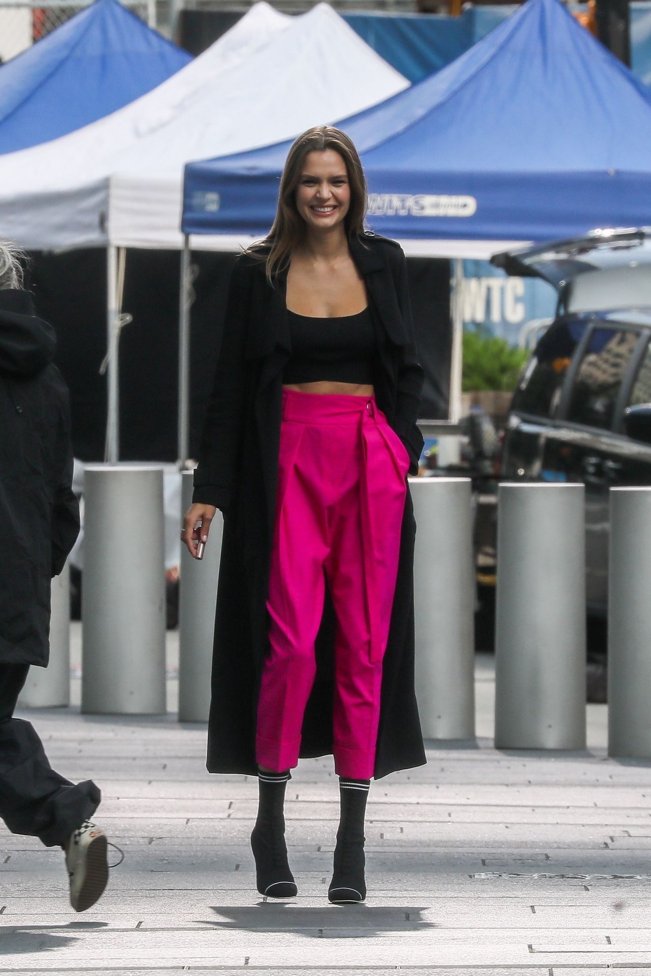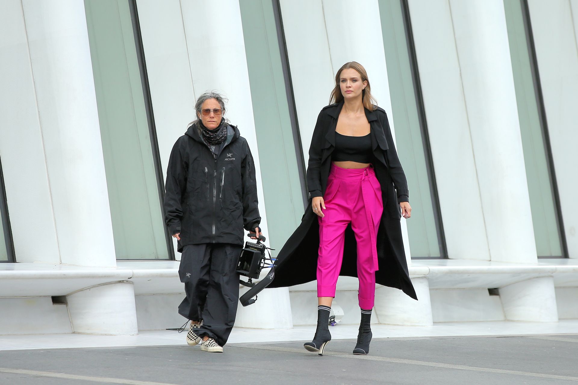 Model Josephine Skriver tourne une publicité Maybelline près de l’Oculus avec Cass Bird à New York, 15/09/2020. Josephine filme une scène où elle est dans un taxi, la tête dehors par la fenêtre !