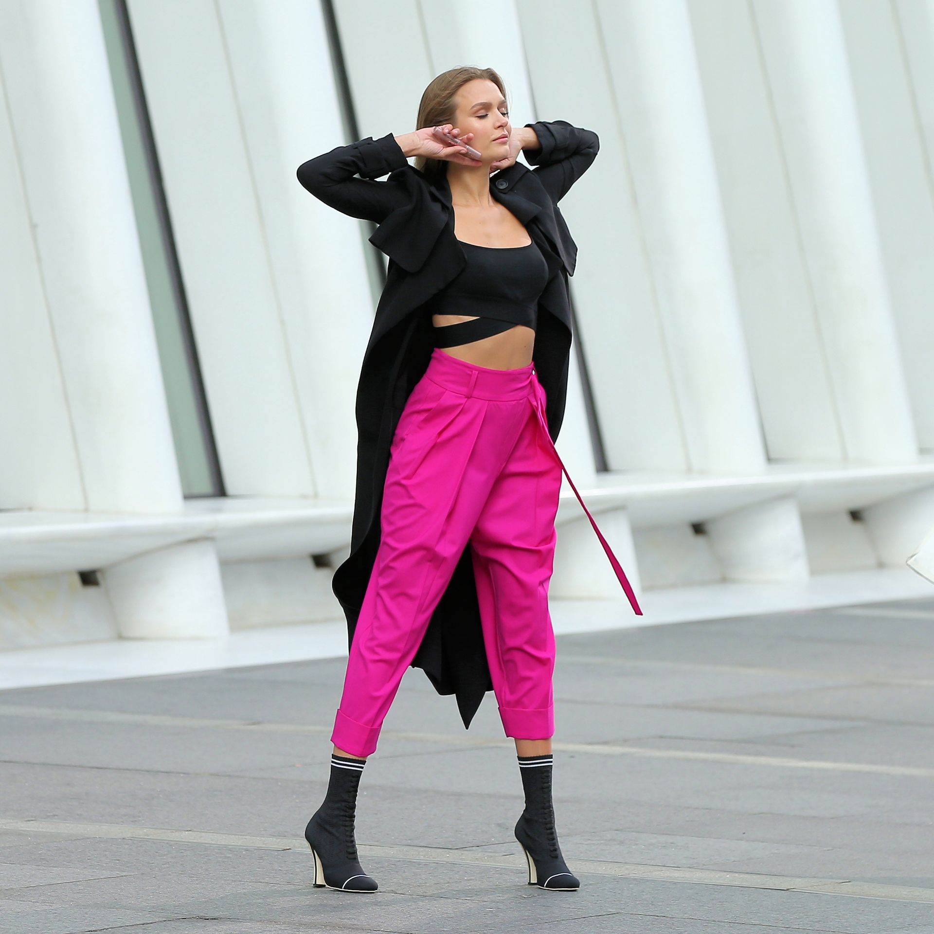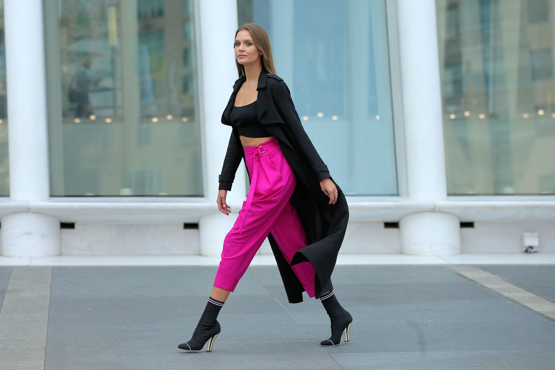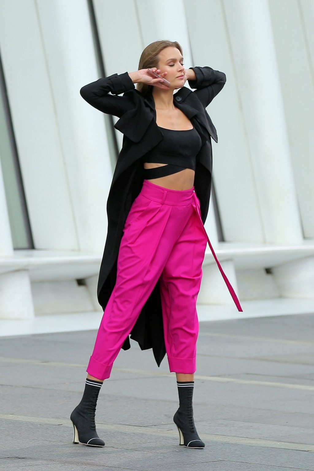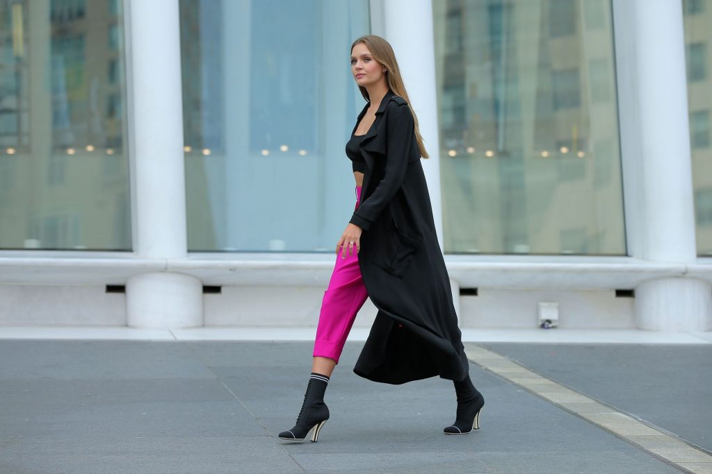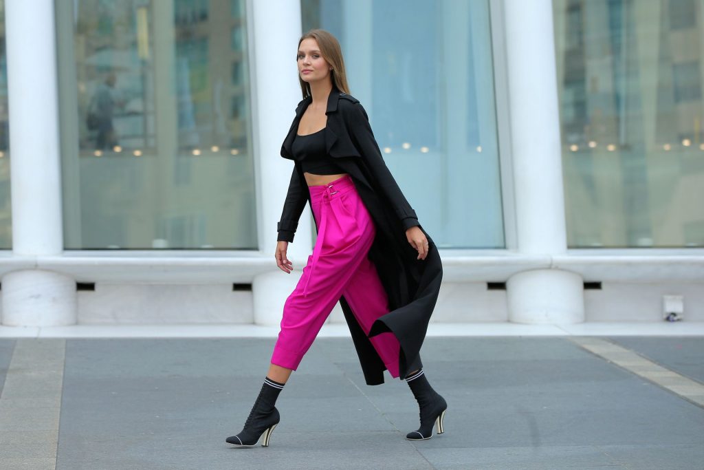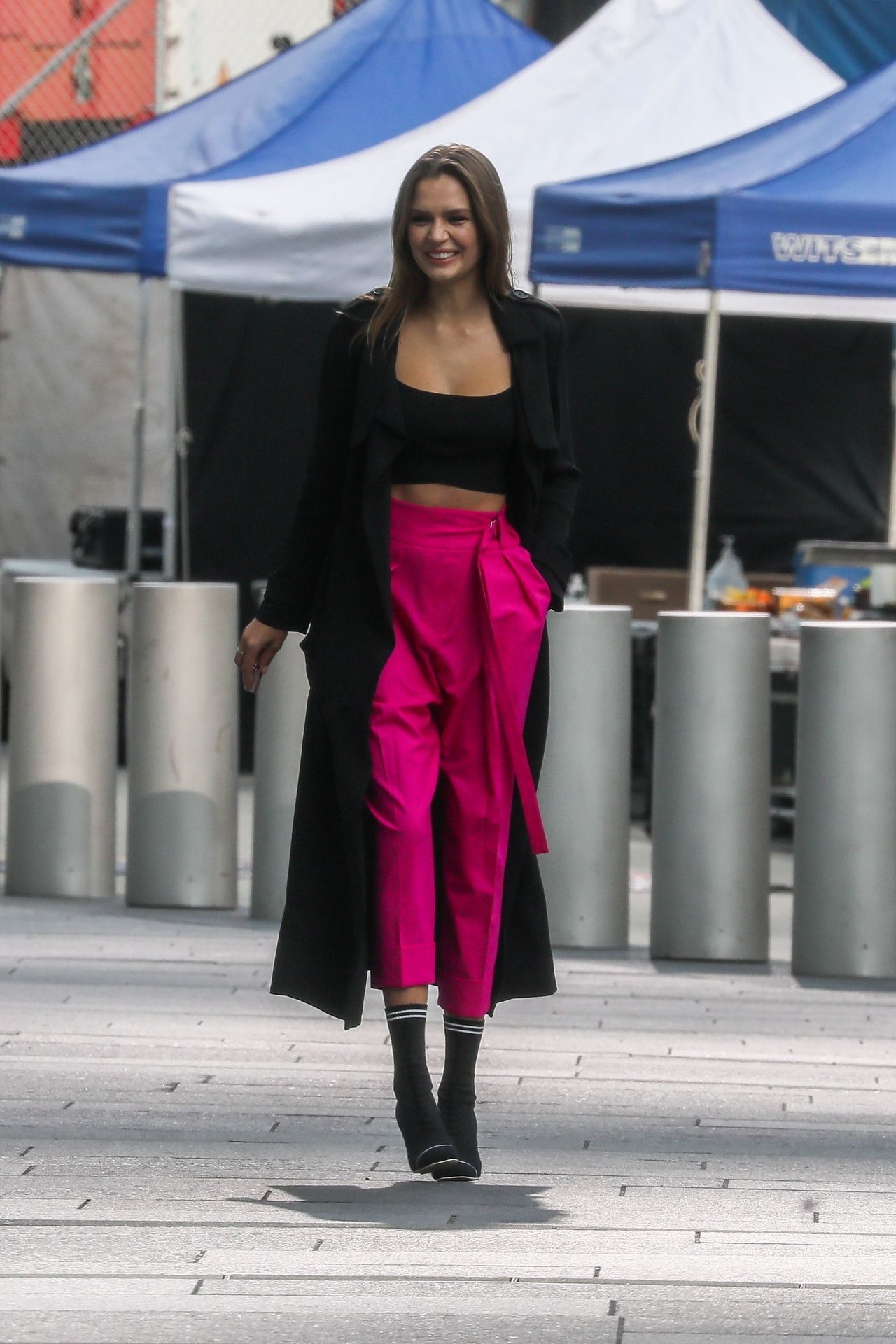 Model Josephine Skriver tourne une publicité Maybelline près de l’Oculus avec Cass Bird à New York, 15/09/2020. Josephine filme une scène où elle est dans un taxi, la tête dehors par la fenêtre !