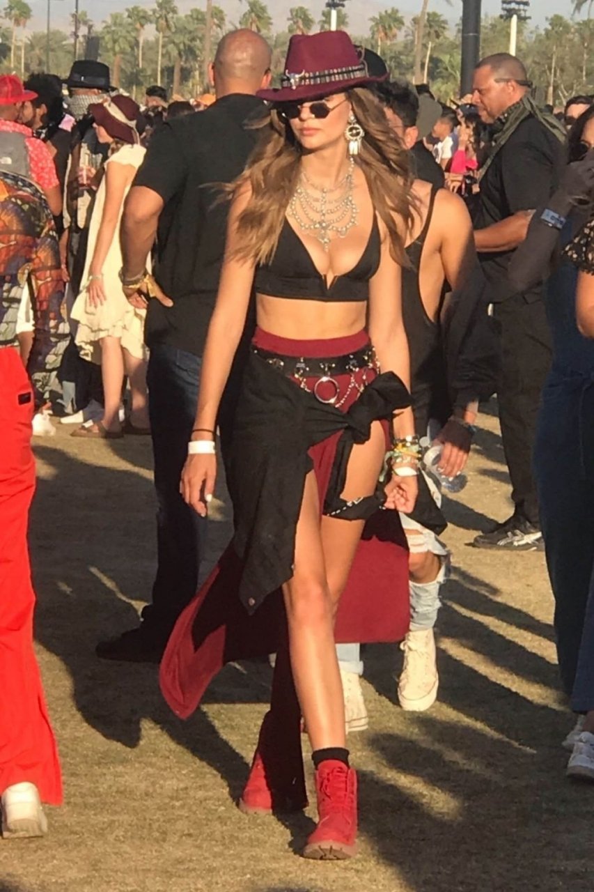Josephine Skriver regarde Bad Bunny et s’arrête pour prendre des photos avec des fans à Indio, 21/04/2019. Le mannequin met en valeur sa silhouette sexy avec un ensemble noir et rouge.
