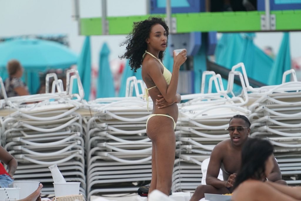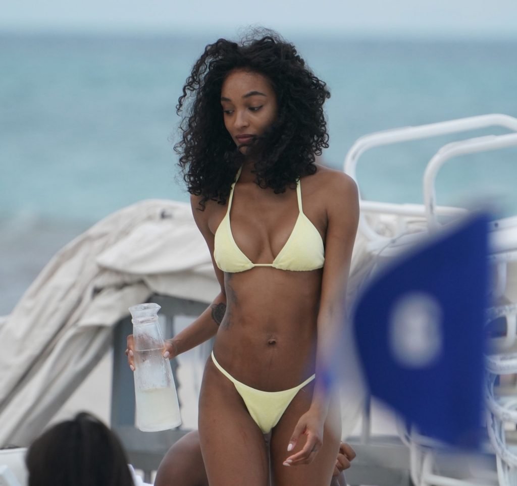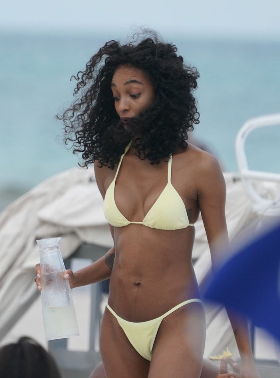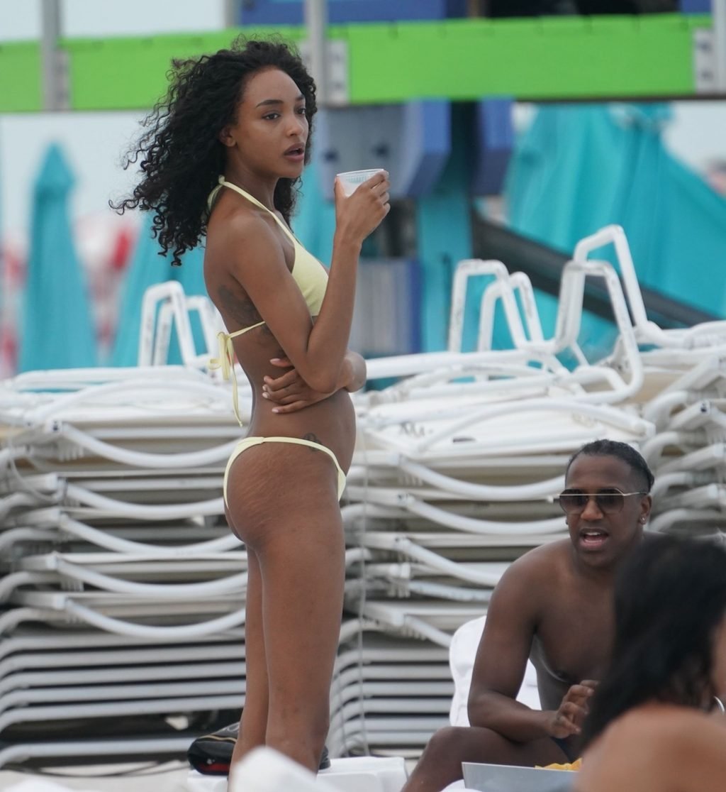 Le mannequin Jourdan Dunn a été vu en bikini jaune avec des amis à la plage de Miami Beach, le 12/05/2019.